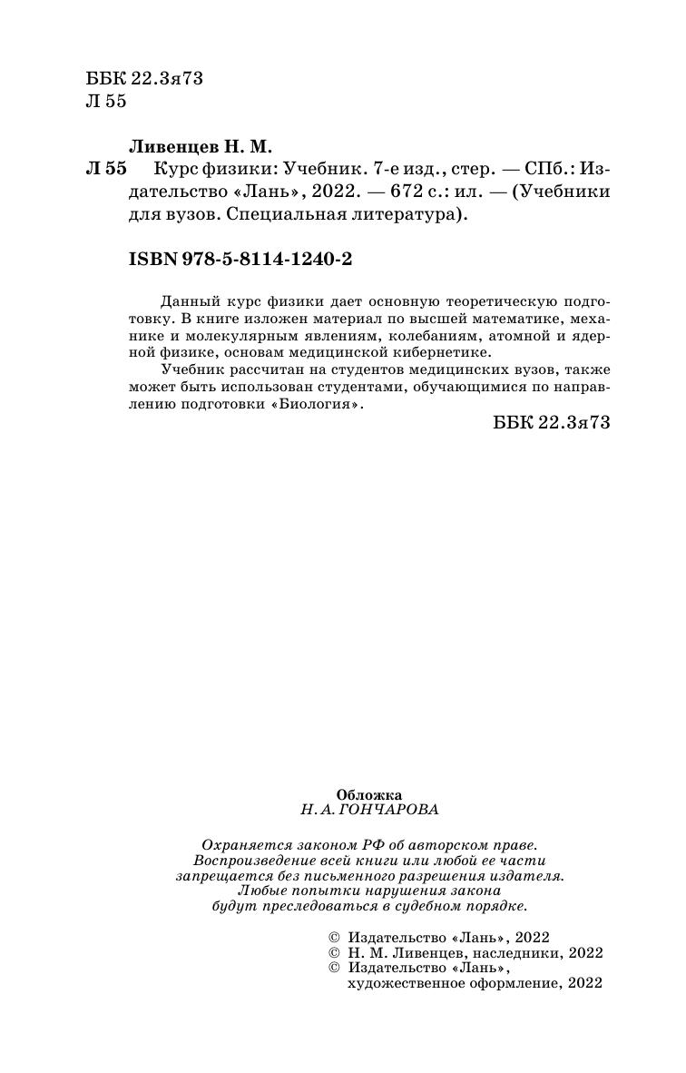 Данный курс физики дает основную теоретическую подготовку. В книге изложен материал по высшей математике, механике и молекулярным явлениям, колебаниям, атомной и ядерной физике, основам медицинской кибернетике. Учебник рассчитан на студентов медицинских вузов, также может быть использован студентами, обучающимися по направлению подготовки «Биология».