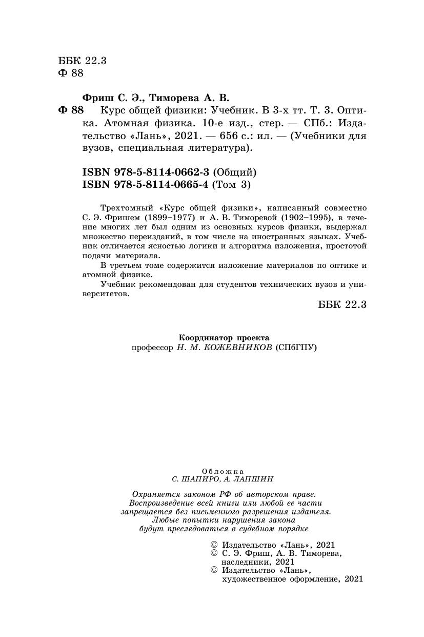 Трехтомный «Курс общей физики», написанный совместно С. Э. Фришем (1899–1977) и А. В. Тиморевой (1902–1995), в течение многих лет был одним из основных курсов физики, выдержал множество переизданий, в том числе на иностранных языках. Учебник отличается ясностью логики и алгоритма изложения, простотой подачи материала. В первом томе рассматриваются физические основы механики, молекулярная физика, теория колебаний и волновая физика. Во втором томе освещаются электрические и электромагнитные явления. В третьем томе содержится изложение материалов по оптике и атомной физике. Учебник рекомендован для студентов технических вузов и университетов.