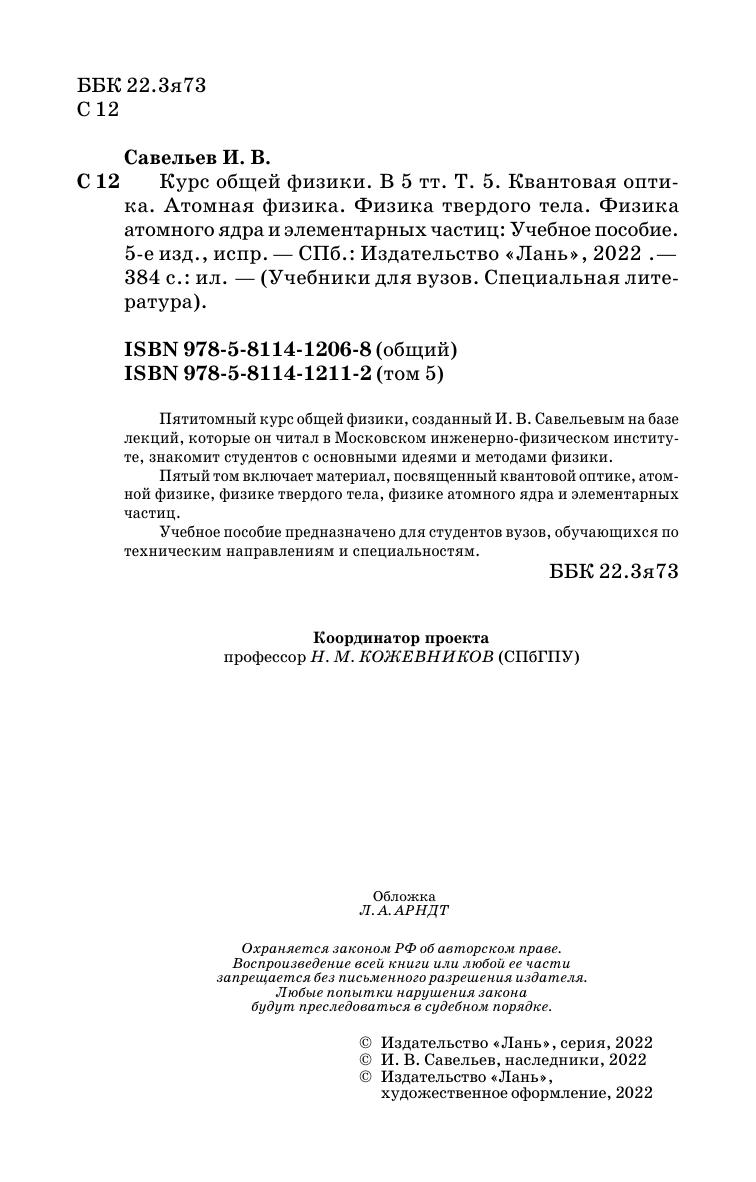 Пятитомный курс общей физики, созданный И. В. Савельевым на базе лекций, которые он читал в Московском инженерно-физическом институте, знакомит студентов с основными идеями и методами физики. Пятый том включает материал, посвященный квантовой оптике, атомной физике, физике твердого тела, физике атомного ядра и элементарных частиц. Учебное пособие предназначено для студентов вузов, обучающихся по техническим направлениям и специальностям.