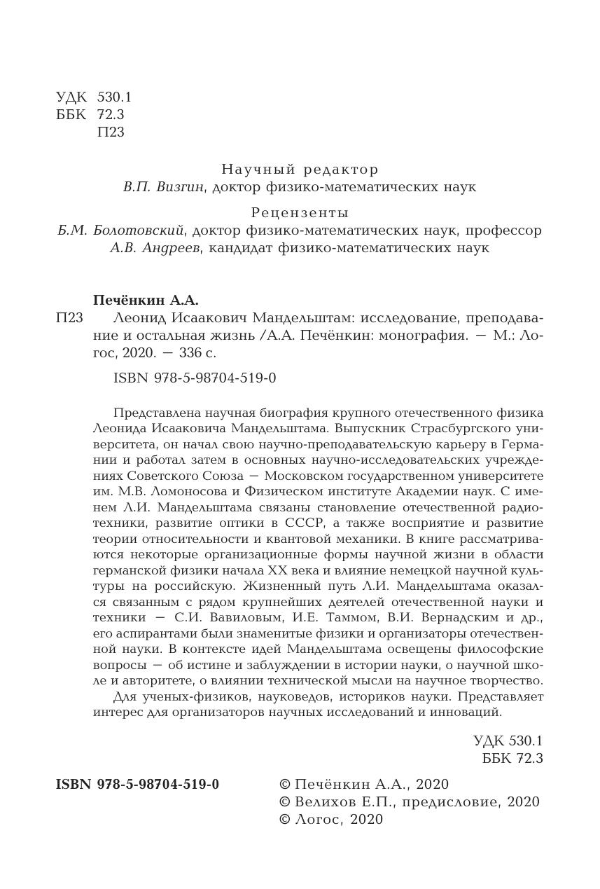 Представлена научная биография крупного отечественного физика Леонида Исааковича Мандельштама. Выпускник Страсбургского университета, он начал свою научно-преподавательскую карьеру в Германии и работал затем в основных научно-исследовательских учреждениях Советского Союза - Московском государственном университете им. М.В. Ломоносова и Физическом институте Академии наук. С именем Л.И. Мандельштама связаны становление отечественной радиотехники, развитие оптики в СССР, а также восприятие и развитие теории относительности и квантовой механики. В книге рассматриваются некоторые организационные формы научной жизни в области германской физики начала XX века и влияние немецкой научной культуры на российскую. Жизненный путь Л.И. Мандельштама оказался связанным с рядом крупнейших деятелей отечественной науки и техники - С.И. Вавиловым, И.Е. Таммом, В.И. Вернадским и др., его аспирантами были знаменитые физики и организаторы отечественной науки. В контексте идей Мандельштама освещены философские вопросы - об истине и заблуждении в истории науки, о научной школе и авторитете, о влиянии технической мысли на научное творчество. Для ученых-физиков, науковедов, историков науки. Представляет интерес для организаторов научных исследований и инноваций.