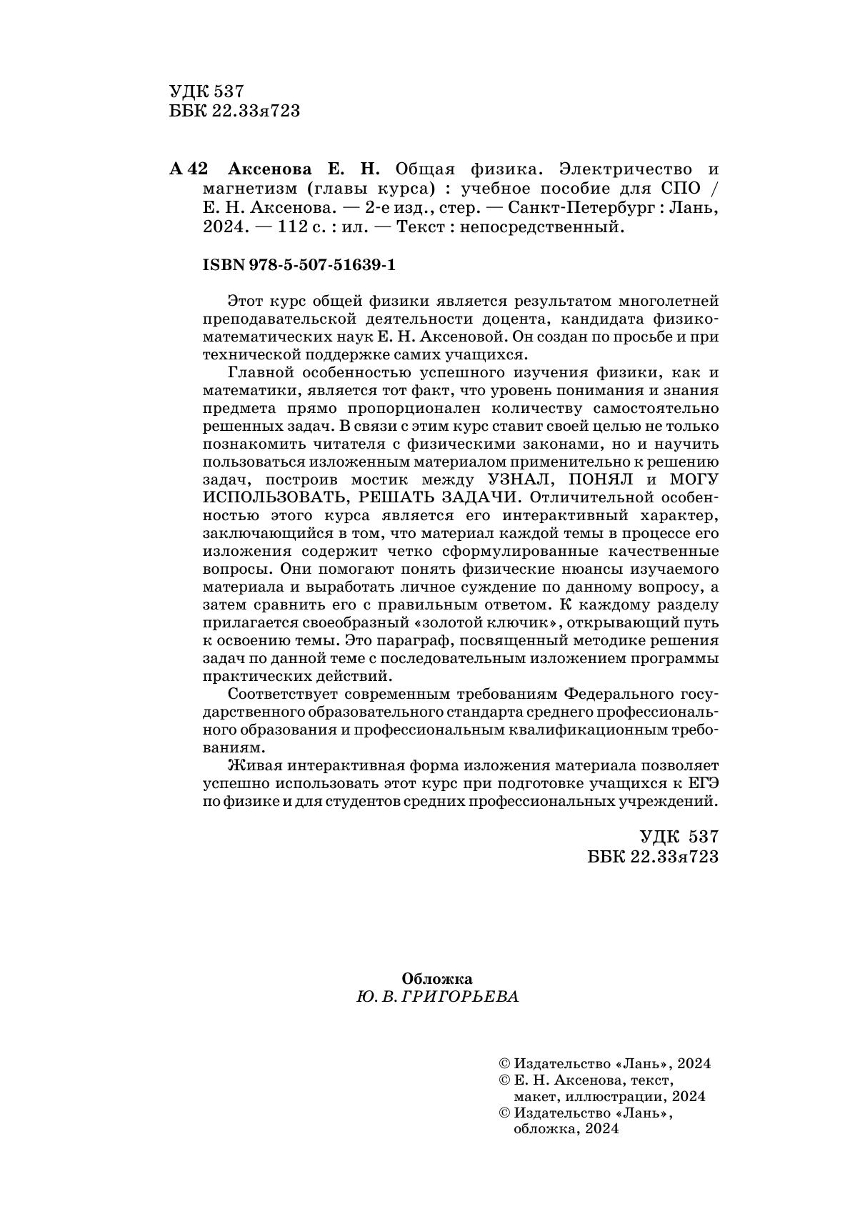 Этот курс общей физики является результатом многолетней преподавательской деятельности доцента, кандидата физико-математических наук Е.Н. Аксеновой. Он создан по просьбе и при технической поддержке самих учащихся. Главной особенностью успешного изучения физики, как и математики, является тот факт, что уровень понимания и знания предмета прямо пропорционален количеству самостоятельно решенных задач. В связи с этим курс ставит своей целью не только познакомить читателя с физическими законами, но и научить пользоваться изложенным материалом применительно к решению задач, построив мостик между УЗНАЛ, ПОНЯЛ и МОГУ ИСПОЛЬЗОВАТЬ, РЕШАТЬ ЗАДАЧИ. Отличительной особен-ностью этого курса является его интерактивный характер, заключающийся в том, что материал каждой темы в процессе его изложения содержит четко сформулированные качественные вопросы. Они помогают понять физические нюансы изучаемого материала и выработать личное суждение по данному вопросу, а затем сравнить его с правильным ответом. К каждому разделу прилагается своеобразный «золотой ключик», открывающий путь к освоению темы. Это параграф, посвященный методике решения задач по данной теме с последовательным изложением программы практических действий. Живая интерактивная форма изложения материала позволяет успешно использовать этот курс при подготовке учащихся к ЕГЭ по физике и для студентов средних профессиональных учреждений. Соответствует современным требованиям Федерального государственного образовательного стандарта среднего профессионального образования и профессиональным квалификационным требованиям.