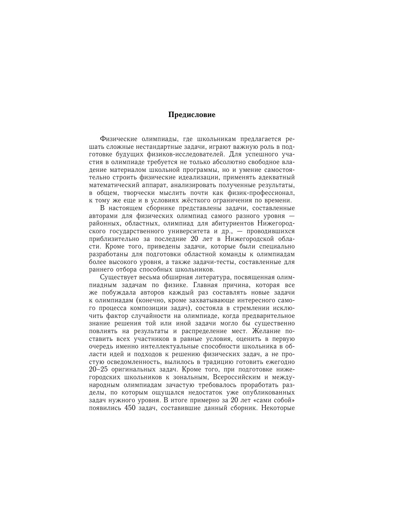 В книге представлены 450 оригинальных задач, составленных авторами для областных, районных и других олимпиад по физике среди школьников Нижегородского региона. Приведены также задачи, специально разработанные для подготовки областной команды к олимпиадам более высокого уровня, и задачи-тесты для раннего отбора способных школьников. Значительная часть задач снабжена весьма подробными решениями, к остальным задачам даны указания и ответы.