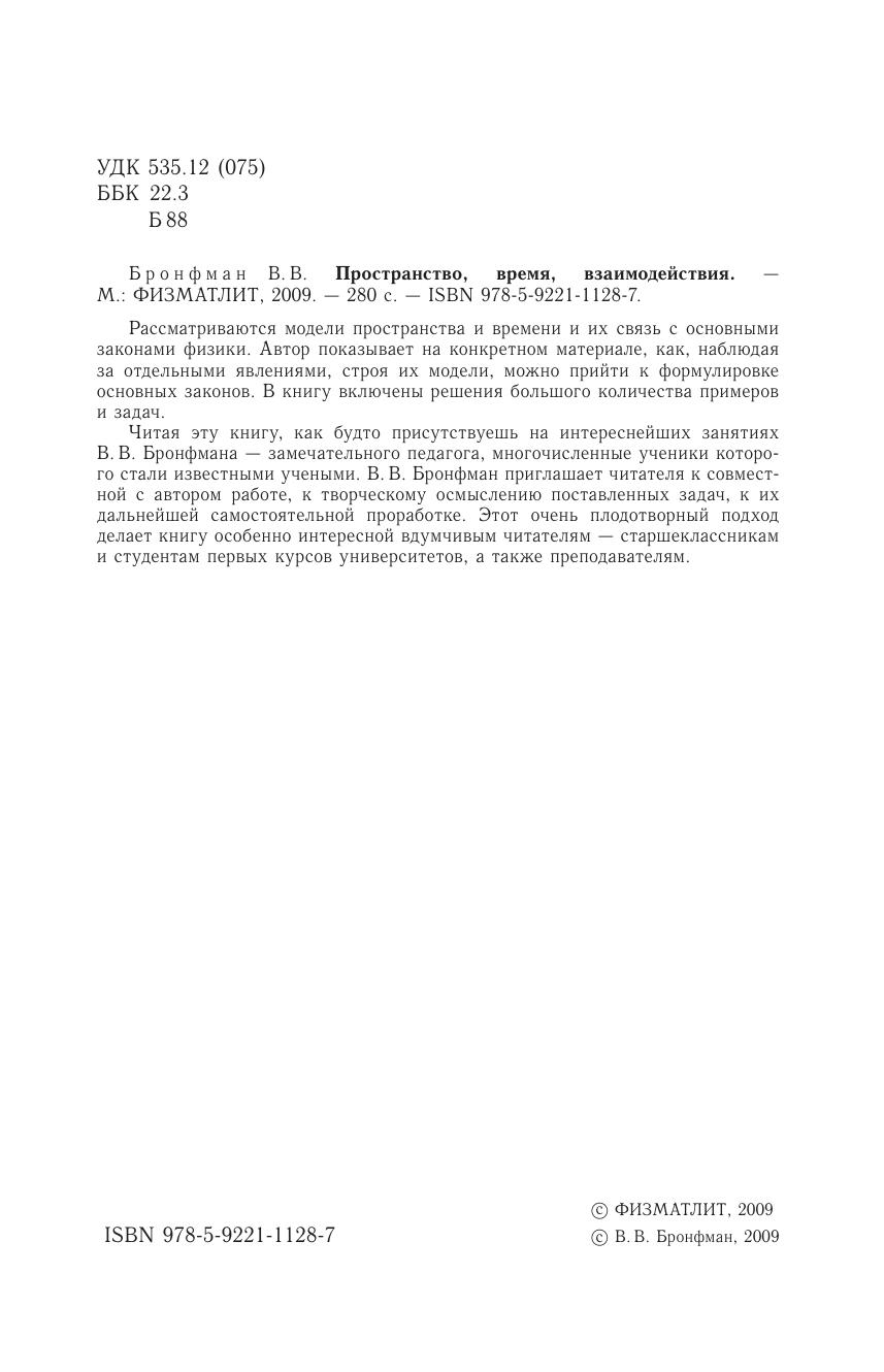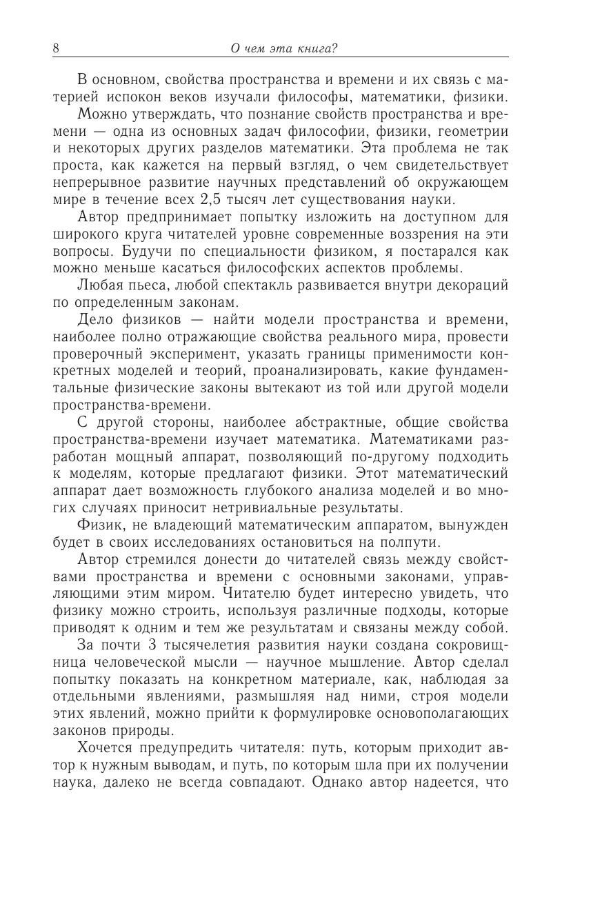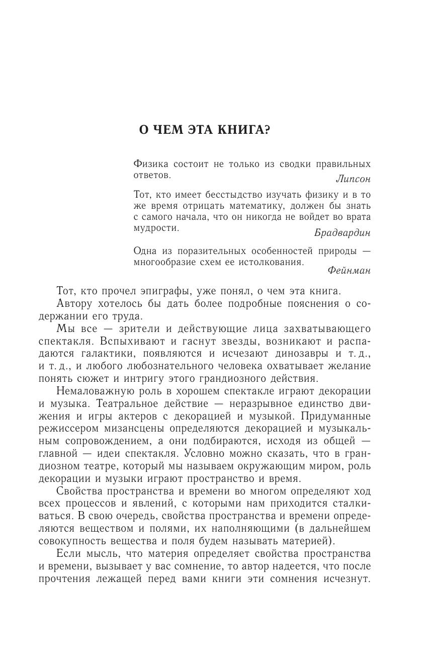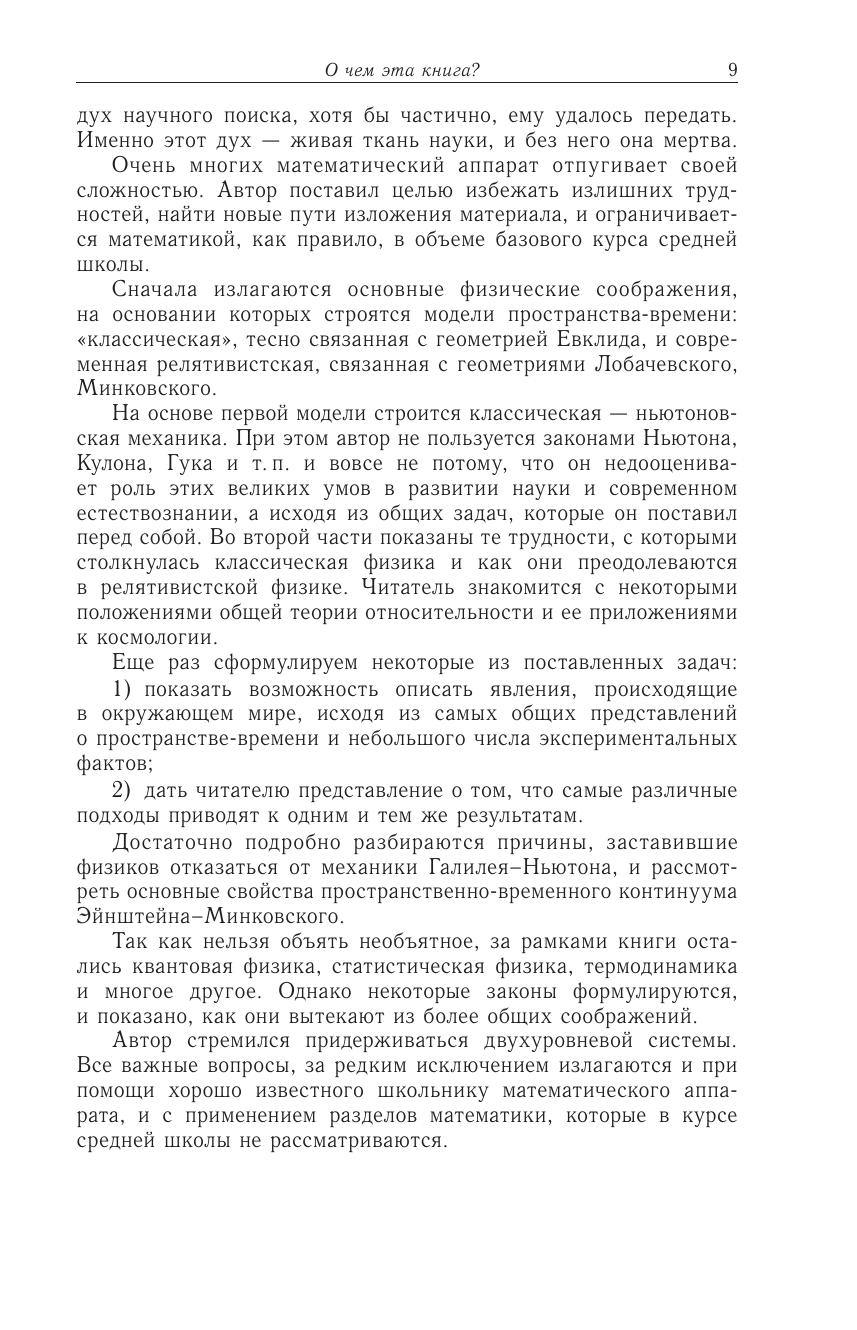 Рассматриваются модели пространства и времени и их связь с основными законами физики. Автор показывает на конкретном материале, как, наблюдая за отдельными явлениями, строя их модели, можно прийти к формулировке основных законов. В книгу включены решения большого количества примеров и задач.Читая эту книгу, как будто присутствуешь на интереснейших занятиях В. В. Бронфмана — замечательного педагога, многочисленные ученики которого стали известными учеными. В. В. Бронфман приглашает читателя к совместной с автором работе, к творческому осмыслению поставленных задач, к их дальнейшей самостоятельной проработке. Этот очень плодотворный подход делает книгу особенно интересной вдумчивым читателям — старшеклассникам и студентам первых курсов университетов, а также преподавателям.