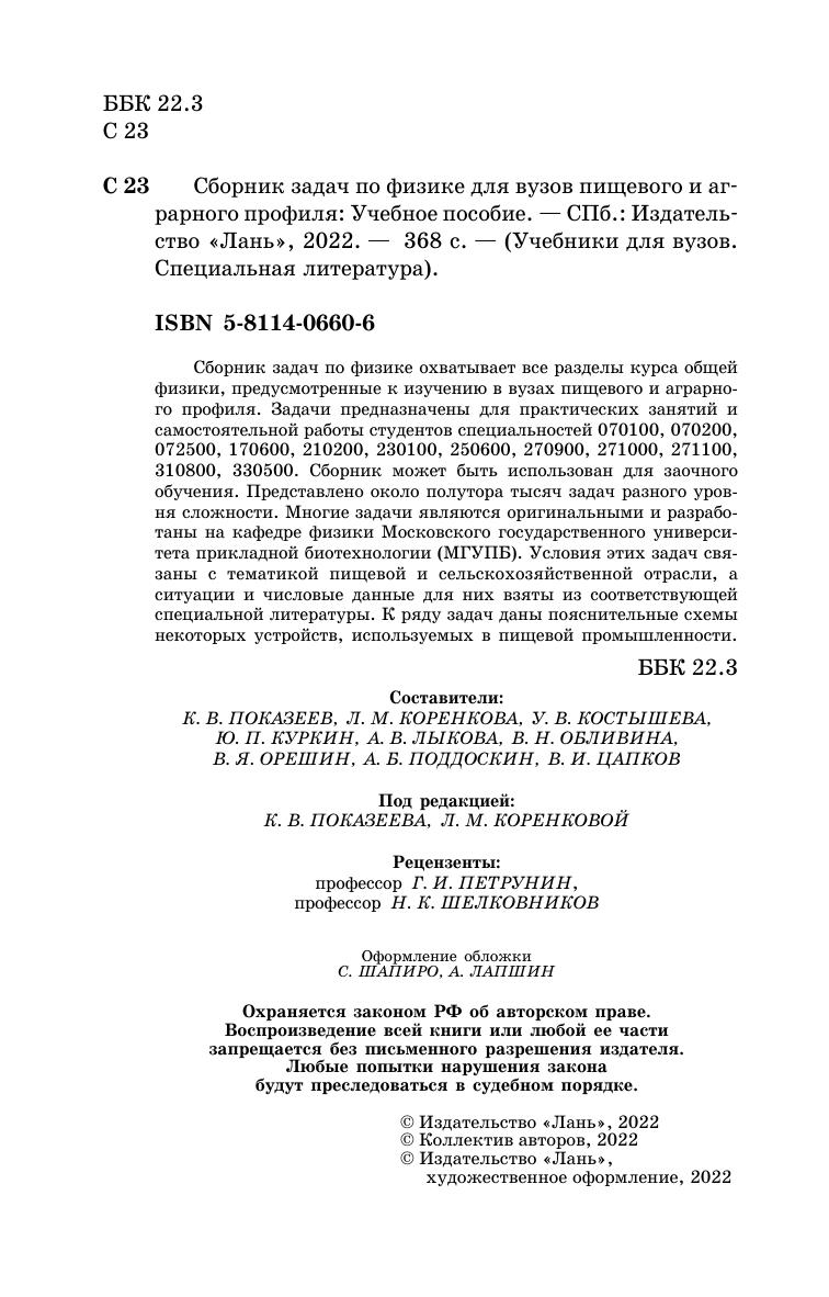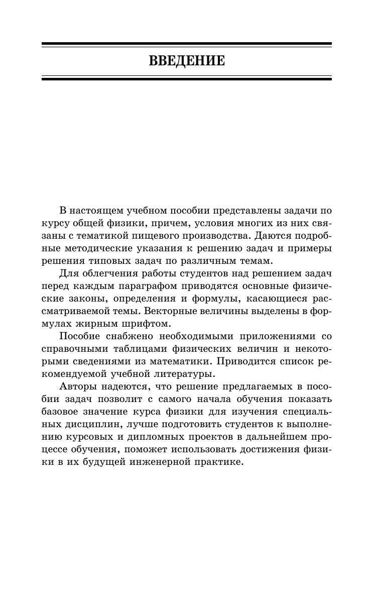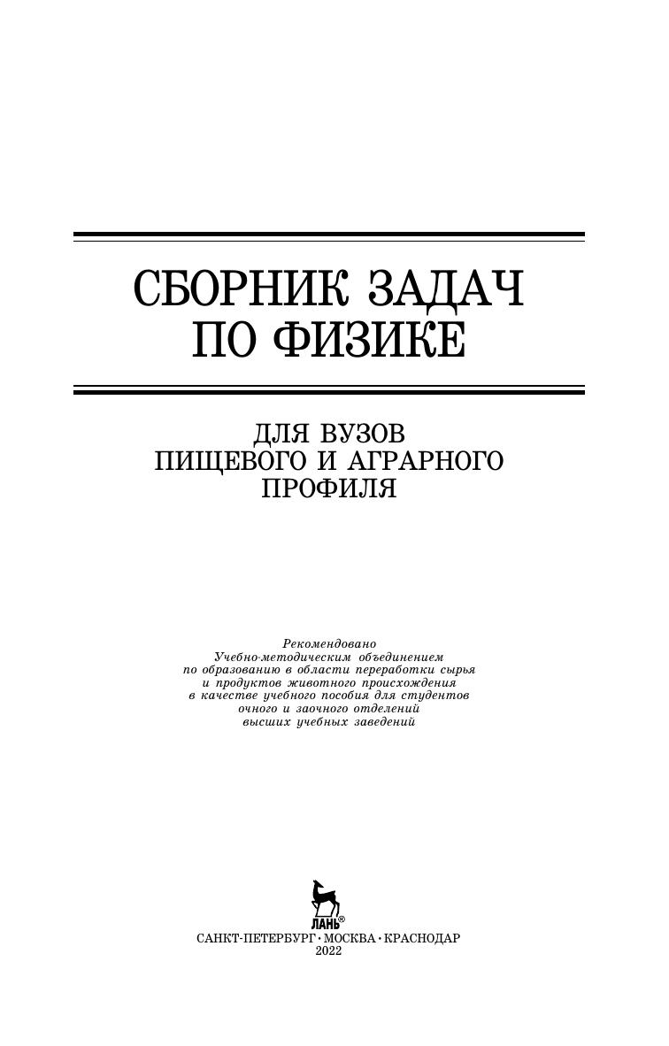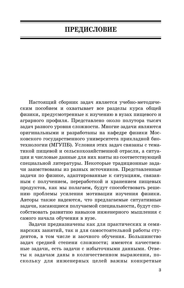 Сборник задач по физике охватывает все разделы курса общей физики, предусмотренные к изучению в вузах пищевого и аграрного профиля. Задачи предназначены для практических занятий и самостоятельной работы студентов специальностей 070100, 070200, 072500, 170600, 210200, 230100, 250600, 270900, 271000, 271100, 310800, 330500. Сборник может быть использован для заочного обучения. Представлено около полутора тысяч задач разного уровня сложности. Многие задачи являются оригинальными и разработаны на кафедре физики Московского государственного университета прикладной биотехнологии (МГУПБ). Условия этих задач связаны с тематикой пищевой и сельскохозяйственной отрасли, а ситуации и числовые данные для них взяты из соответствующей специальной литературы. К ряду задач даны пояснительные схемы некоторых устройств, используемых в пищевой промышленности.