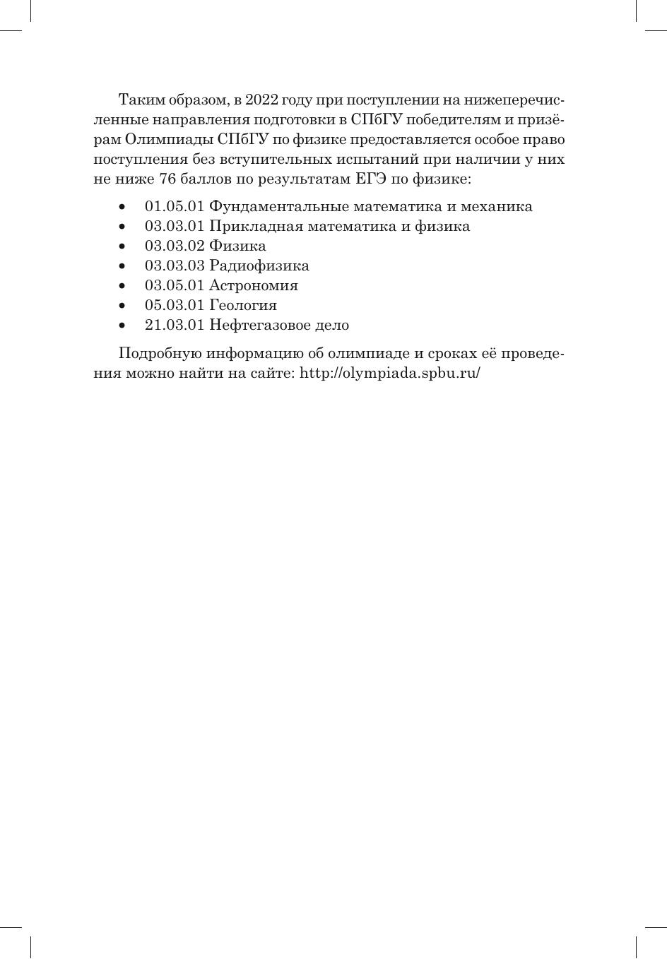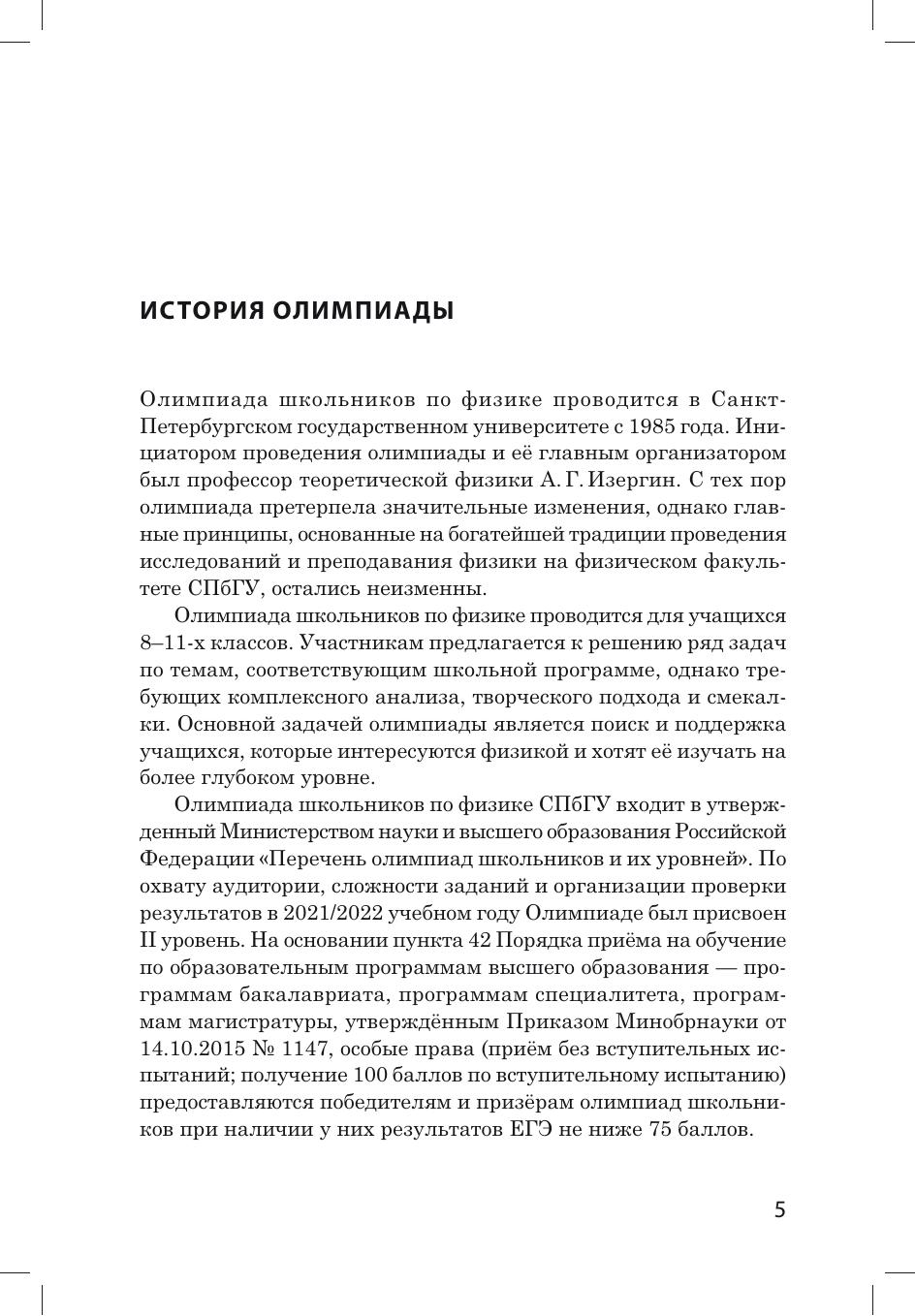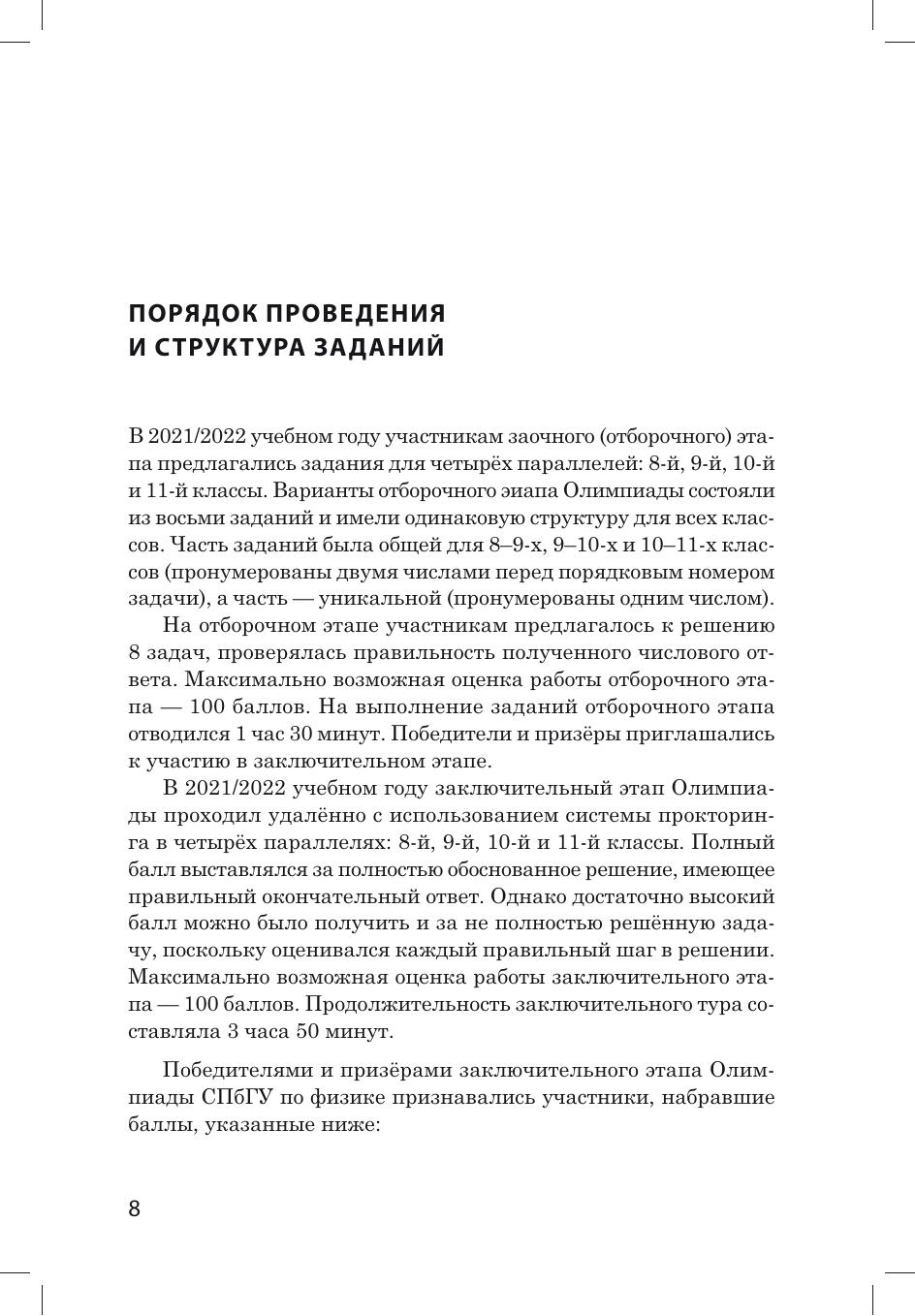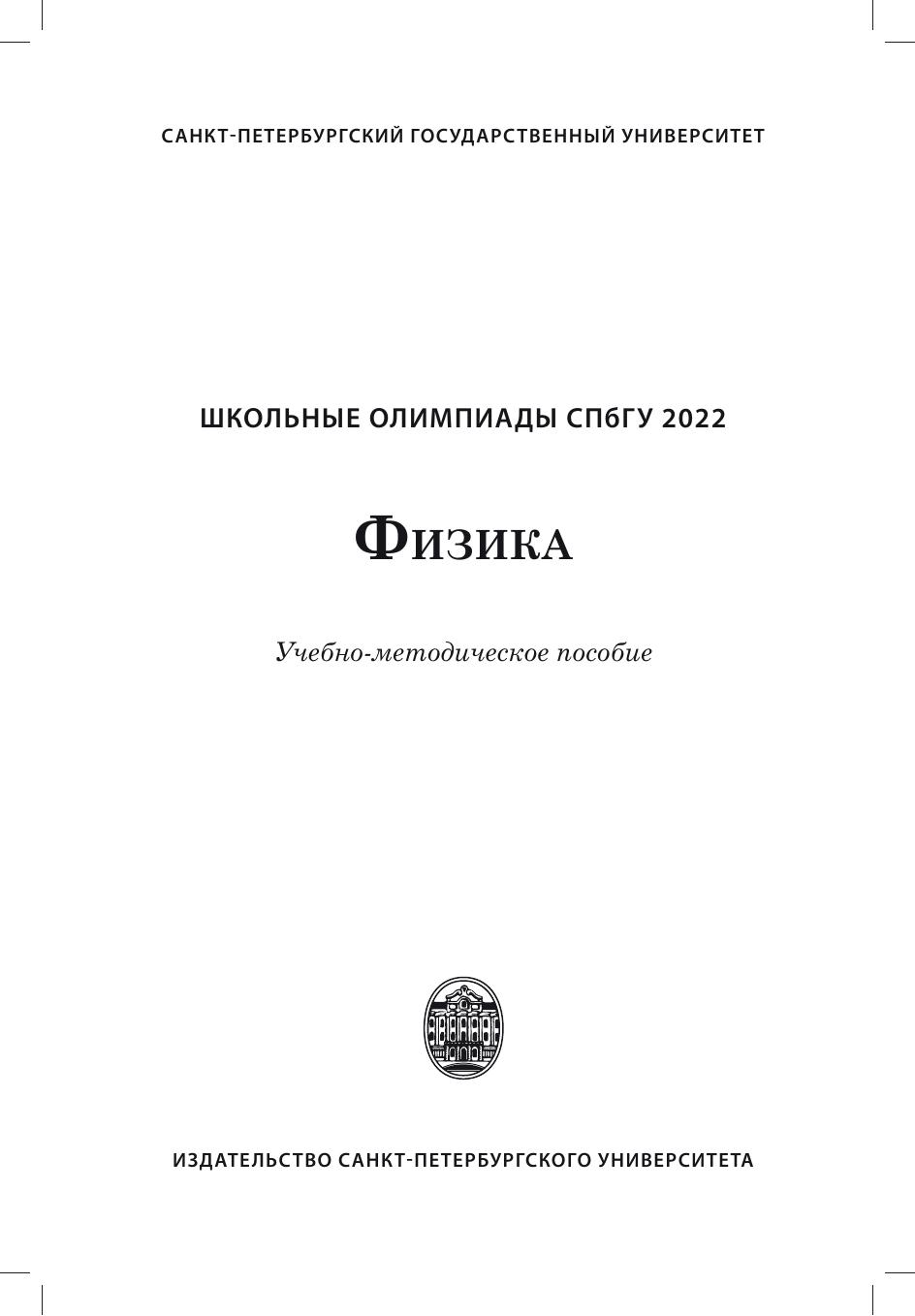 В пособии представлены примеры заданий отборочного и заключительного этапов Олимпиады школьников Санкт-Петербургского государственного университета по физике для учащихся 8-11 классов за 2021/2022 учебный год. Все задачи сопровождаются подробными решениями. Приведенные в сборнике задачи могут использоваться в качестве домашних заданий в школах с углубленным изучением физики. Издание предназначено для подготовки к участию в Олимпиадах школьников СПбГУ.