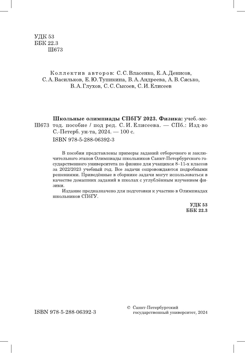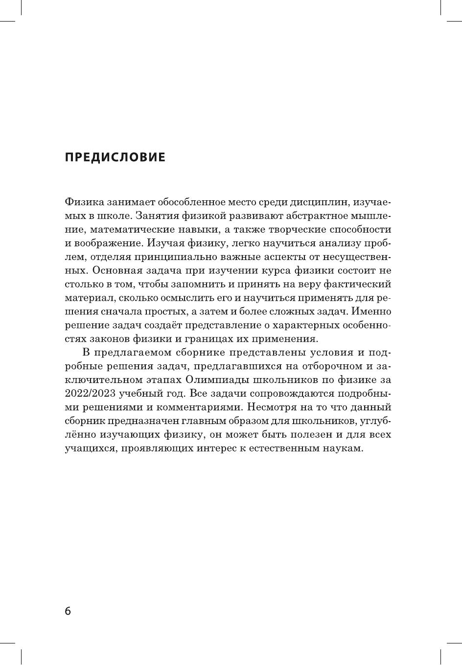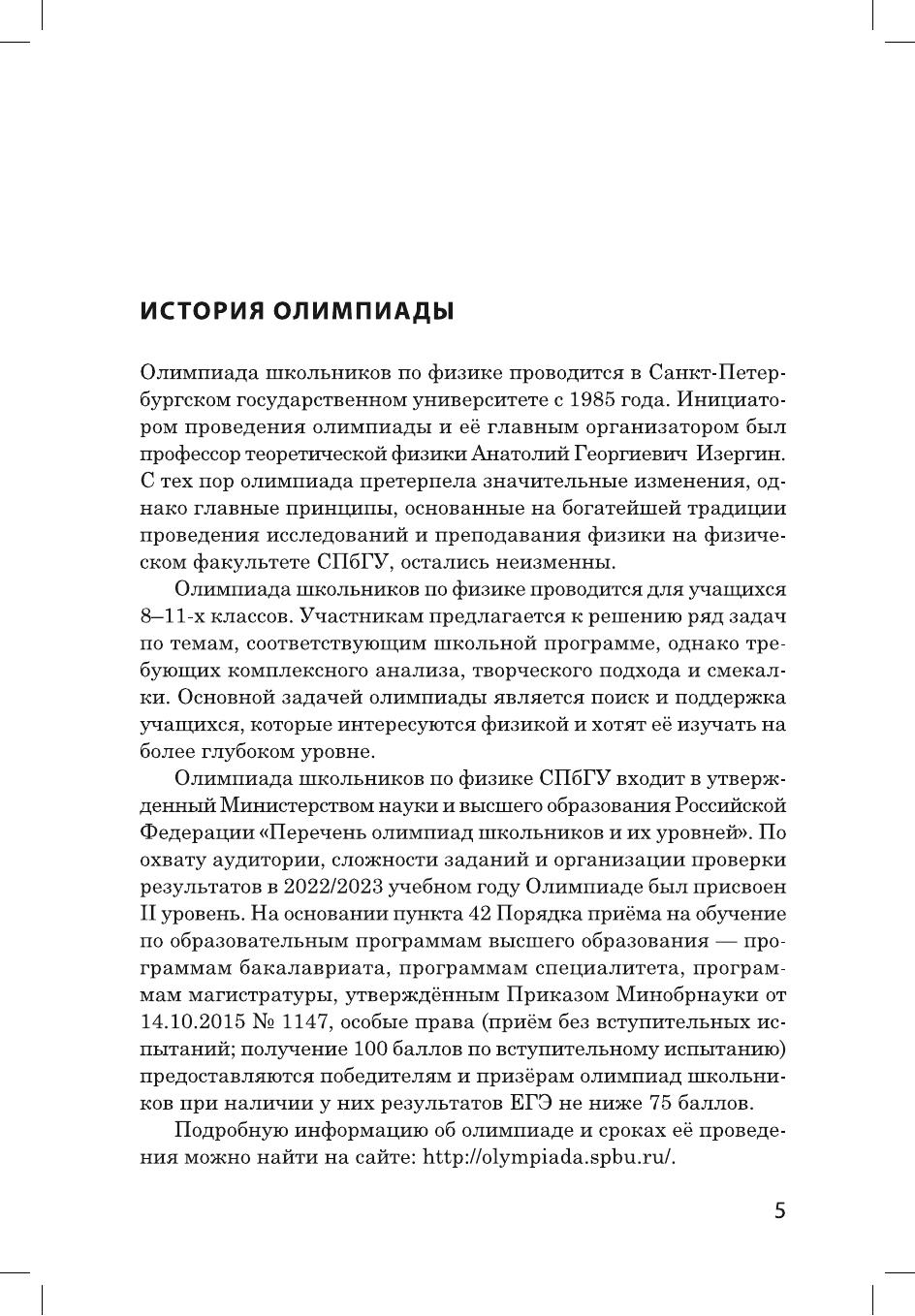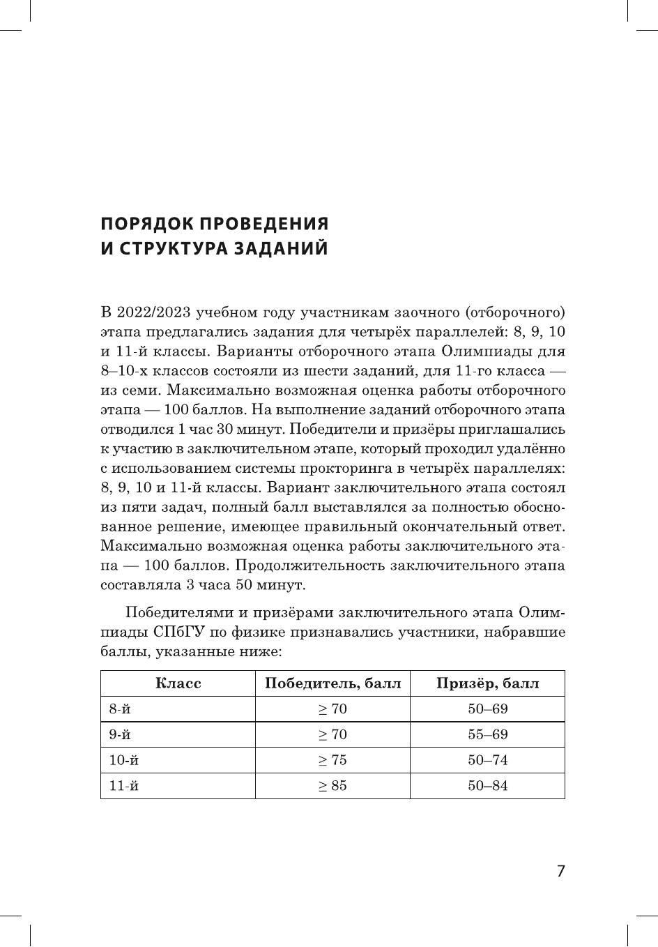 В пособии представлены примеры заданий отборочного и заключительного этапов Олимпиады школьников Санкт-Петербургского государственного университета по физике для учащихся 8-11-х классов за 2022/2023 учебный год. Все задачи сопровождаются подробными решениями. Приведенные в сборнике задачи могут использоваться в качестве домашних заданий в школах с углубленным изучением физики. Издание предназначено для подготовки к участию в Олимпиадах школьников СПбГУ.