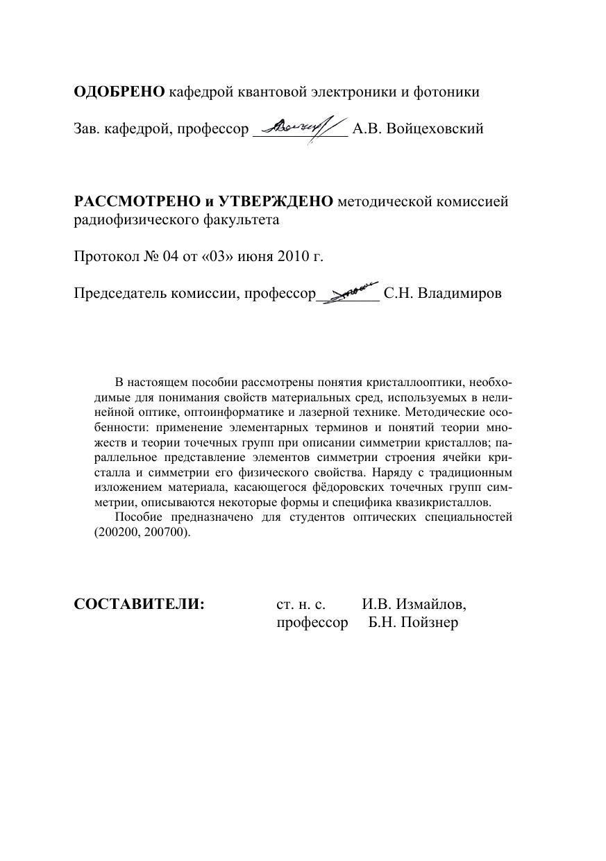 В настоящем пособии рассмотрены понятия кристаллооптики, необходимые для понимания свойств материальных сред, используемых в нелинейной оптике, оптоинформатике и лазерной технике. Методические особенности: применение элементарных терминов и понятий теории множеств и теории точечных групп при описании симметрии кристаллов, параллельное представление элементов симметрии строения ячейки кристалла и симметрии его физического свойства. Наряду с традиционным изложением материала, касающегося фёдоровских точечных групп симметрии, описываются некоторые формы и специфика квазикристаллов. Пособие предназначено для студентов оптических специальностей (200200, 200700).