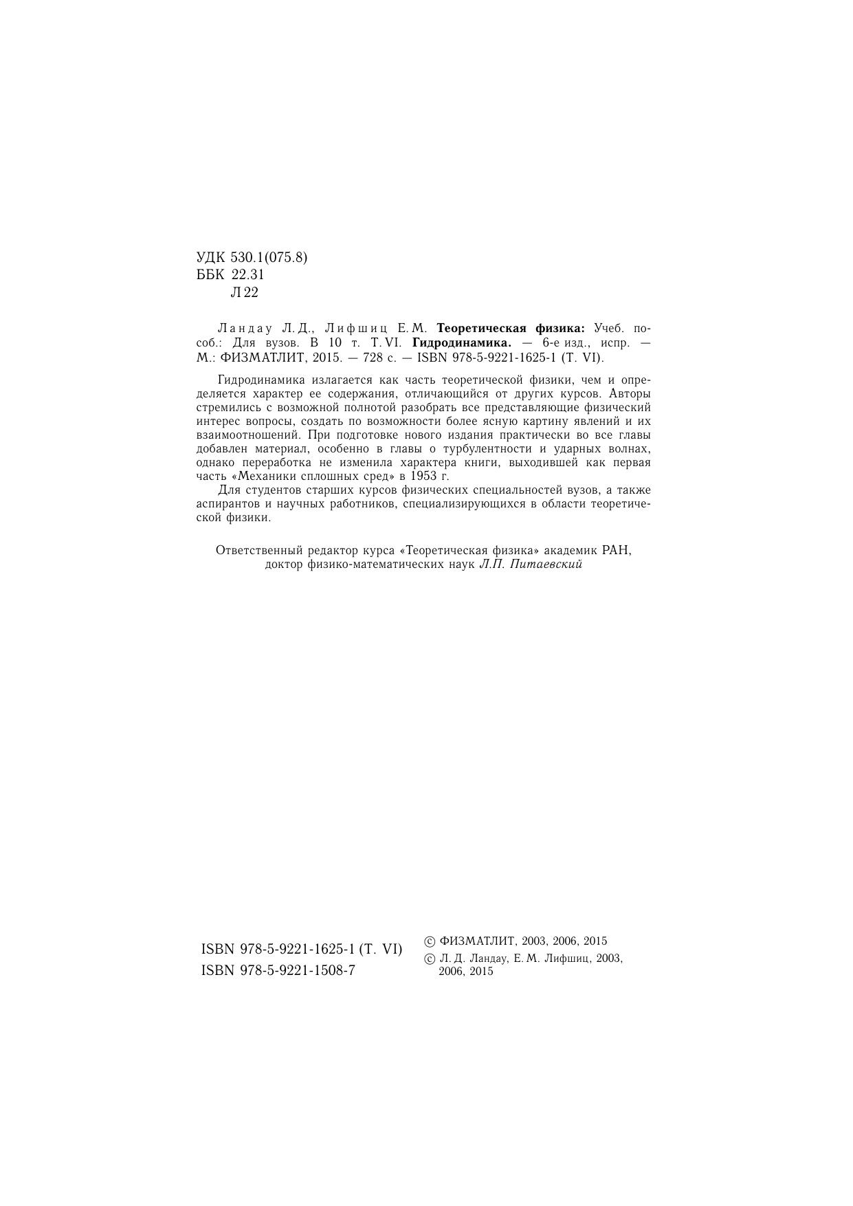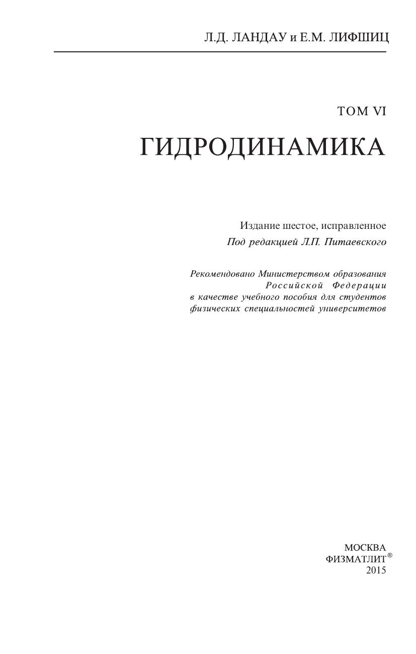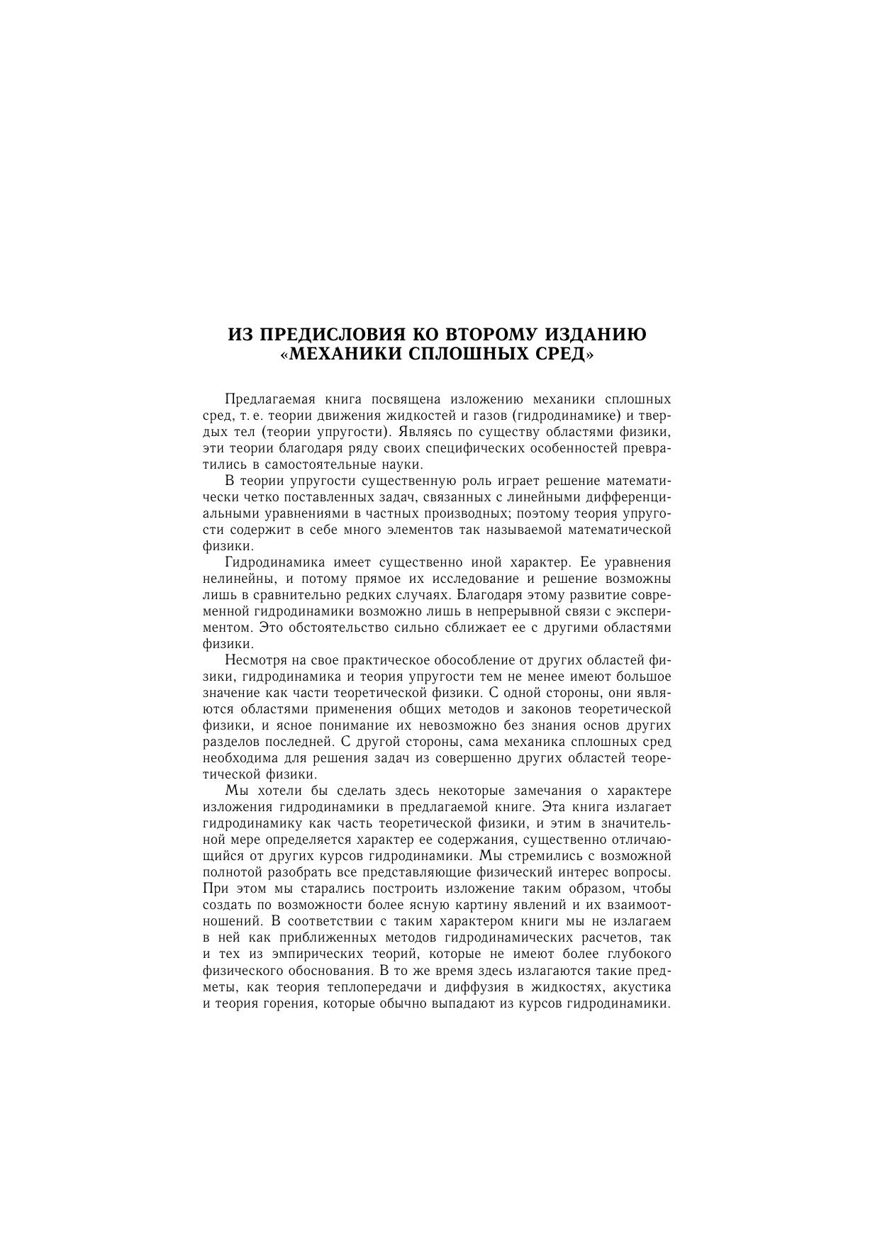 Гидродинамика излагается как часть теоретической физики, чем и определяется характер ее содержания, отличающийся от других курсов. Авторы стремились с возможной полнотой разобрать все представляющие физический интерес вопросы, создавать по возможности более ясную картину явлений и их взаимоотношений. При подготовке нового издания практически во все главы добавлен новый материал, особенно в главы о турбулентности и ударных волнах, однако переработка не изменила характера книги, выходивший как первая часть "Механики сплошных сред" в 1953 г.