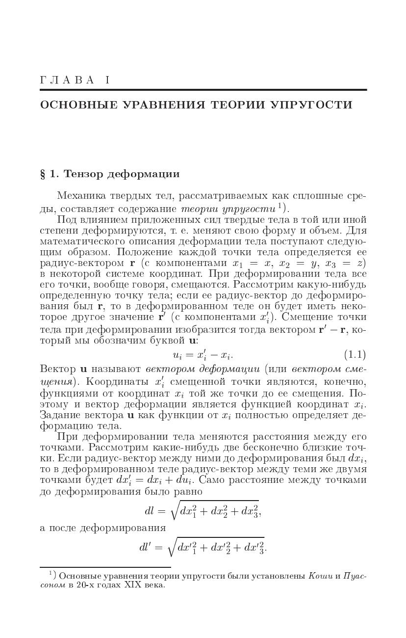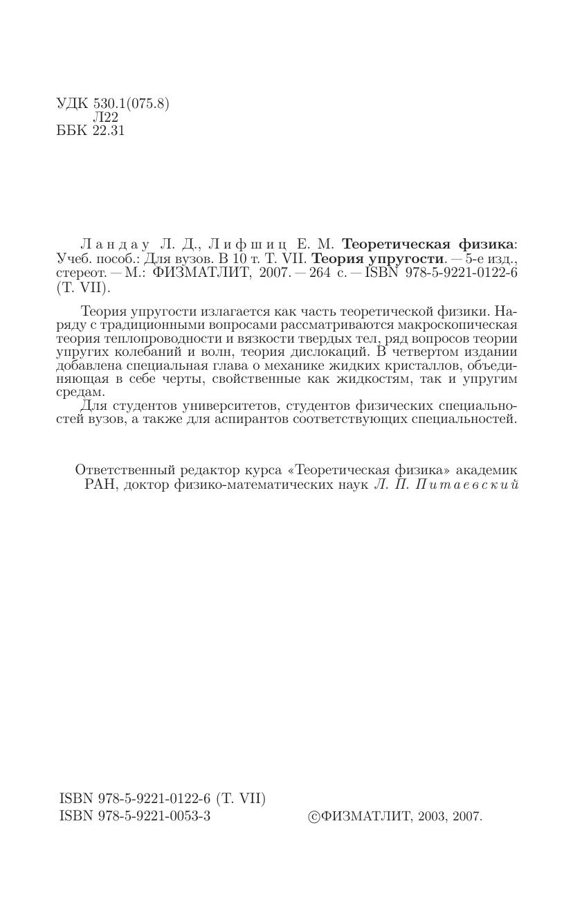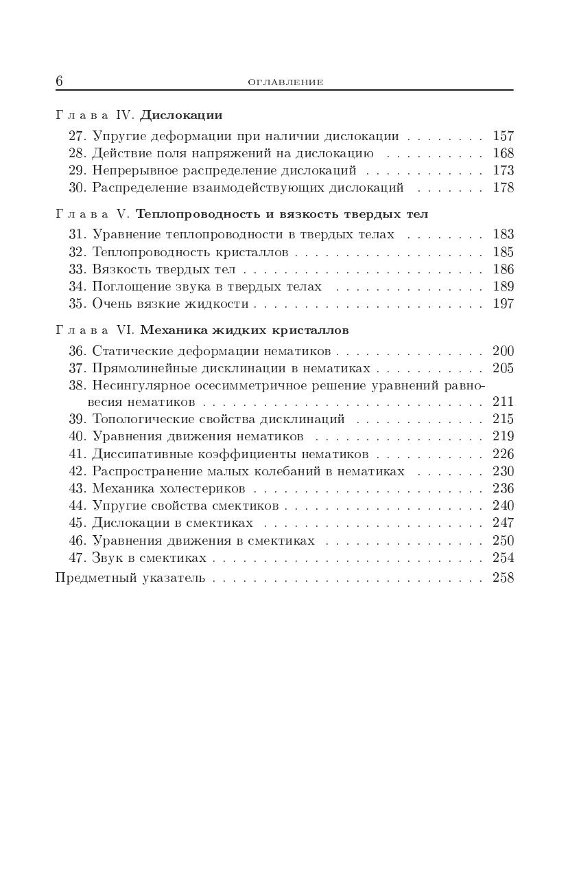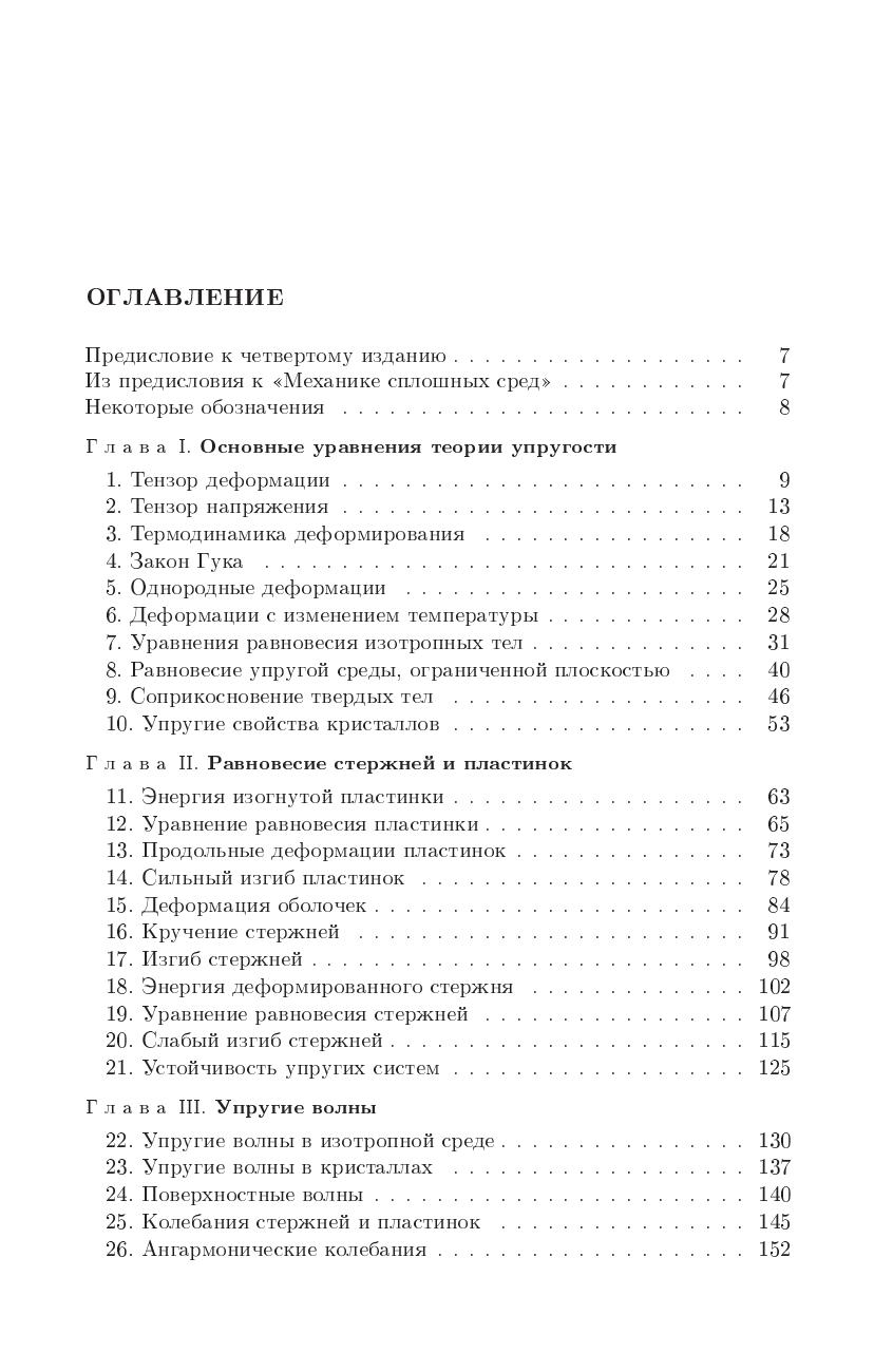 Теория упругости излагается как часть теоретической физики. Наряду с традиционными вопросами рассматриваются макроскопическая теория теплопроводности и вязкости твердых тел, ряд вопросов теории упругих колебаний и волн, теория дислокаций. В четвертом издании добавлена специальная глава о механике жидких кристаллов, объединяющая в себе черты, свойственные как жидкостям, так и упругим средам.