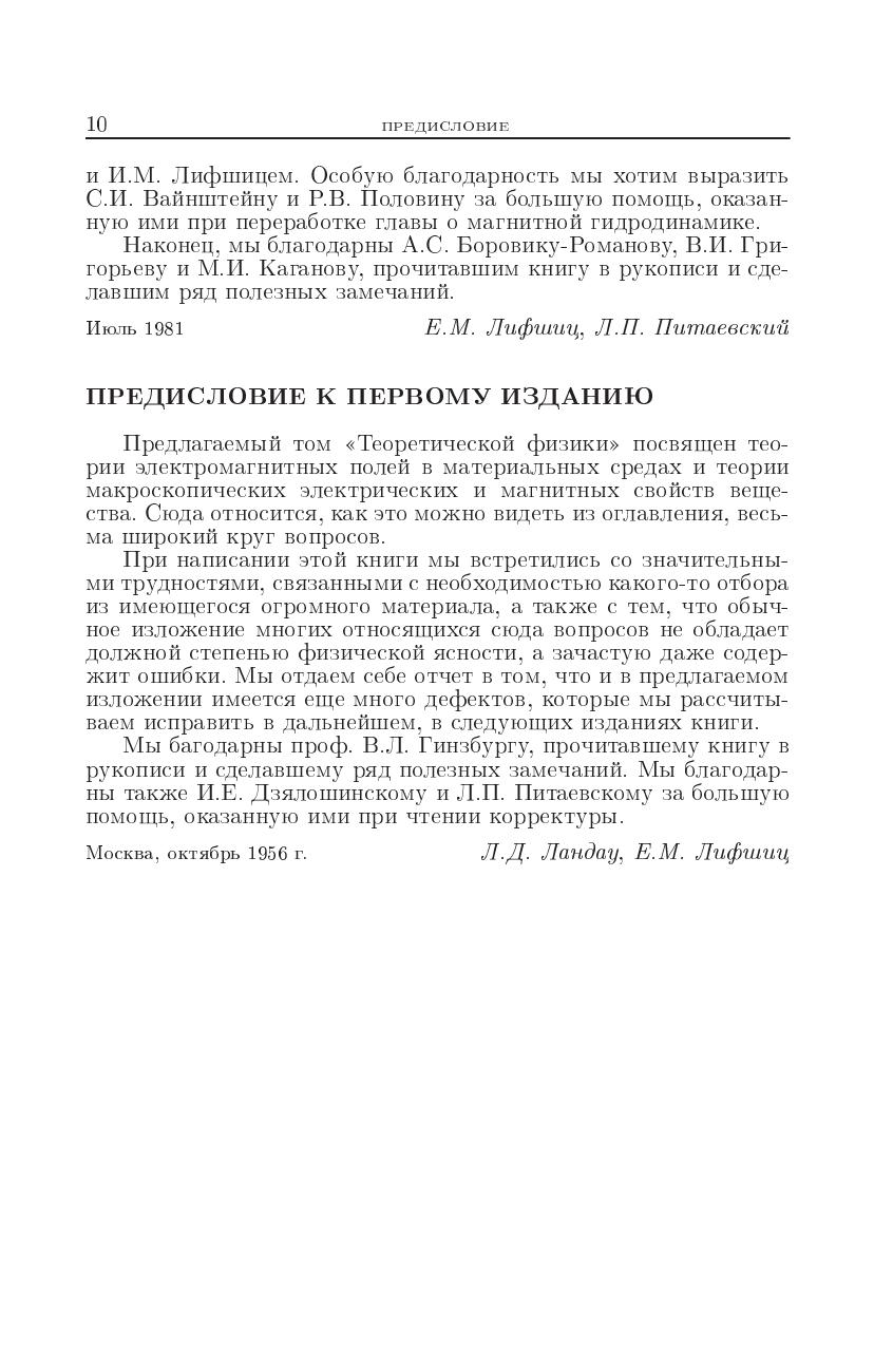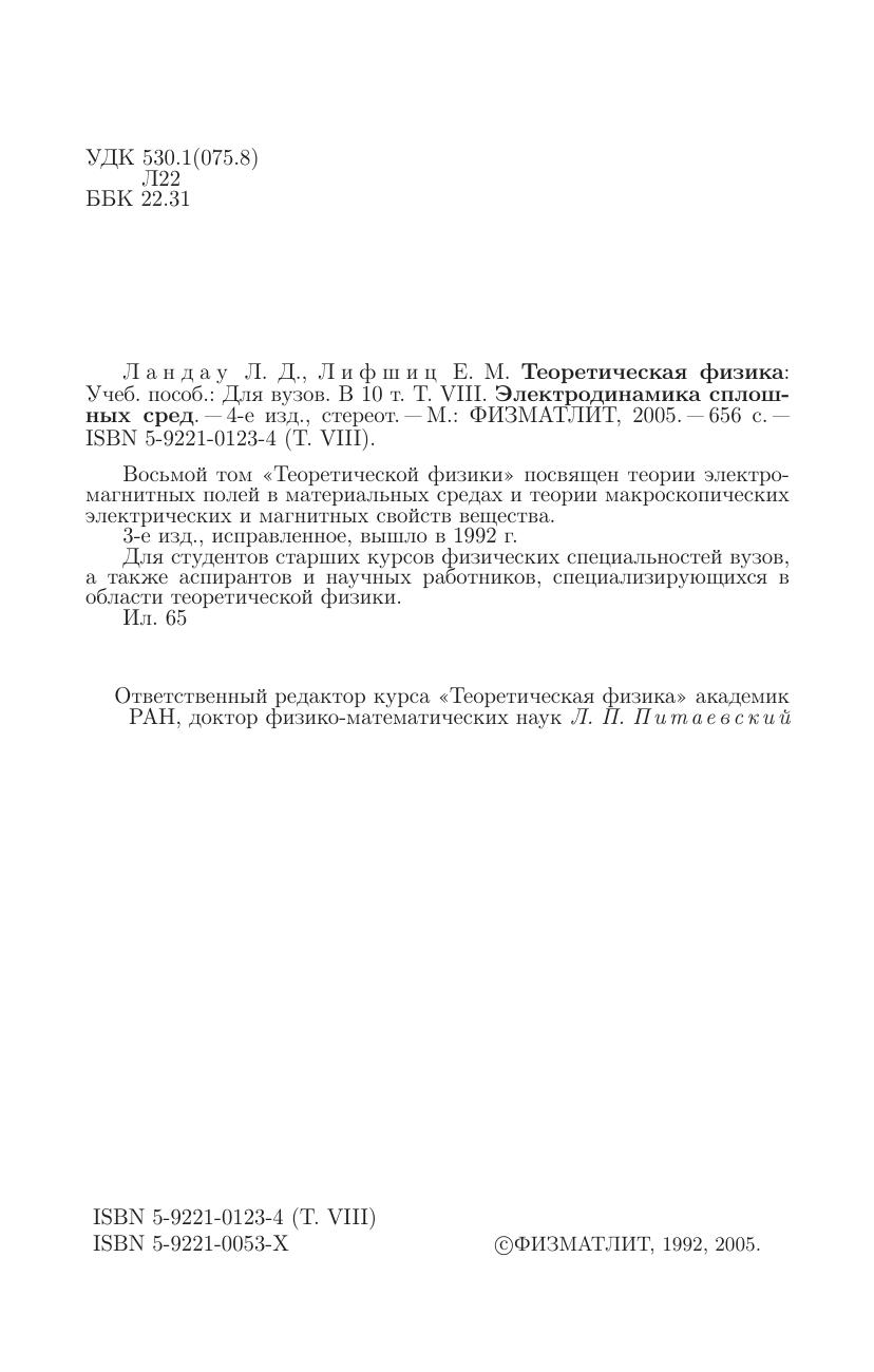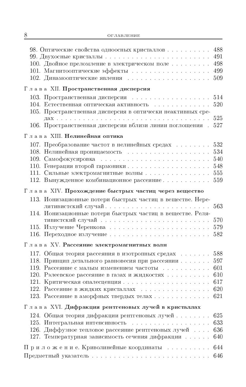 Восьмой том «Теоретической физики» посвящен теории электромагнитных полей в материальных средах и теории макроскопических электрических и магнитных свойств вещества. 3-е изд., исправленное, вышло в 1992 г.