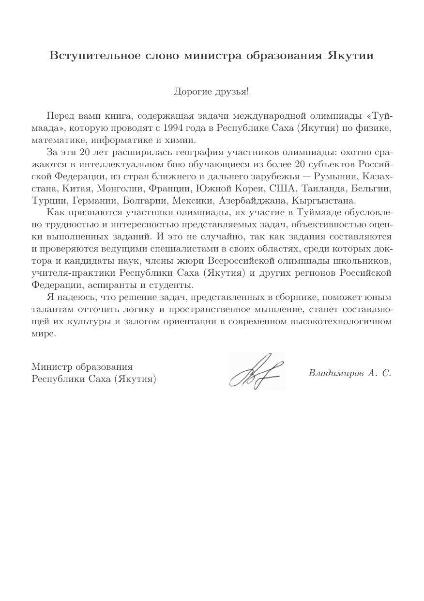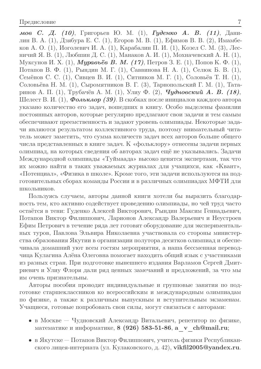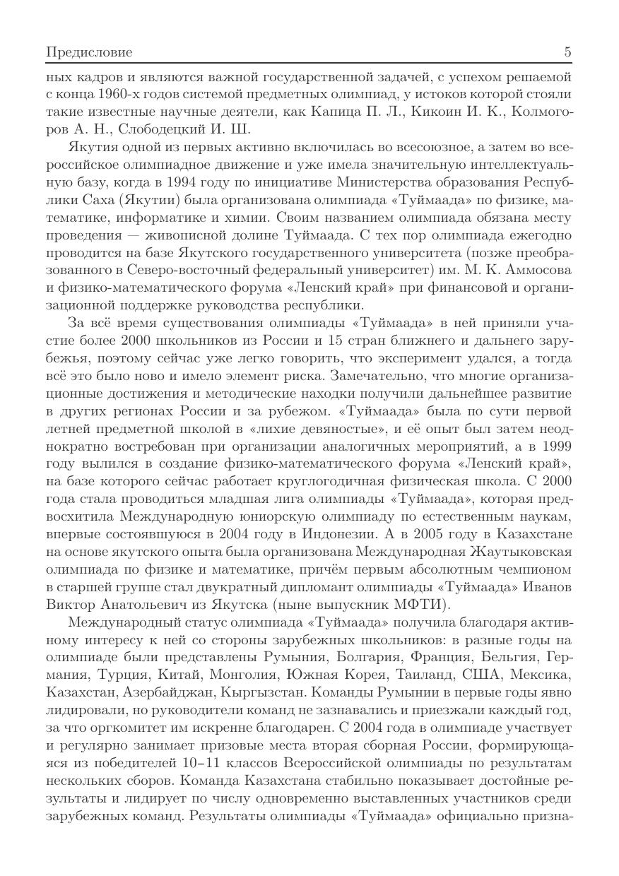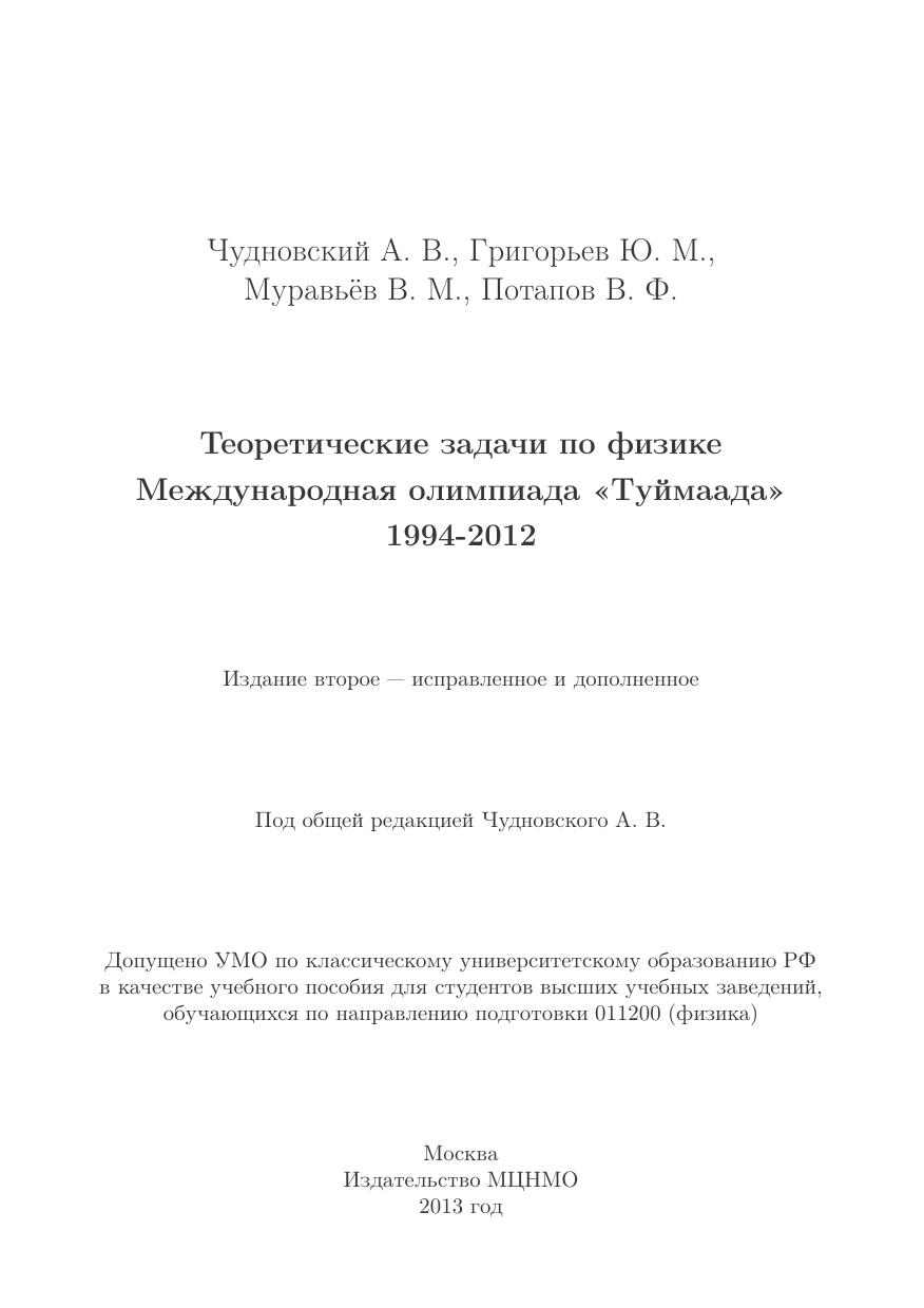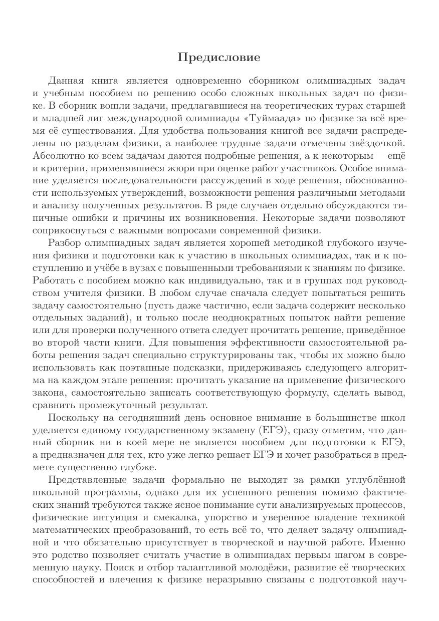 Данная книга является одновременно сборником олимпиадных задач и учебным пособием по решению особо сложных школьных задач по физике. В сборник вошли задачи, предлагавшиеся на теоретических турах старшей и младшей лиг международной олимпиады «Туймаада» по физике за всё время её существования. Для удобства пользования книгой все задачи распределены по разделам физики, а наиболее трудные задачи отмечены звёздочкой. Абсолютно ко всем задачам даются подробные решения, а к некоторым — ещё и критерии, применявшиеся жюри при оценке работ участников. Особое внимание уделяется последовательности рассуждений в ходе решения, обоснованности используемых утверждений, возможности решения различными методами и анализу полученных результатов. В ряде случаев отдельно обсуждаются типичные ошибки и причины их возникновения. Некоторые задачи позволяют соприкоснуться с важными вопросами современной физики. Первое издание книги вышло в 2007 году под названием «Олимпиадные задачи по физике. Международная олимпиада «Туймаада»» (авторы Григорьев Ю. М., Муравьёв В. М., Потапов В. Ф.). Второе издание книги рекомендовано в 2012 году учебно-методическим советом и учёным советом ФГАОУ ВПО «Северо-восточный федеральный университет им. М. К. Аммосова».