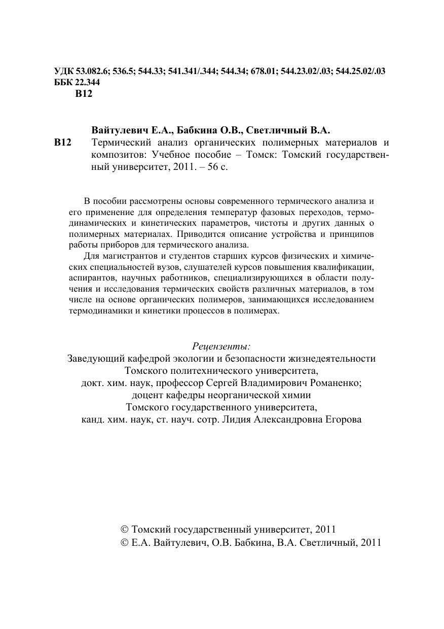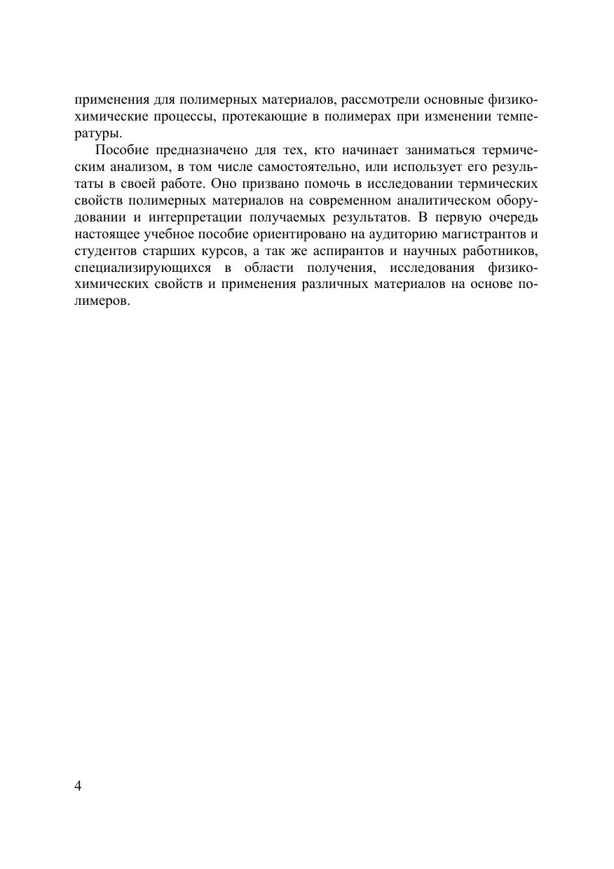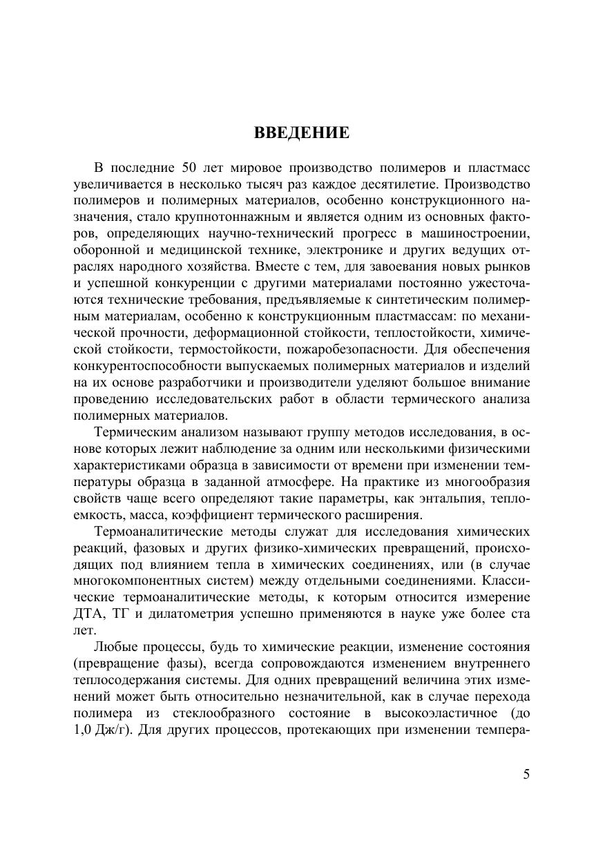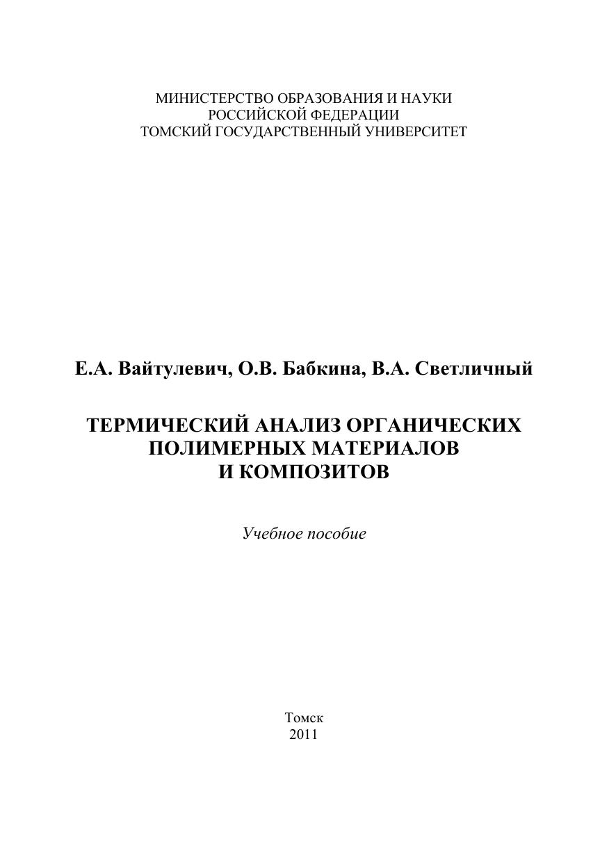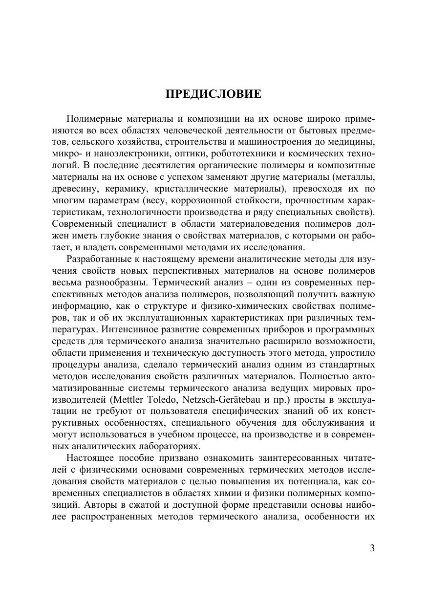 В пособии рассмотрены основы современного термического анализа и его применение для определения температур фазовых переходов, термодинамических и кинетических параметров, чистоты и других данных о полимерных материалах. Приводится описание устройства и принципов работы приборов для термического анализа. Для магистрантов и студентов старших курсов физических и химических специальностей вузов, слушателей курсов повышения квалификации, аспирантов, научных работников, специализирующихся в области получения и исследования термических свойств различных материалов, в том числе на основе органических полимеров, занимающихся исследованием термодинамики и кинетики процессов в полимерах.
