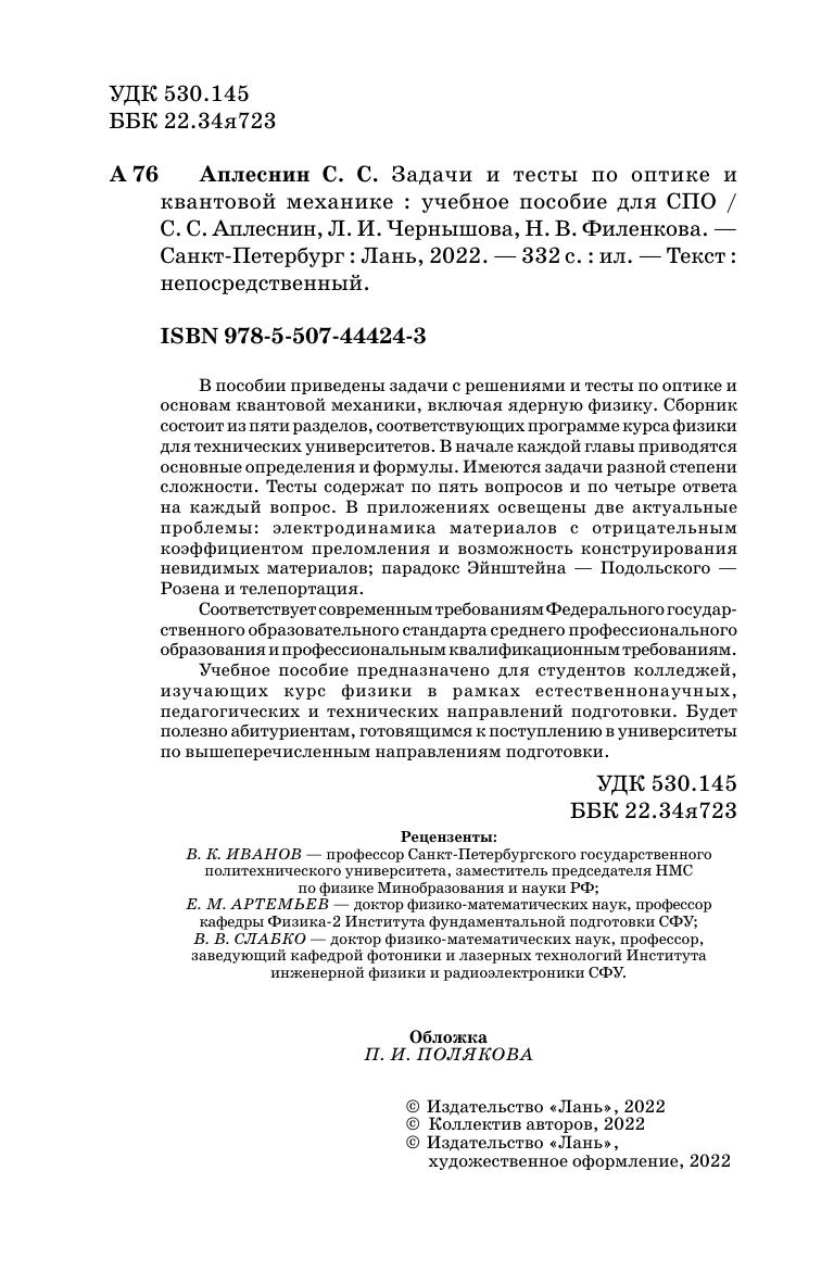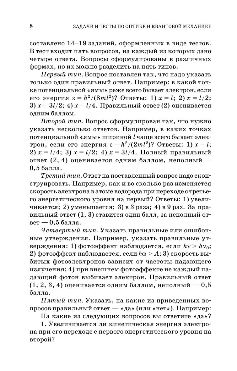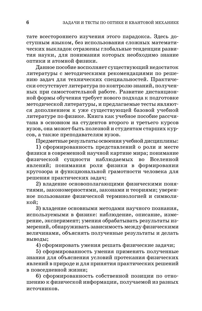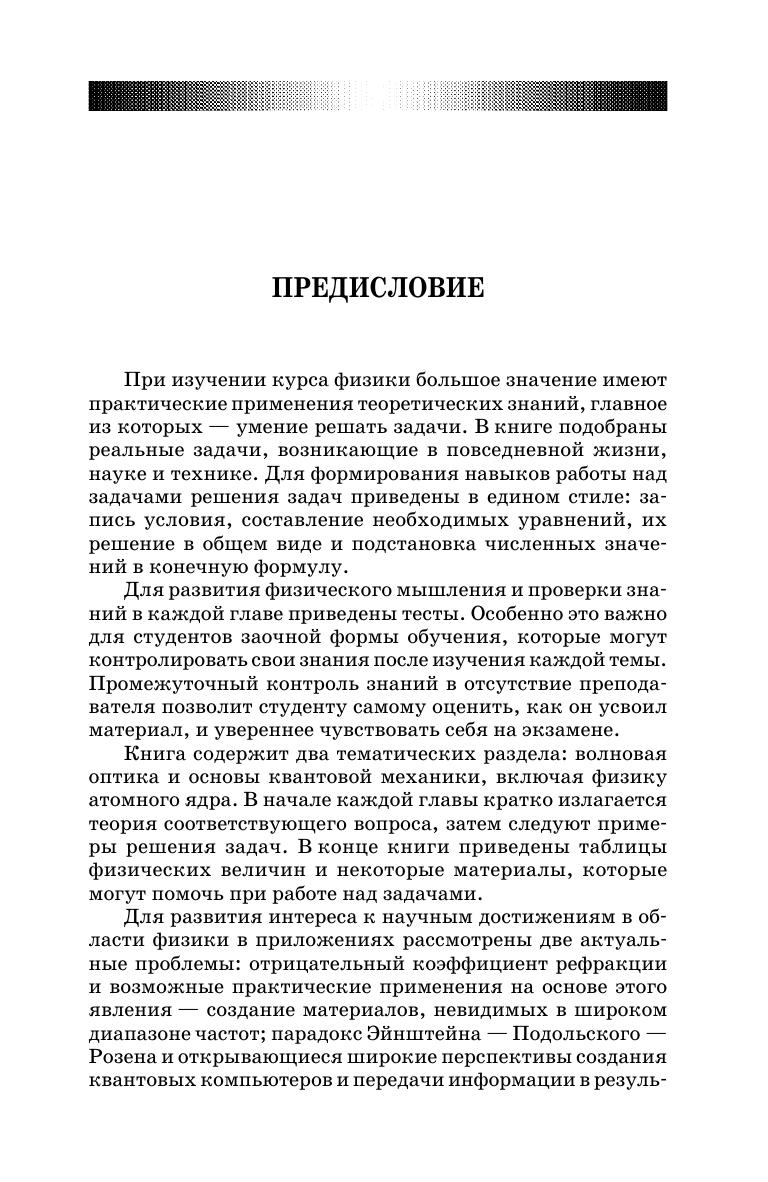 В пособии приведены задачи с решениями и тесты по оптике и основам квантовой механики, включая ядерную физику. Сборник состоит из пяти разделов, соответствующих программе курса физики для технических университетов. В начале каждой главы приводятся основные определения и формулы. Имеются задачи разной степени сложности. Тесты содержат по пять вопросов и по четыре ответа на каждый вопрос. В приложениях освещены две актуальные проблемы: электродинамика материалов с отрицательным коэффициентом преломления и возможность конструирования невидимых материалов, парадокс Эйнштейна — Подольского — Розена и телепортация. Соответствует современным требованиям Федерального государственного образовательного стандарта среднего профессионального образования и профессиональным квалификационным требованиям. Учебное пособие предназначено для студентов колледжей, изучающих курс физики в рамках естественнонаучных, педагогических и технических направлений подготовки. Будет полезно абитуриентам, готовящимися к поступлению в университеты по вышеперечисленным направлениям подготовки.