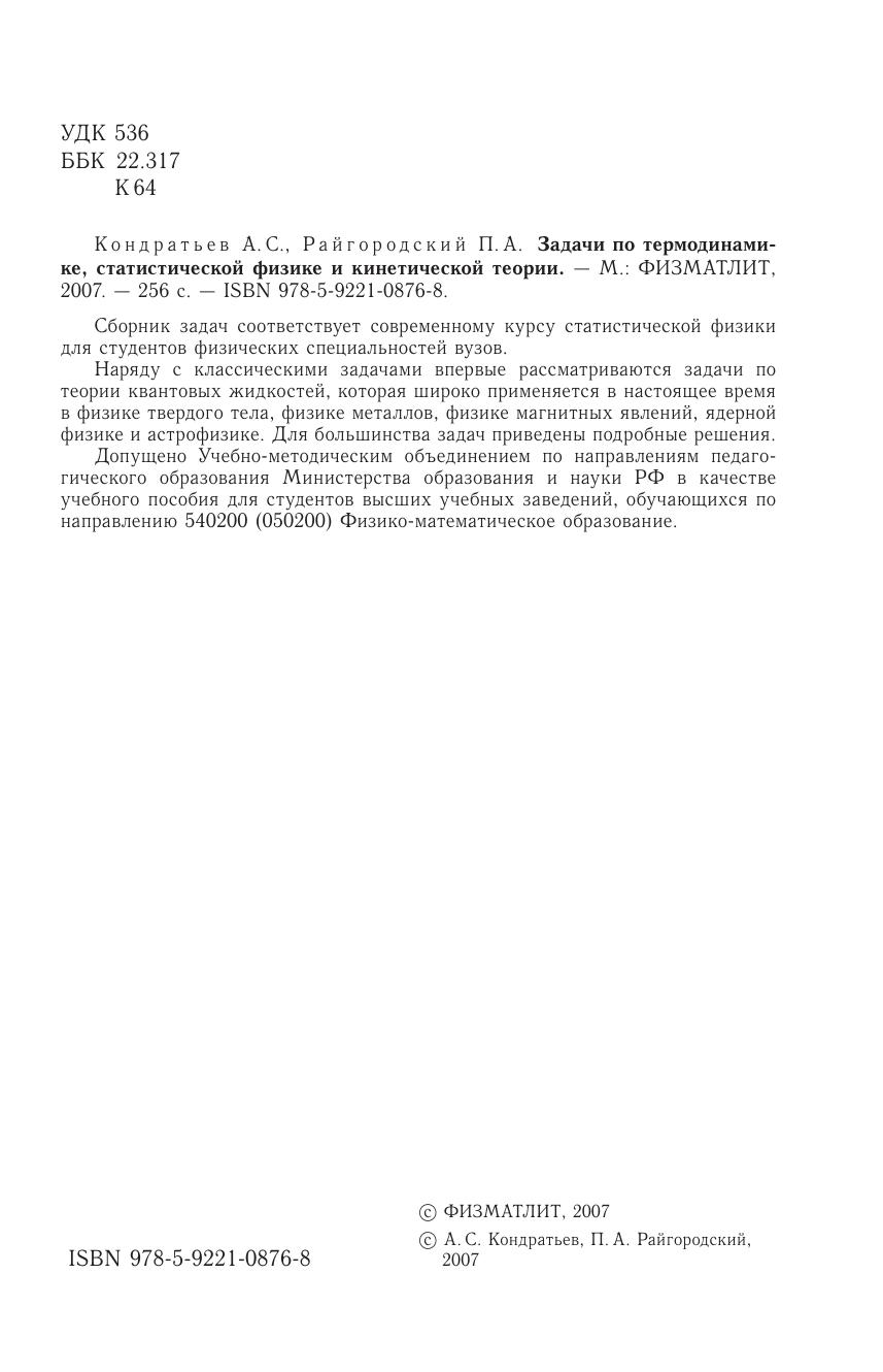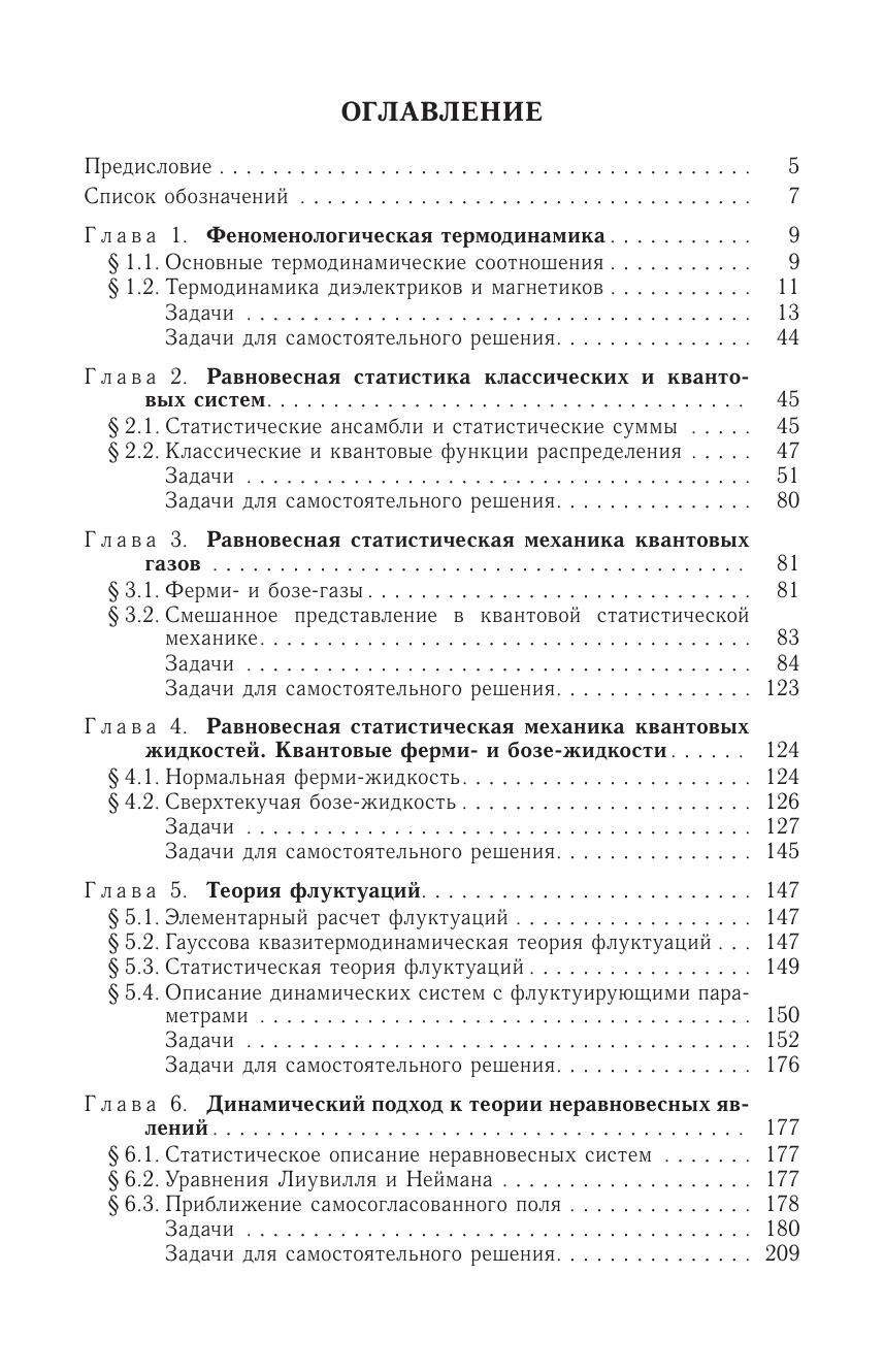 Сборник задач соответствует современному курсу статистической физики для студентов физических специальностей вузов. Наряду с классическими задачами впервые рассматриваются задачи по теории квантовых жидкостей, которая широко применяется в настоящее время в физике твердого тела, физике металлов, физике магнитных явлений, ядерной физике и астрофизике. Для большинства задачп риведены подробные решения.