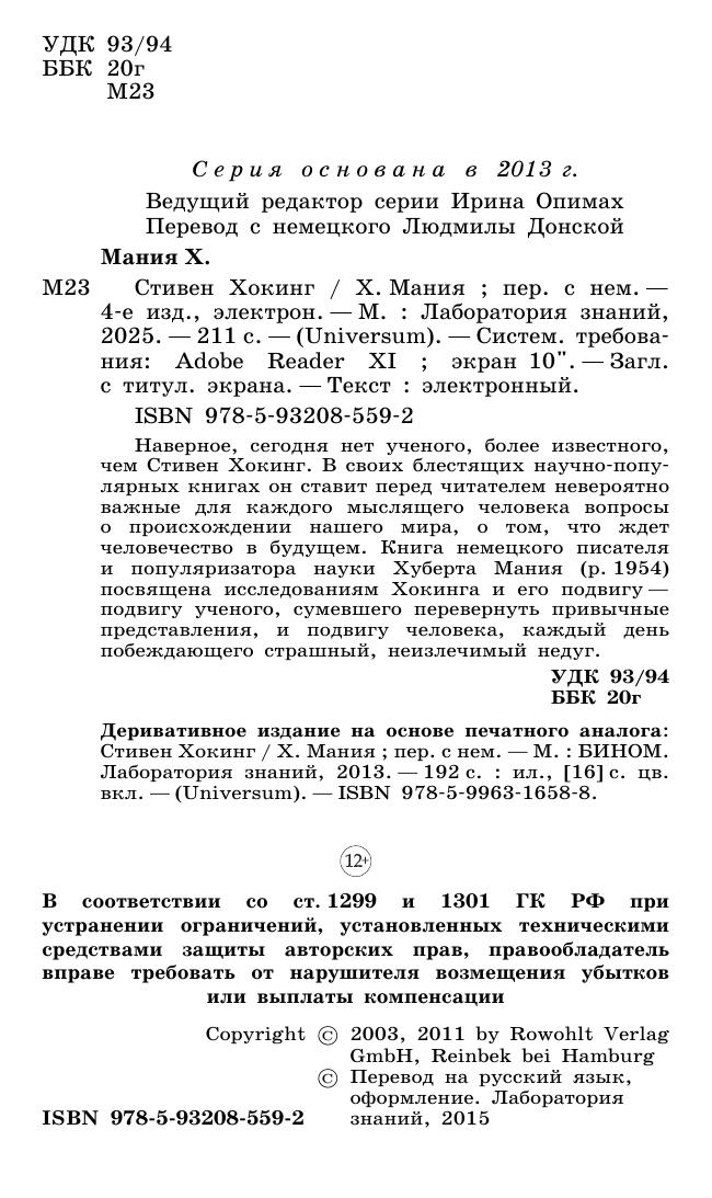 Наверное, сегодня нет ученого, более известного, чем Стивен Хокинг. В своих блестящих научно-популярных книгах он ставит перед читателем невероятно важные для каждого мыслящего человека вопросы о происхождении нашего мира, о том, что ждет человечество в будущем. Книга немецкого писателя и популяризатора науки Хуберта Мания (р. 1954) посвящена исследованиям Хокинга и его подвигу — подвигу ученого, сумевшего перевернуть привычные представления, и подвигу человека, каждый день побеждающего страшный, неизлечимый недуг.