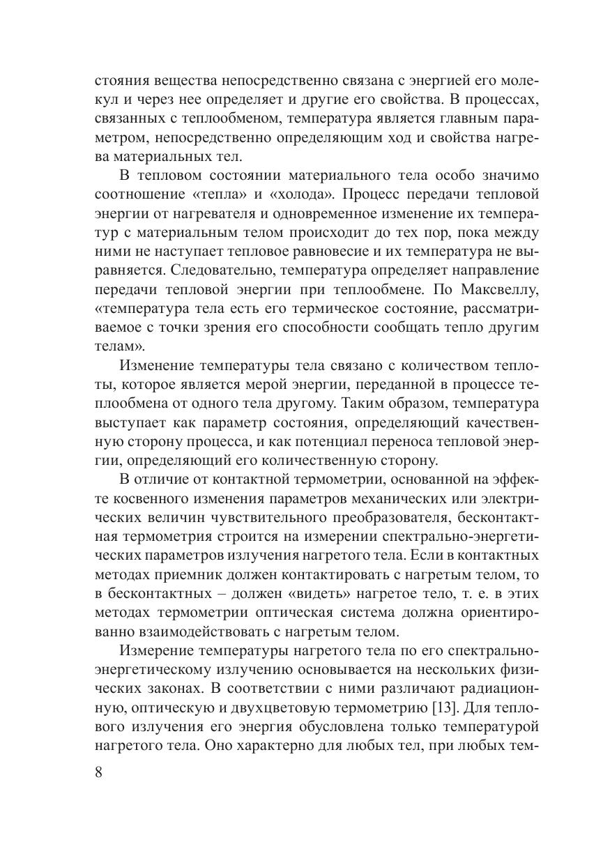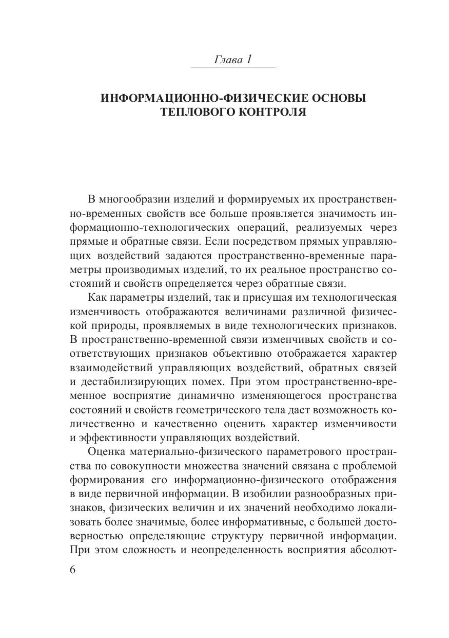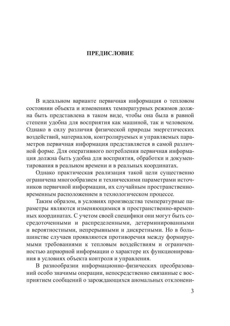 В монографии систематизированы способы и схемы бесконтактной термометрии. Собрана и обширно представлена элементная база теплового контроля и термометрии на основе современной электроники и оптоэлектроники, схемо- и видеотехники, волоконной и геометрической оптики, ориентированная на системное решение структурно-алгоритмических задач визуализации информационных полей различной физической природы. Особое внимание уделено локализации и формированию первичной информации и тепловых излучений методами и средствами волоконной оптики и светопроводящими волокнами. Рассмотрены методы и средства оптико-волоконной термометрии в пространственных координатах операций нагрева и охлаждения. В выборе структурных и схемных реализаций отдается предпочтение бесконтактным способам дистанционной пирометрии. Монография ориентирована на технологов, разработчиков и исследователей, занимающихся созданием новых технологий, конструкций и изделий. Она будет полезна специалистам лабораторий и отделов технического контроля, служб качества и диагностики, а также студентам, магистрантам и аспирантам инженерных и технологических специальностей.