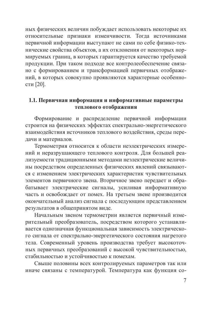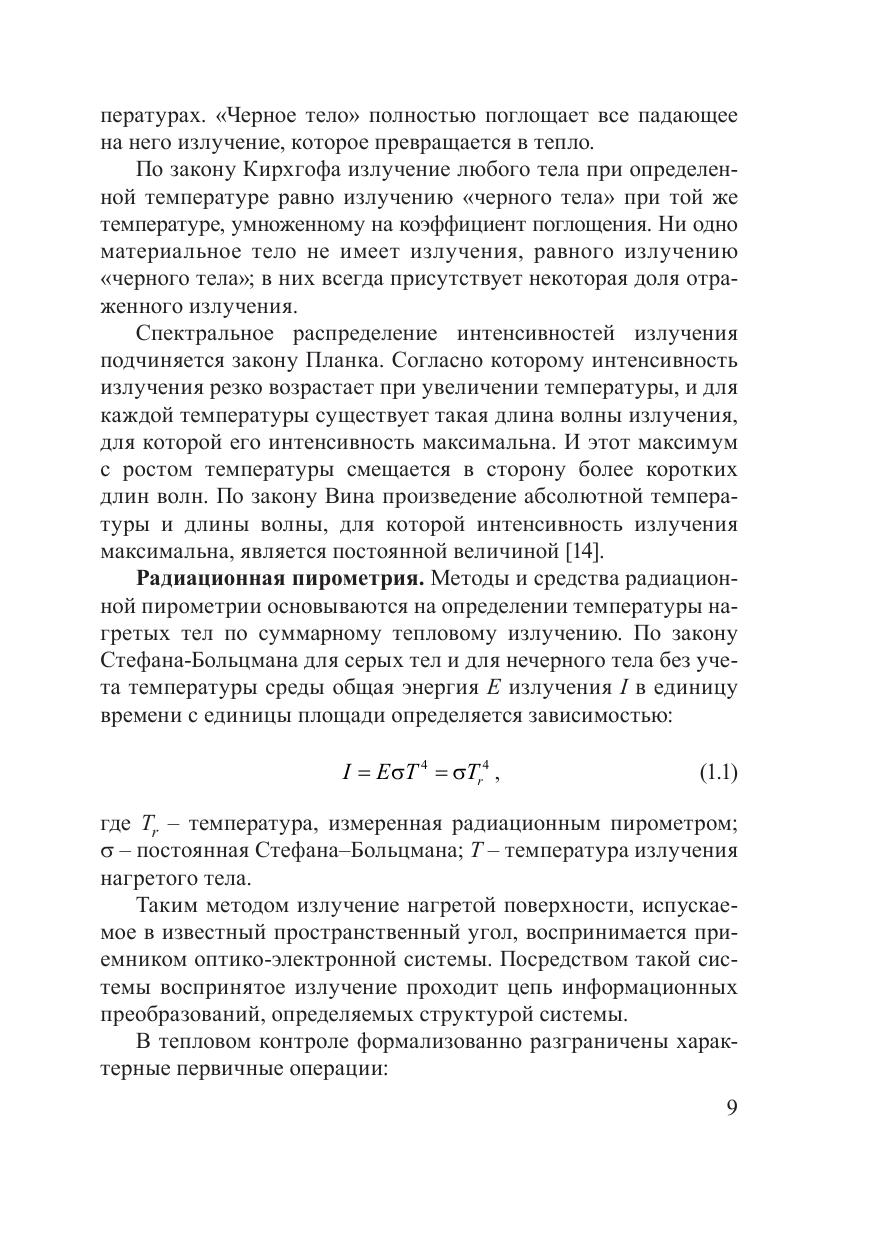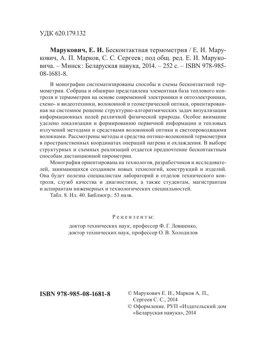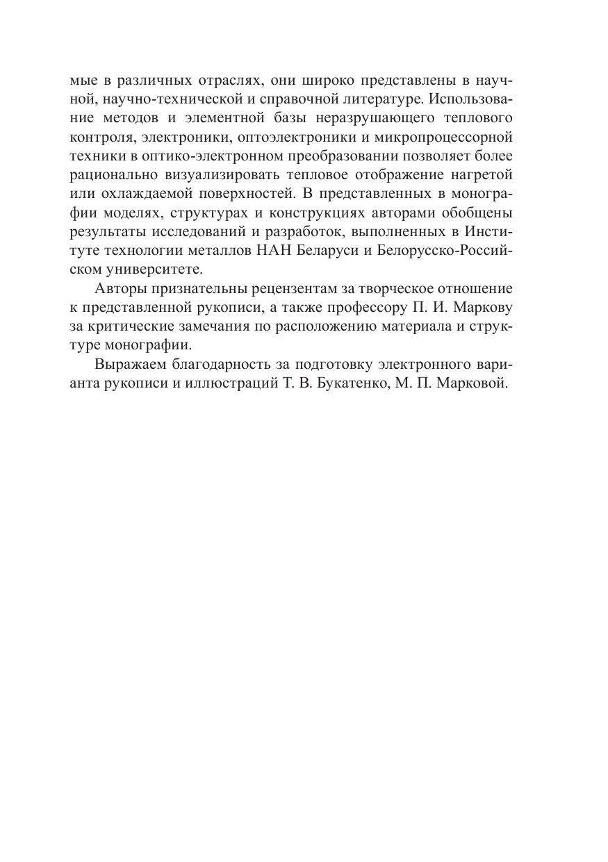 В монографии систематизированы способы и схемы бесконтактной термометрии. Собрана и обширно представлена элементная база теплового контроля и термометрии на основе современной электроники и оптоэлектроники, схемо- и видеотехники, волоконной и геометрической оптики, ориентированная на системное решение структурно-алгоритмических задач визуализации информационных полей различной физической природы. Особое внимание уделено локализации и формированию первичной информации и тепловых излучений методами и средствами волоконной оптики и светопроводящими волокнами. Рассмотрены методы и средства оптико-волоконной термометрии в пространственных координатах операций нагрева и охлаждения. В выборе структурных и схемных реализаций отдается предпочтение бесконтактным способам дистанционной пирометрии. Монография ориентирована на технологов, разработчиков и исследователей, занимающихся созданием новых технологий, конструкций и изделий. Она будет полезна специалистам лабораторий и отделов технического контроля, служб качества и диагностики, а также студентам, магистрантам и аспирантам инженерных и технологических специальностей.