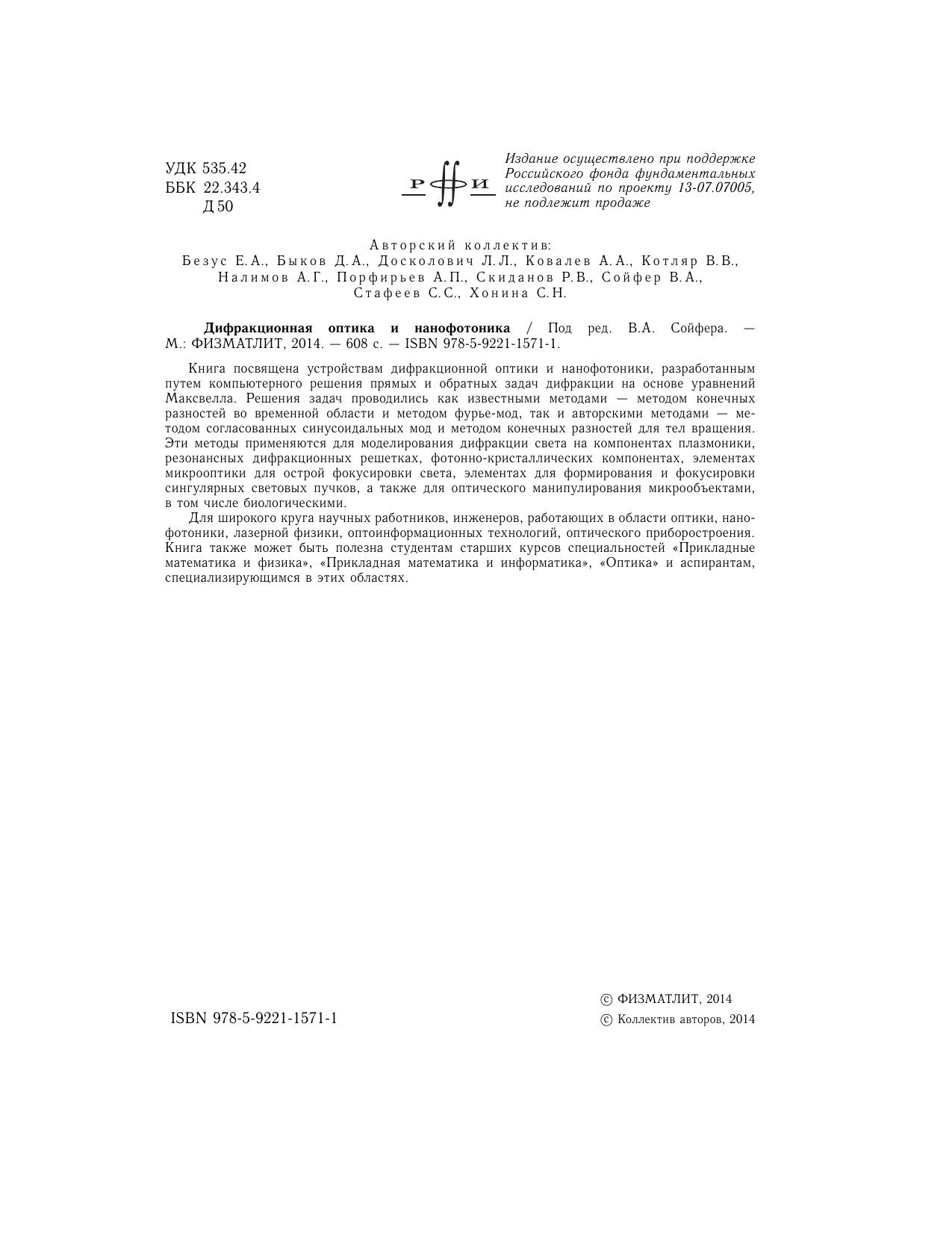 Для широкого круга научных работников, инженеров, работающих в области оптики, нанофотоники, лазерной физики, оптоинформационных технологий, оптического приборостроения.
