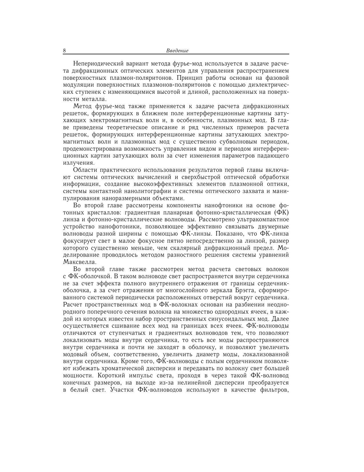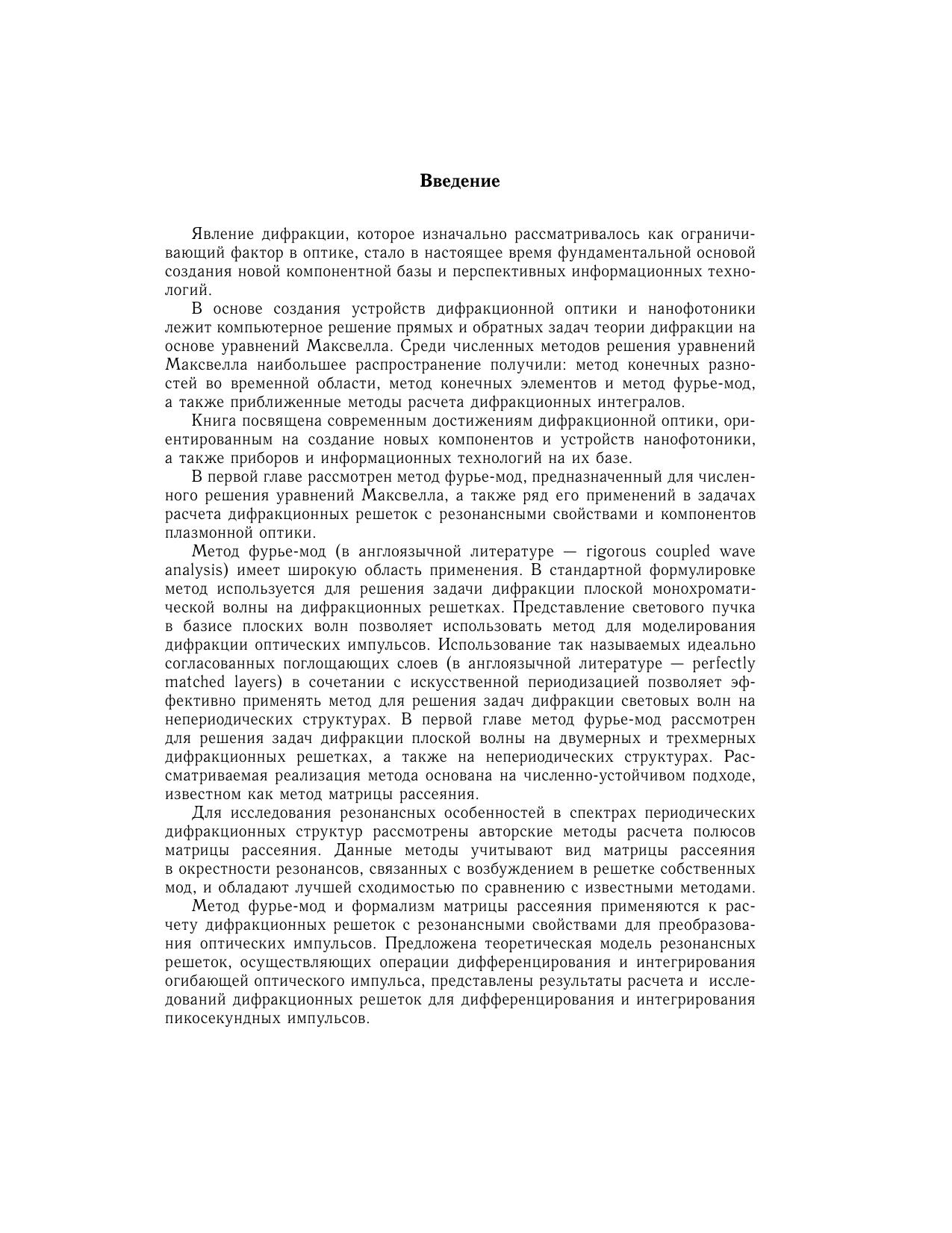 Книга посвящена устройствам дифракционной оптики и нанофотоники, разработанным путем компьютерного решения прямых и обратных задач дифракции на основе уравнений Максвелла. Решения задач проводились как известными методами — методом конечных разностей во временной области и методом фурье-мод, так и авторскими методами — методом согласованных синусоидальных мод и методом конечных разностей для тел вращения.