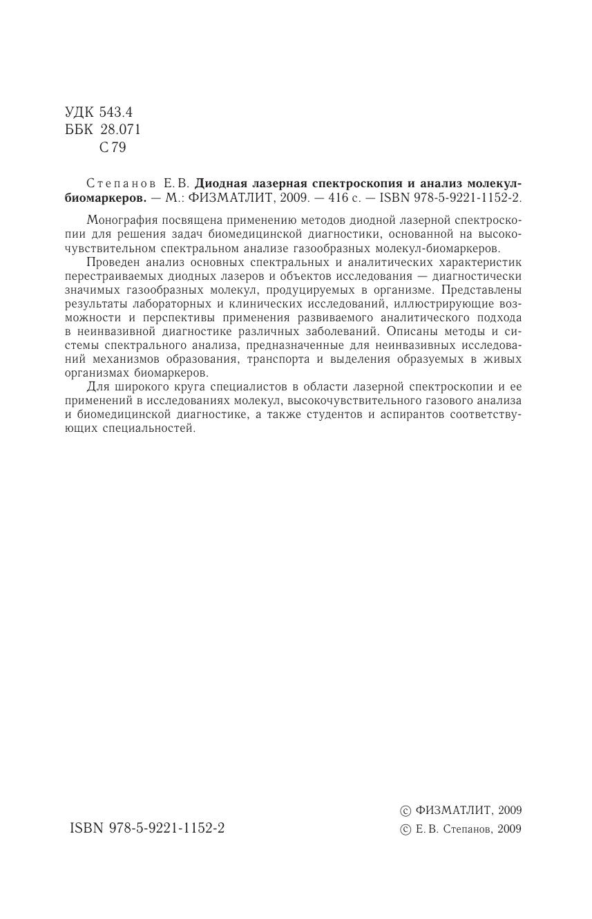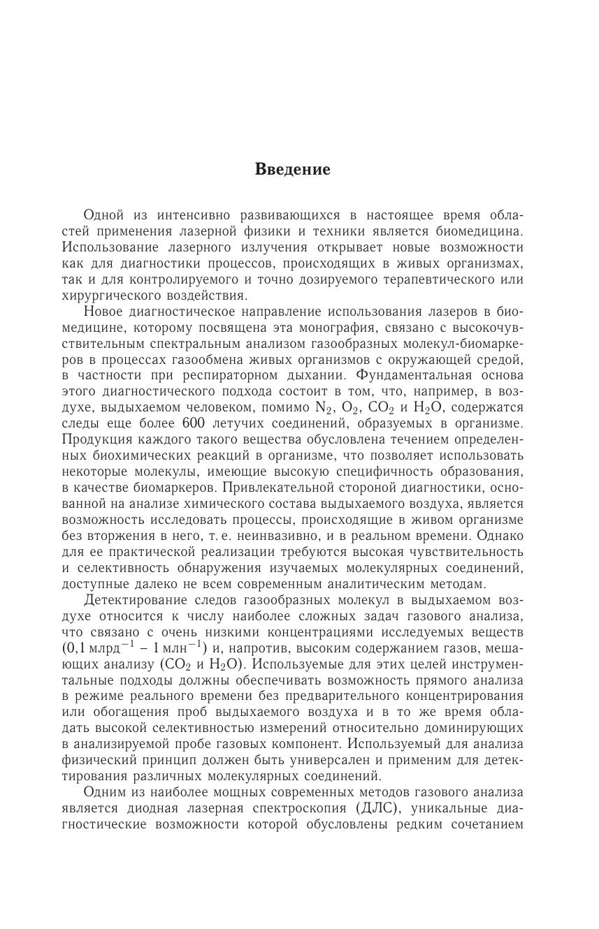 Монография посвящена применению методов диодной лазерной спектроскопии для решения задач биомедицинской диагностики, основанной на высокочувствительном спектральном анализе газообразных молекул-биомаркеров. Проведен анализ основных спектральных и аналитических характеристик перестраиваемых диодных лазеров и объектов исследования — диагностически значимых газообразных молекул, продуцируемых в организме. Представлены результаты лабораторных и клинических исследований, иллюстрирующие возможности и перспективы применения развиваемого аналитического подхода в неинвазивной диагностике различных заболеваний. Описаны методы и системы спектрального анализа, предназначенные для неинвазивных исследований механизмов образования, транспорта и выделения образуемых в живых организмах биомаркеров.Для широкого круга специалистов в области лазерной спектроскопии и ее применений в исследованиях молекул, высокочувствительного газового анализа и биомедицинской диагностике, а также студентов и аспирантов соответствующих специальностей.