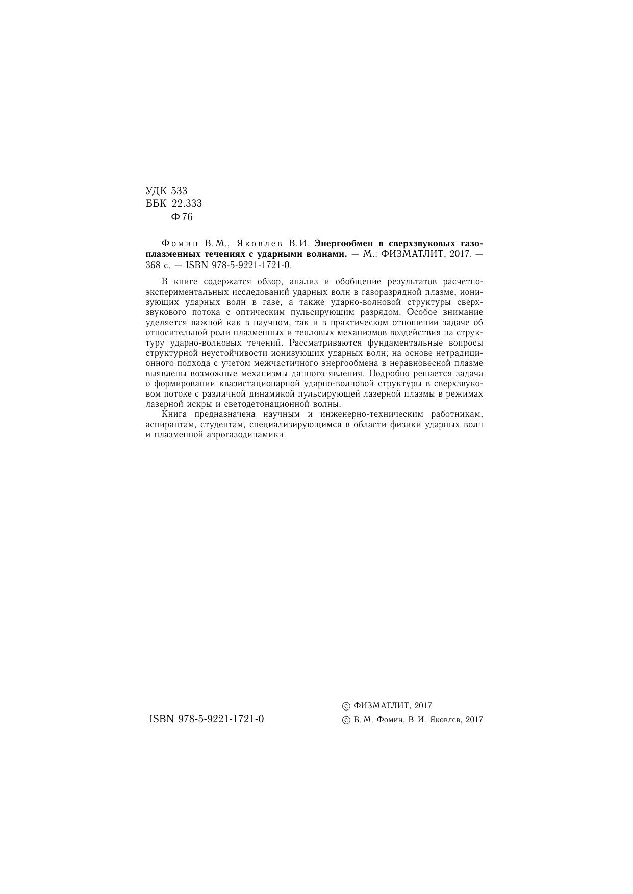 Книга предназначена научным и инженерно-техническим работникам, аспирантам, студентам, специализирующимся в области физики ударных волн и плазменной аэрогазодинамики.