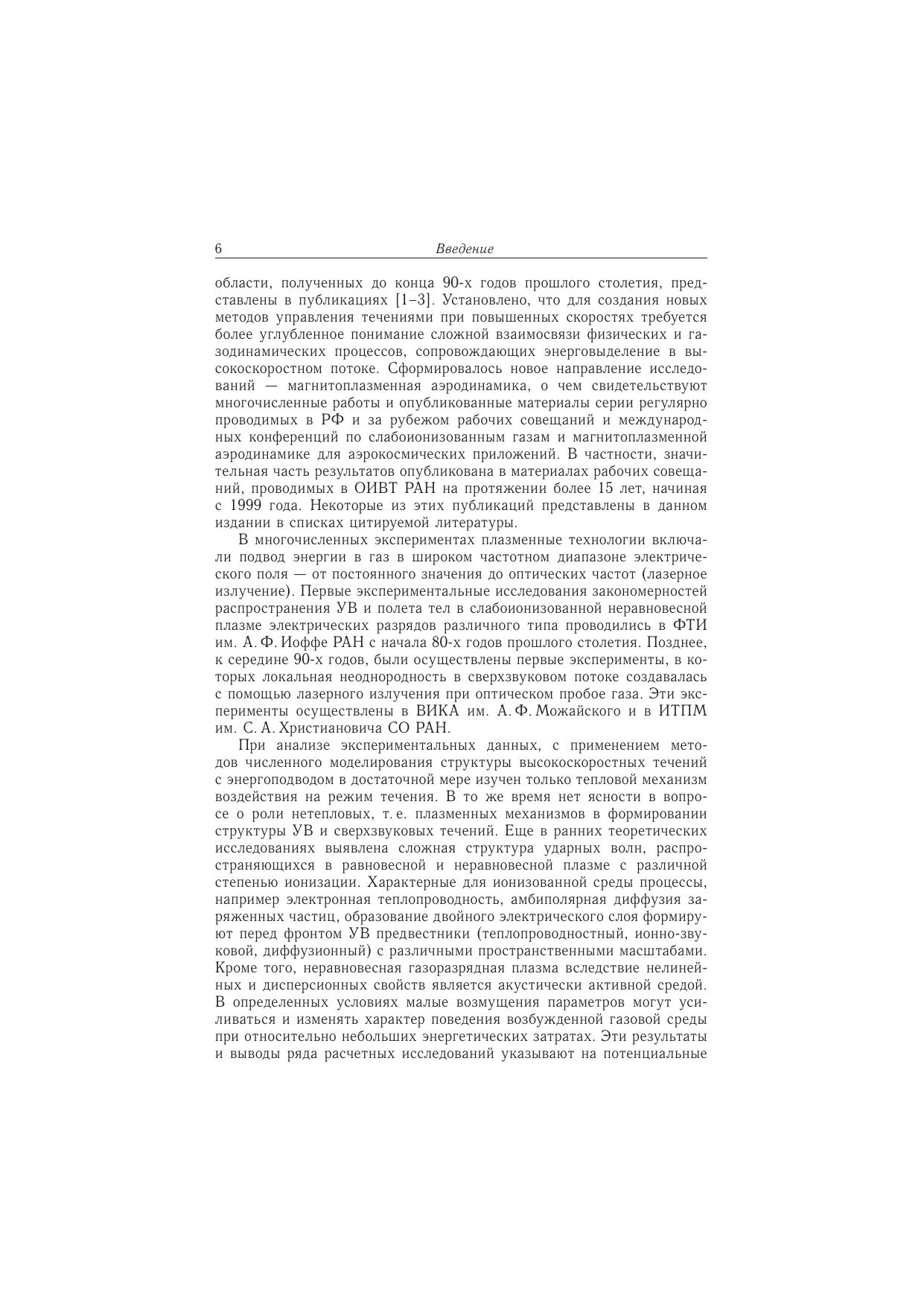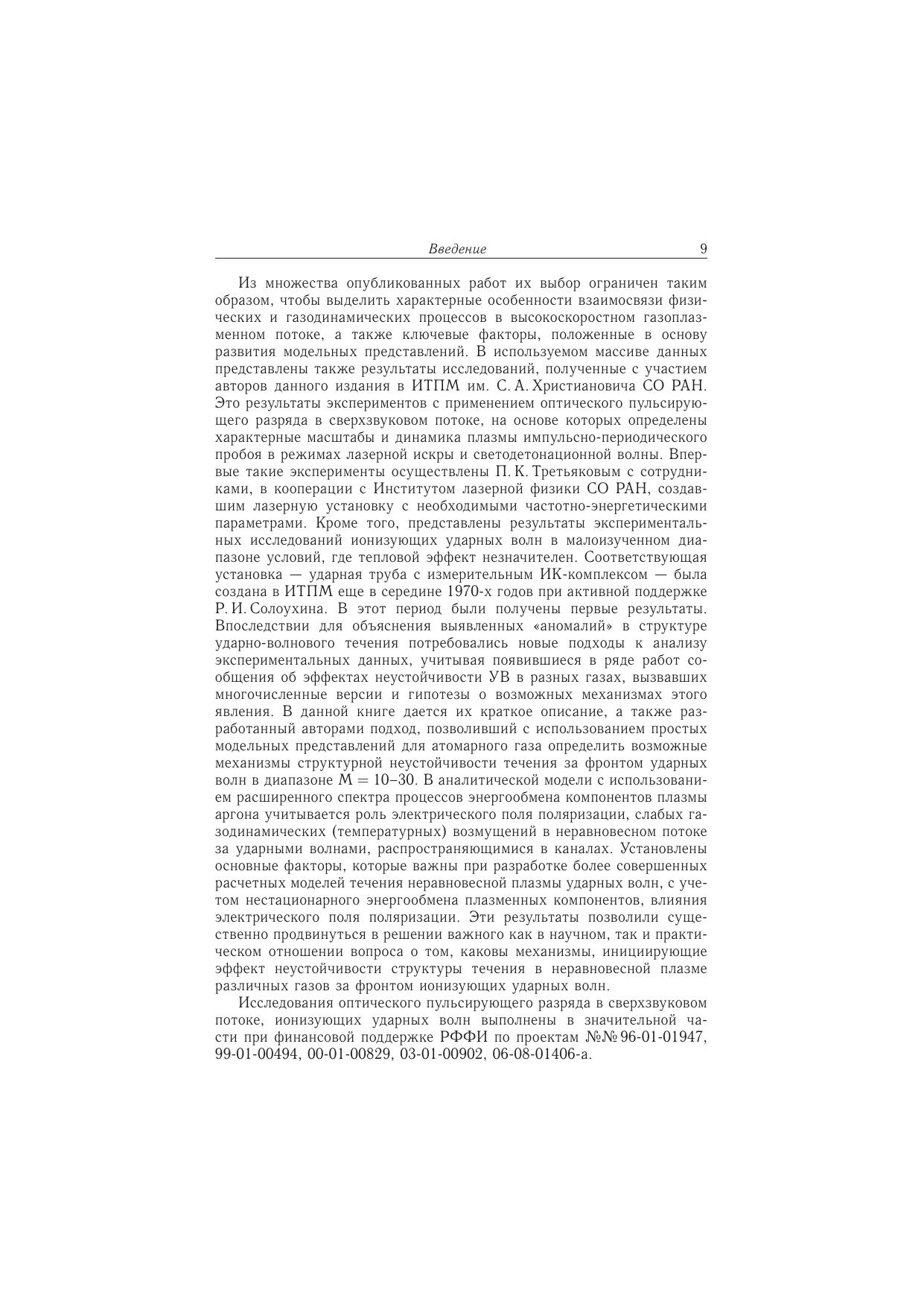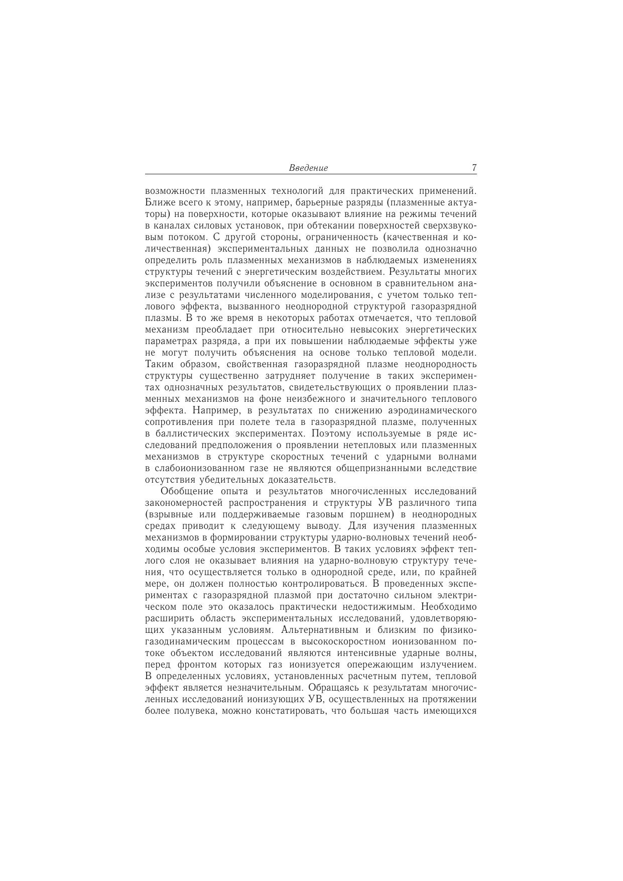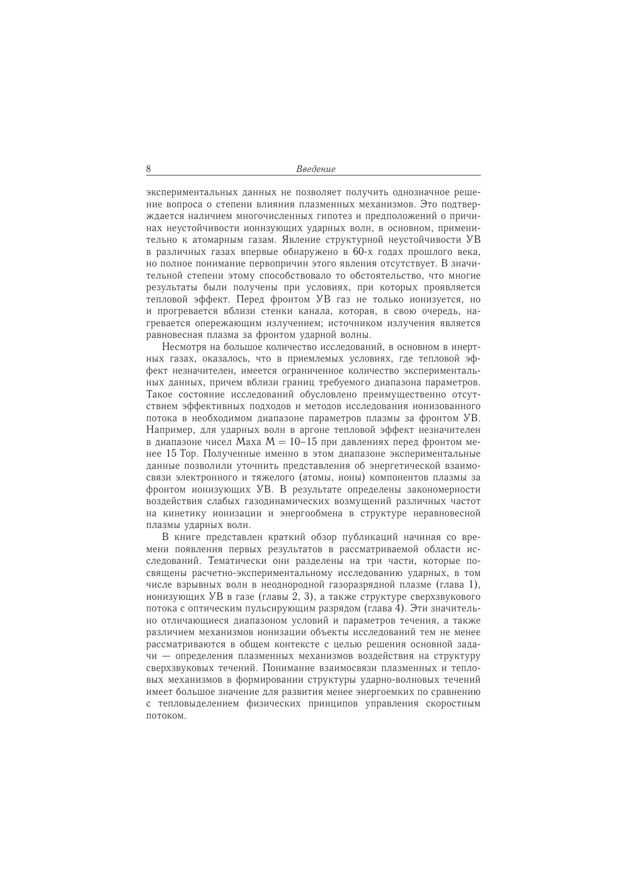 В книге содержатся обзор, анализ и обобщение результатов расчетно-экспериментальных исследований ударных волн в газоразрядной плазме, ионизующих ударных волн в газе, а также ударно-волновой структуры сверхзвукового потока с оптическим пульсирующим разрядом. Особое внимание уделяется важной как в научном, так и в практическом отношении задаче об относительной роли плазменных и тепловых механизмов воздействия на структуру ударно-волновых течений. Рассматриваются фундаментальные вопросы структурной неустойчивости ионизующих ударных волн; на основе нетрадиционного подхода с учетом межчастичного энергообмена в неравновесной плазме выявлены возможные механизмы данного явления. Подробно решается задача о формировании квазистационарной ударно-волновой структуры в сверхзвуковом потоке с различной динамикой пульсирующей лазерной плазмы в режимах лазерной искры и светодетонационной волны.