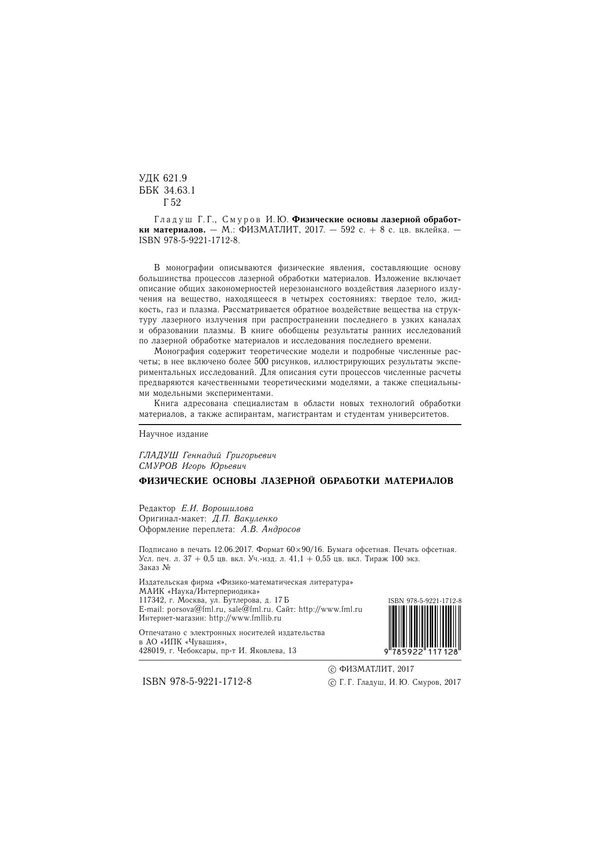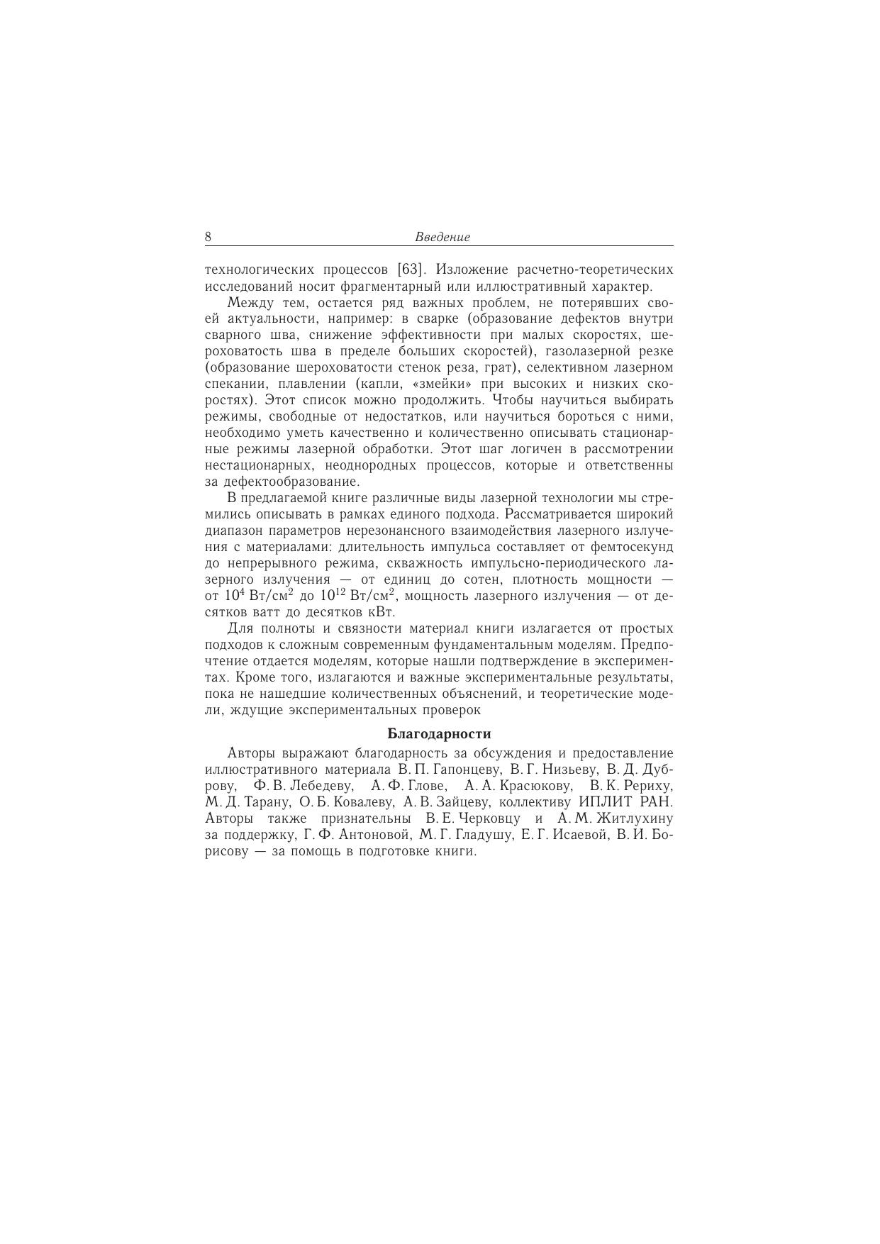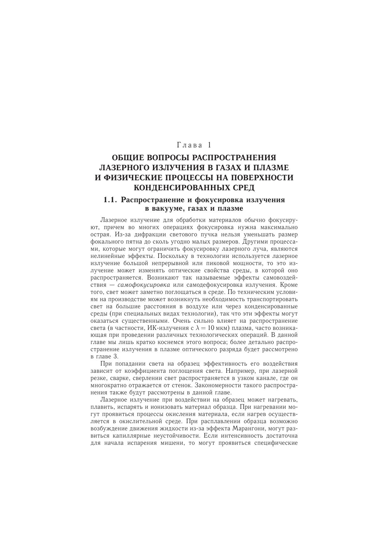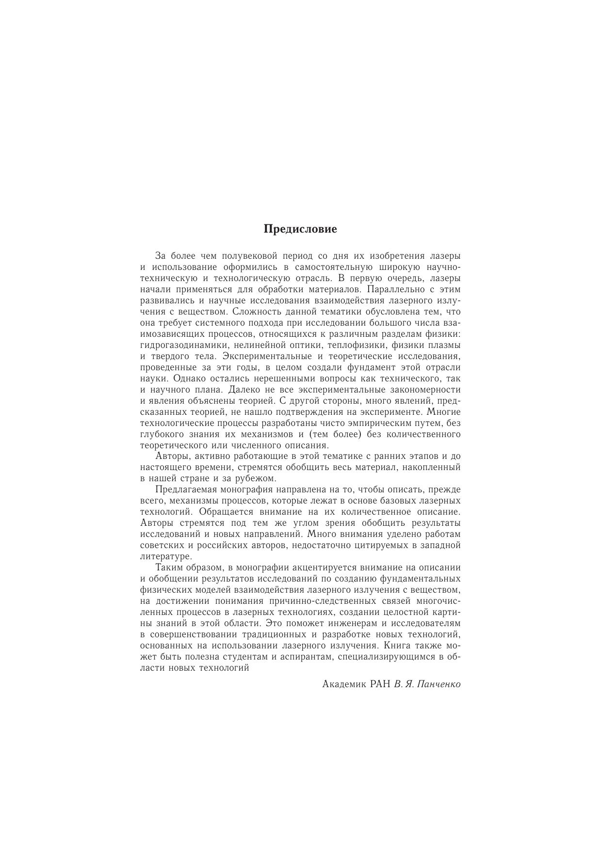 В монографии описываются физические явления, составляющие основу большинства процессов лазерной обработки материалов. Изложение включает описание общих закономерностей нерезонансного воздействия лазерного излучения на вещество, находящееся в четырех состояниях: твердое тело, жидкость, газ и плазма. Рассматривается обратное воздействие вещества на структуру лазерного излучения при распространении последнего в узких каналах и образовании плазмы. В книге обобщены результаты ранних исследований по лазерной обработке материалов и исследования последнего времени. Монография содержит теоретические модели и подробные численные расчеты; в нее включено более 500 рисунков, иллюстрирующих результаты экспериментальных исследований. Для описания сути процессов численные расчеты предваряются качественными теоретическими моделями, а также специальными модельными экспериментами. Книга адресована специалистам в области новых технологий обработки материалов, а также аспирантам, магистрантам и студентам университетов.