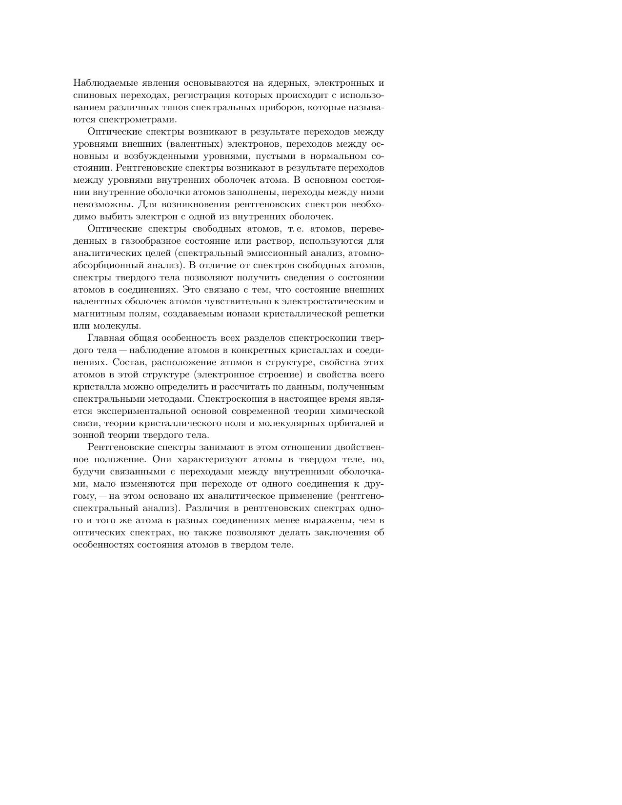 В пособии кратко изложены основные понятия и концепции оптической и рентгеновской спектроскопии. Рассмотрены предпосылки возникновения полуклассической модели атома по Бору—Резерфорду, а на ее основе — электронная структура атома водорода и строение многоэлектронных атомов. Описаны процессы взаимодействия электромагнитного излучения с веществом, природа и виды оптических и рентгеновских спектров, их систематика; основы качественного и количественного рентгеновского спектрального анализа. Пособие предназначено для учащихся старших классов специализированных физико-математических, естественнонаучных школ, учащихся центров дополнительного образования в рамках спецкурсов и факультативов по теоретическим и прикладным вопросам оптической и рентгеновской спектроскопии. Пособие также может быть полезно для преподавателей, не имеющих специальной подготовки в данной области.