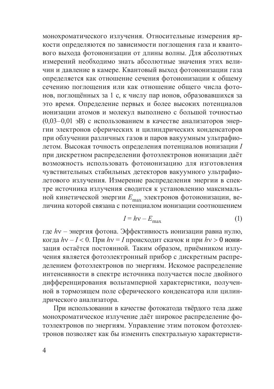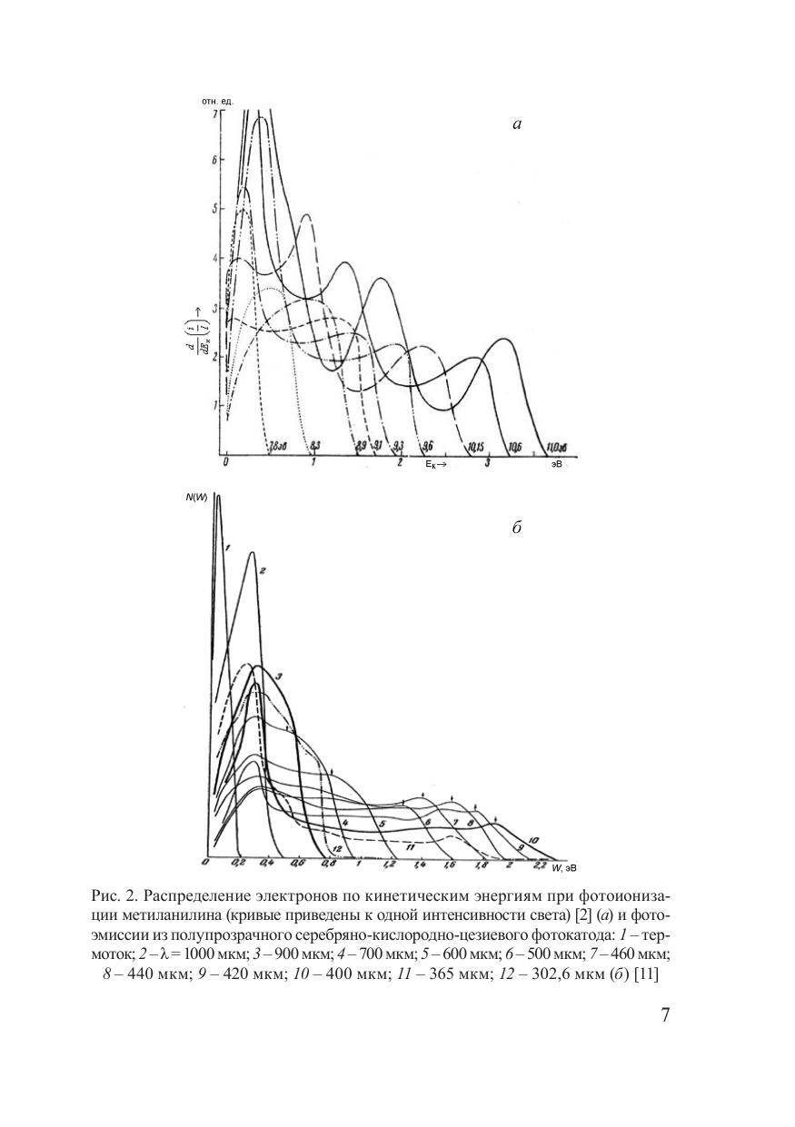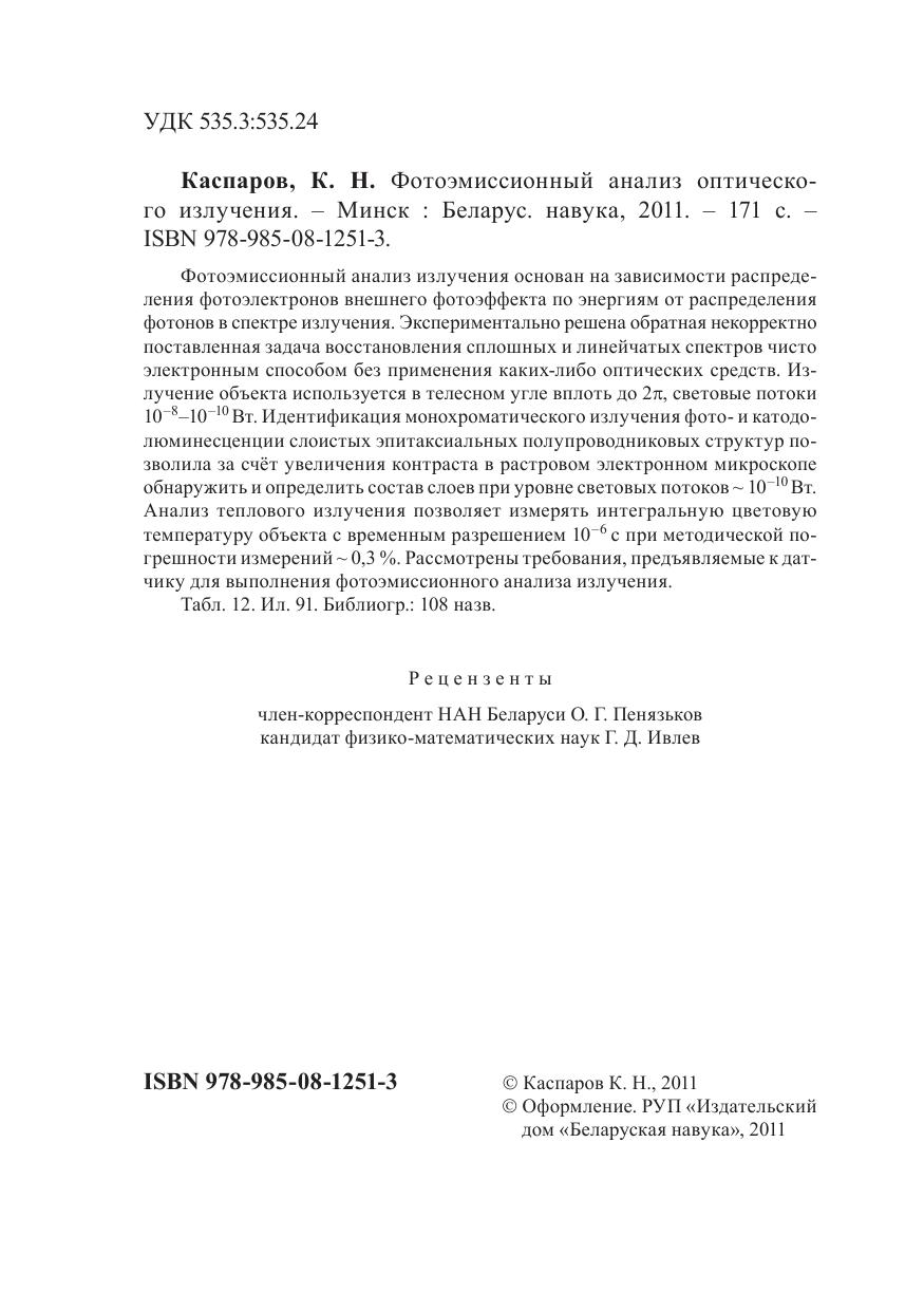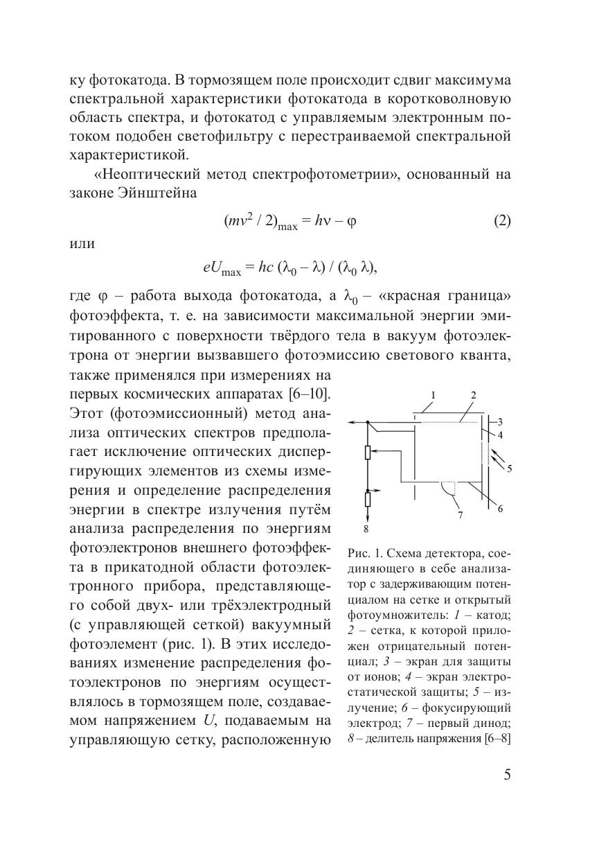 Фотоэмиссионный анализ излучения основан на зависимости распределения фотоэлектронов внешнего фотоэффекта по энергиям от распределения фотонов в спектре излучения. Экспериментально решена обратная некорректно поставленная задача восстановления сплошных и линейчатых спектров чисто электронным способом без применения каких-либо оптических средств. Излучение объекта используется в телесном угле вплоть до 2?, световые потоки 10 –8 –10 –10 Вт. Идентификация монохроматического излучения фото- и катодолюминесценции слоистых эпитаксиальных полупроводниковых структур позволила за счёт увеличения контраста в растровом электронном микроскопе обнаружить и определить состав слоев при уровне световых потоков ~ 10 –10 Вт. Анализ теплового излучения позволяет измерять интегральную цветовую температуру объекта с временным разрешением 10 –6 с при методической погрешности измерений ~ 0,3 %. Рассмотрены требования, предъявляемые к датчику для выполнения фотоэмиссионного анализа излучения.