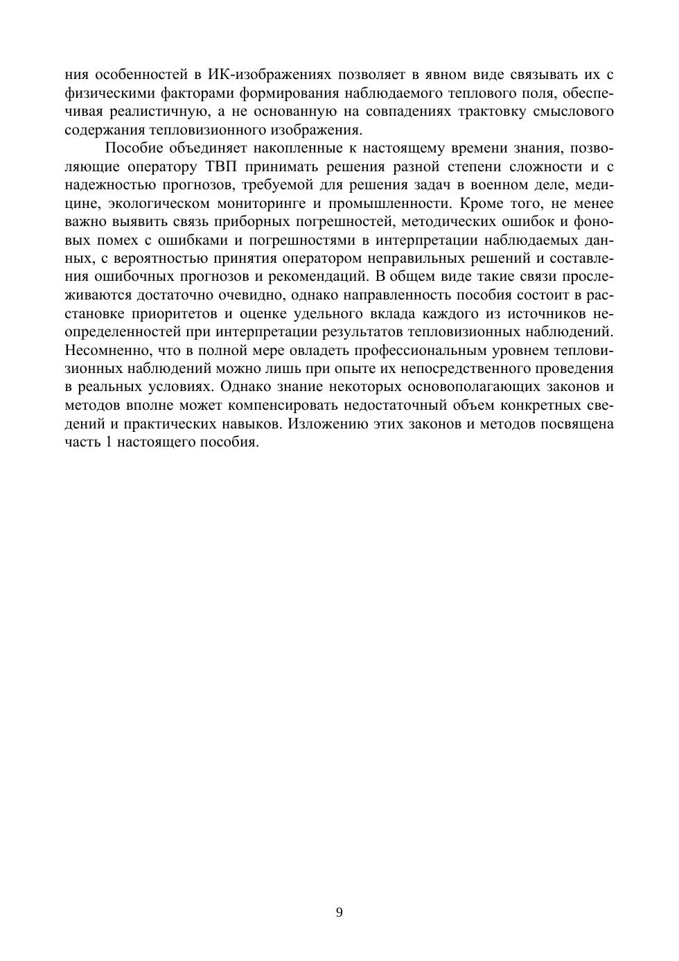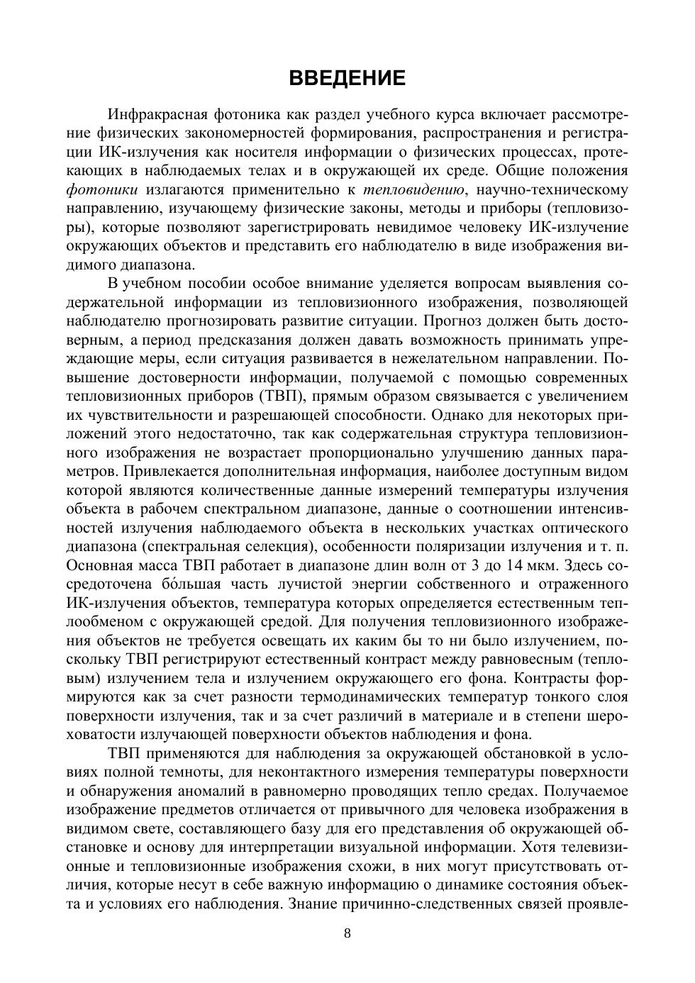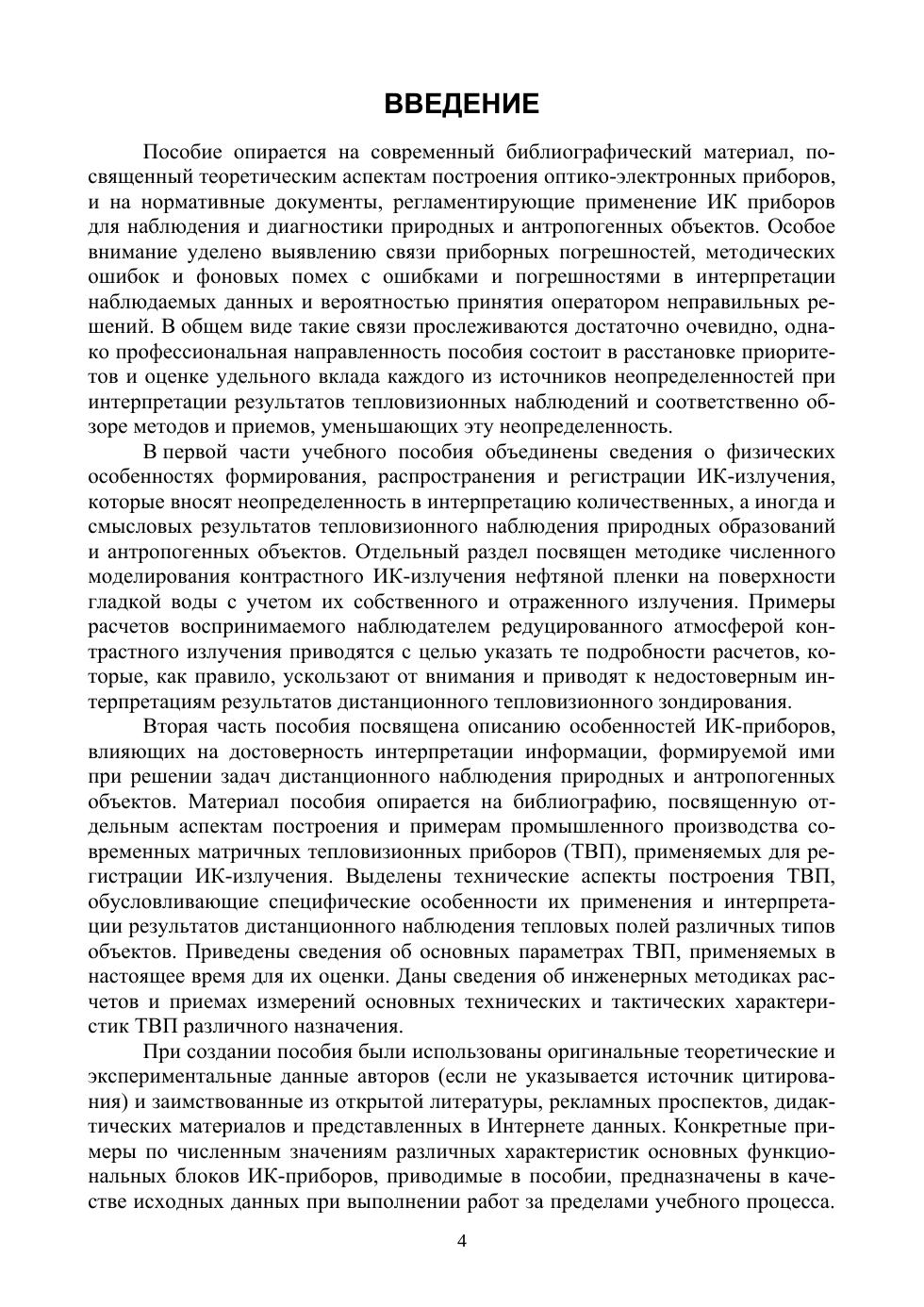 Основная задача, которая ставится перед пособием, — служить свя-зующим звеном между разработчиками ИК-приборов дистанционного зон-дирования и непосредственными пользователями этих приборов, осущест-вляющими выявление смысловой информации из результатов тепловизи-онного наблюдения при решении конкретных задач разных ступеней сложности в военном деле, в медицине, экологическом мониторинге и в промышленности. Учебное пособие предназначено для магистров технических вузов и специалистов, связанных с использованием ИК-приборов для дистанцион-ного наблюдения в разных областях их применения.