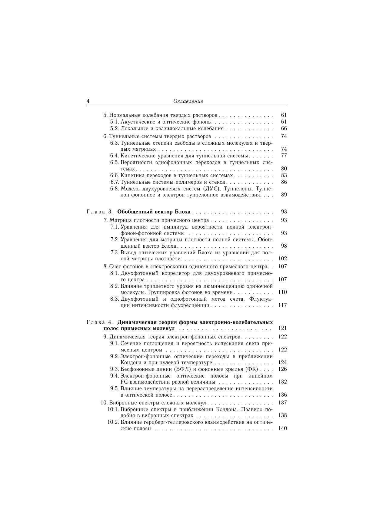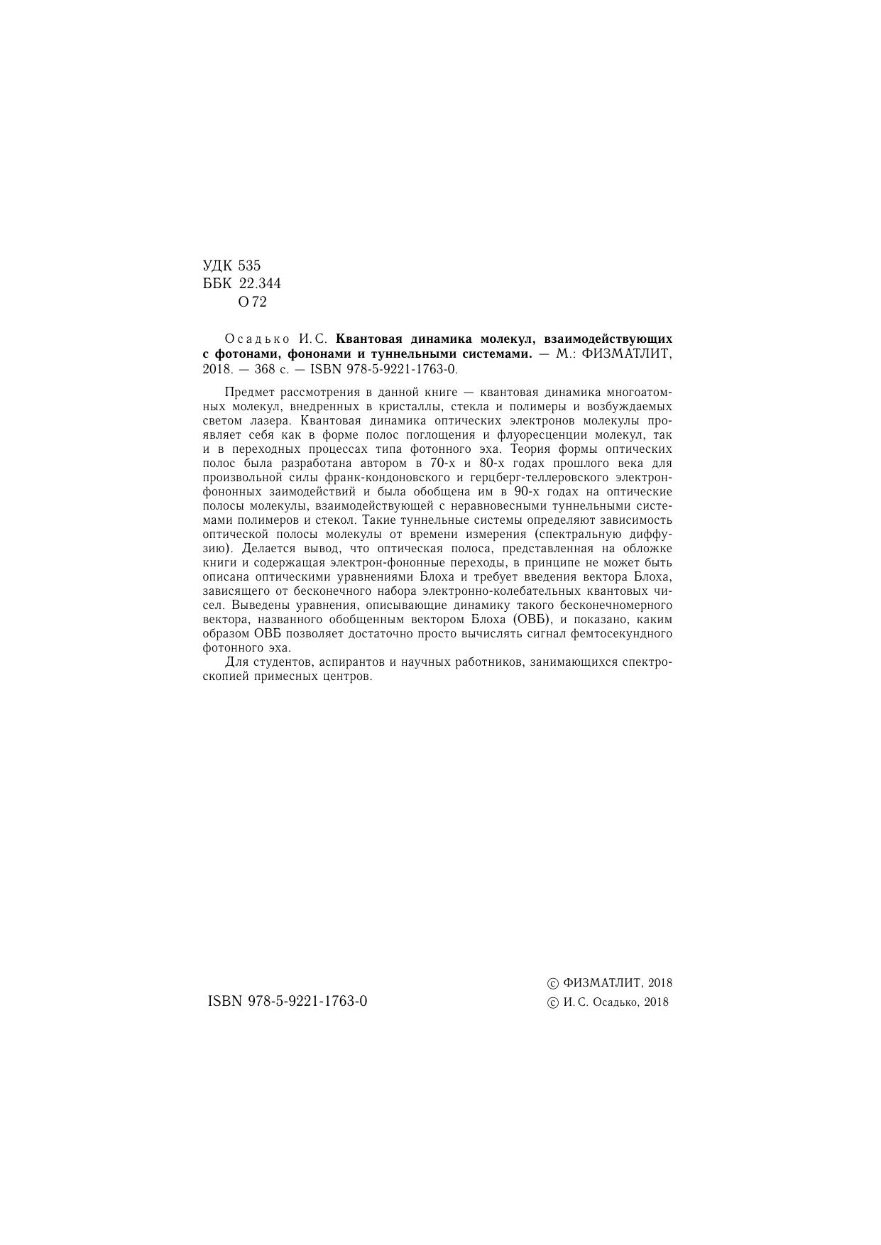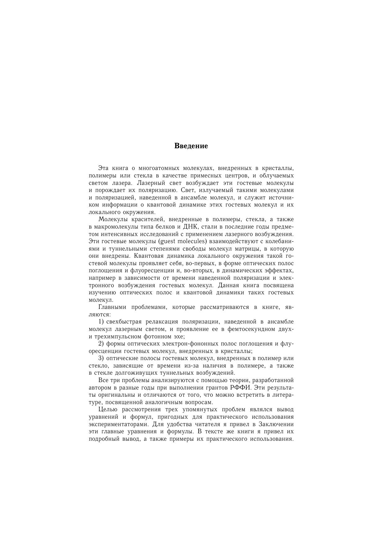 Предмет рассмотрения в данной книге — квантовая динамика многоатомных молекул, внедренных в кристаллы, стекла и полимеры и возбуждаемых светом лазера. Квантовая динамика оптических электронов молекулы проявляет себя как в форме полос поглощения и флуоресценции молекул, так и в переходных процессах типа фотонного эха. Теория формы оптических полос была разработана автором в 70-х и 80-х годах прошлого века для произвольной силы франк-кондоновского и герцберг-теллеровского электронфононных заимодействий и была обобщена им в 90-х годах на оптические полосы молекулы, взаимодействующей с неравновесными туннельными системами полимеров и стекол. Такие туннельные системы определяют зависимость оптической полосы молекулы от времени измерения (спектральную диффузию). Делается вывод, что оптическая полоса, представленная на обложке книги и содержащая электрон-фононные переходы, в принципе не может быть описана оптическими уравнениями Блоха и требует введения вектора Блоха, зависящего от бесконечного набора электронно-колебательных квантовых чисел. Выведены уравнения, описывающие динамику такого бесконечномерного вектора, названного обобщенным вектором Блоха (ОВБ), и показано, каким образом ОВБ позволяет достаточно просто вычислять сигнал фемтосекундного фотонного эха. Для студентов, аспирантов и научных работников, занимающихся спектроскопией примесных центров.