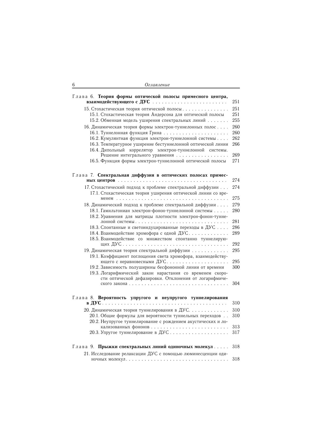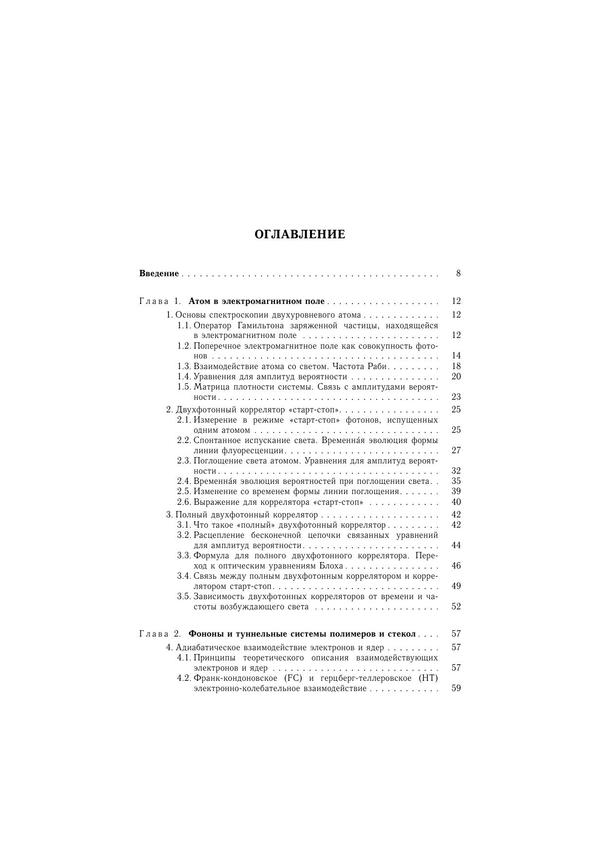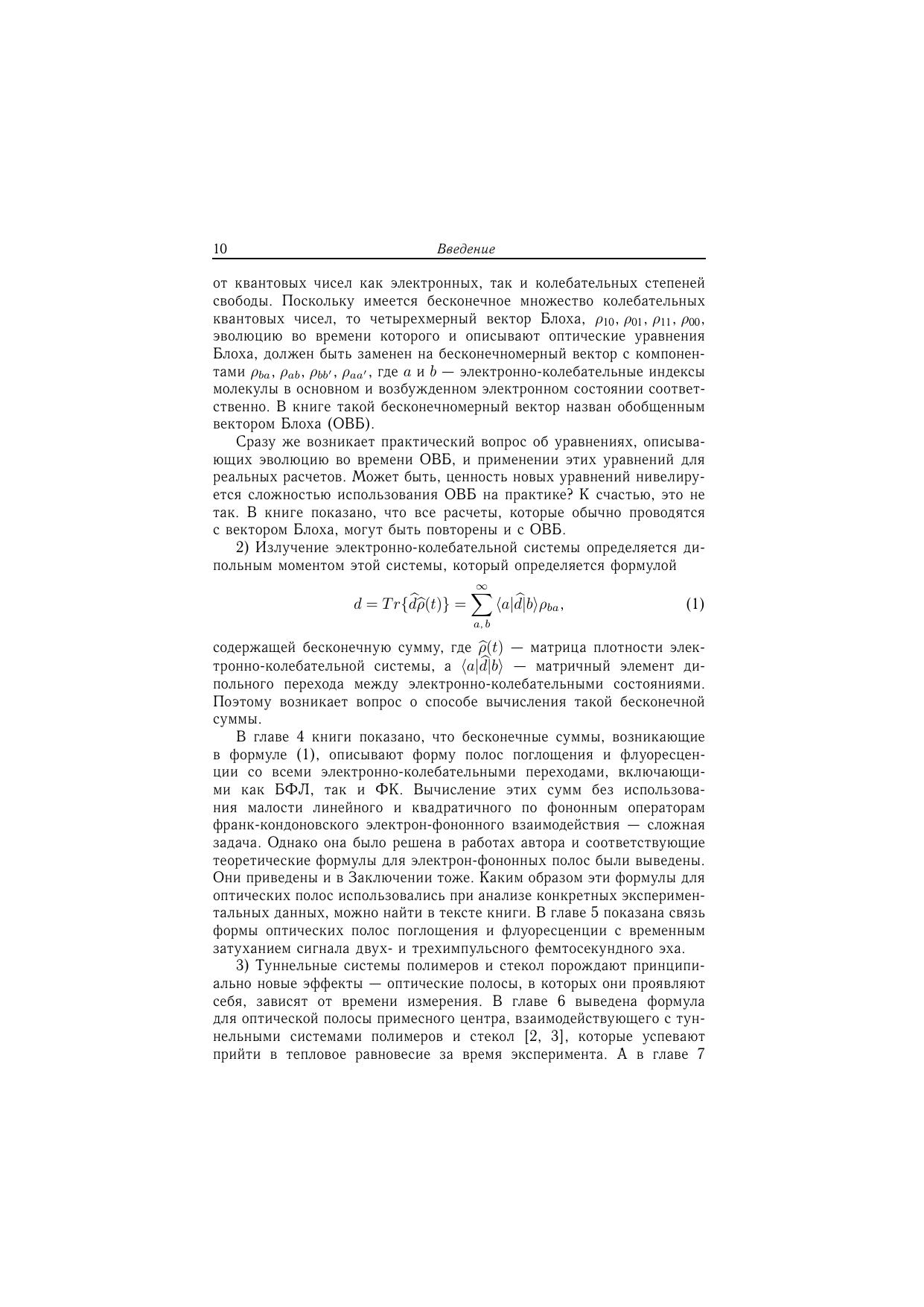 Предмет рассмотрения в данной книге — квантовая динамика многоатомных молекул, внедренных в кристаллы, стекла и полимеры и возбуждаемых светом лазера. Квантовая динамика оптических электронов молекулы проявляет себя как в форме полос поглощения и флуоресценции молекул, так и в переходных процессах типа фотонного эха. Теория формы оптических полос была разработана автором в 70-х и 80-х годах прошлого века для произвольной силы франк-кондоновского и герцберг-теллеровского электронфононных заимодействий и была обобщена им в 90-х годах на оптические полосы молекулы, взаимодействующей с неравновесными туннельными системами полимеров и стекол. Такие туннельные системы определяют зависимость оптической полосы молекулы от времени измерения (спектральную диффузию). Делается вывод, что оптическая полоса, представленная на обложке книги и содержащая электрон-фононные переходы, в принципе не может быть описана оптическими уравнениями Блоха и требует введения вектора Блоха, зависящего от бесконечного набора электронно-колебательных квантовых чисел. Выведены уравнения, описывающие динамику такого бесконечномерного вектора, названного обобщенным вектором Блоха (ОВБ), и показано, каким образом ОВБ позволяет достаточно просто вычислять сигнал фемтосекундного фотонного эха. Для студентов, аспирантов и научных работников, занимающихся спектроскопией примесных центров.