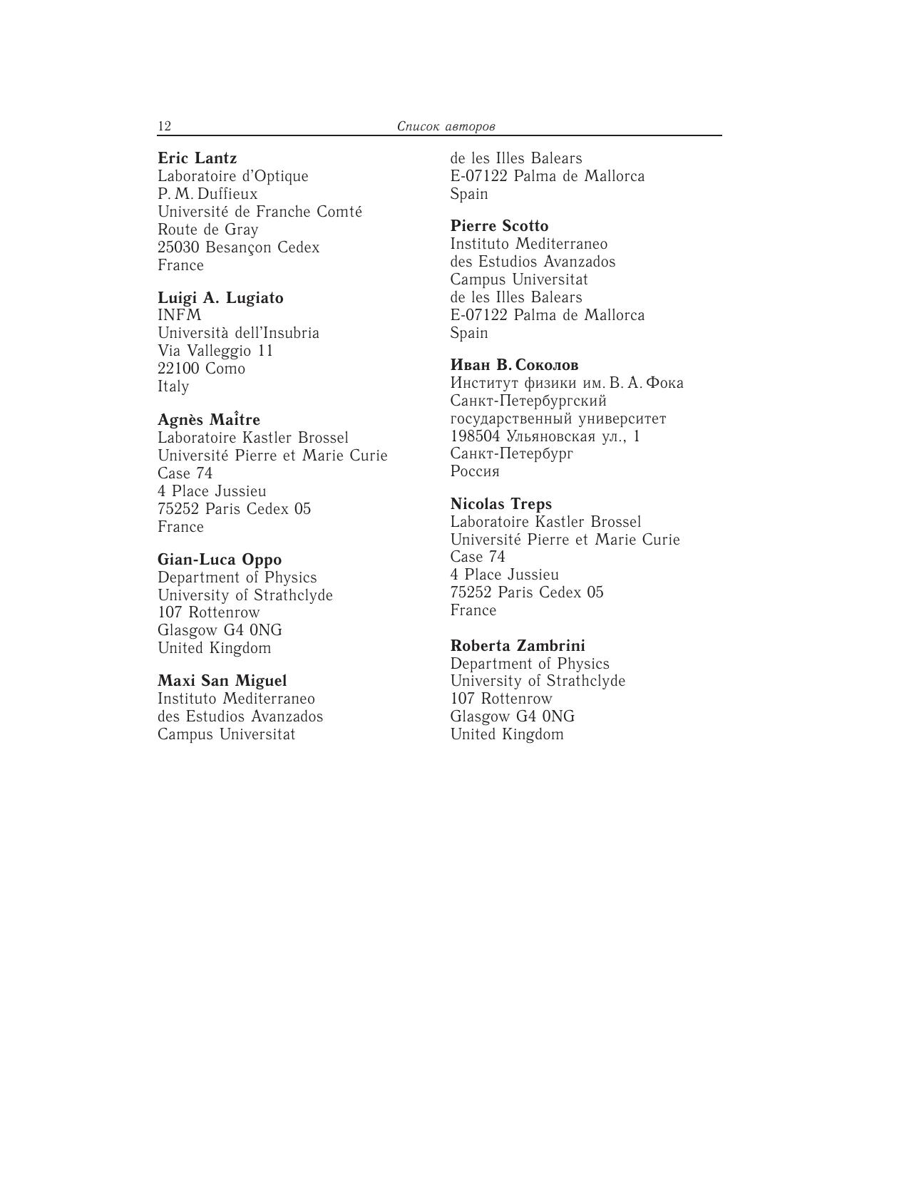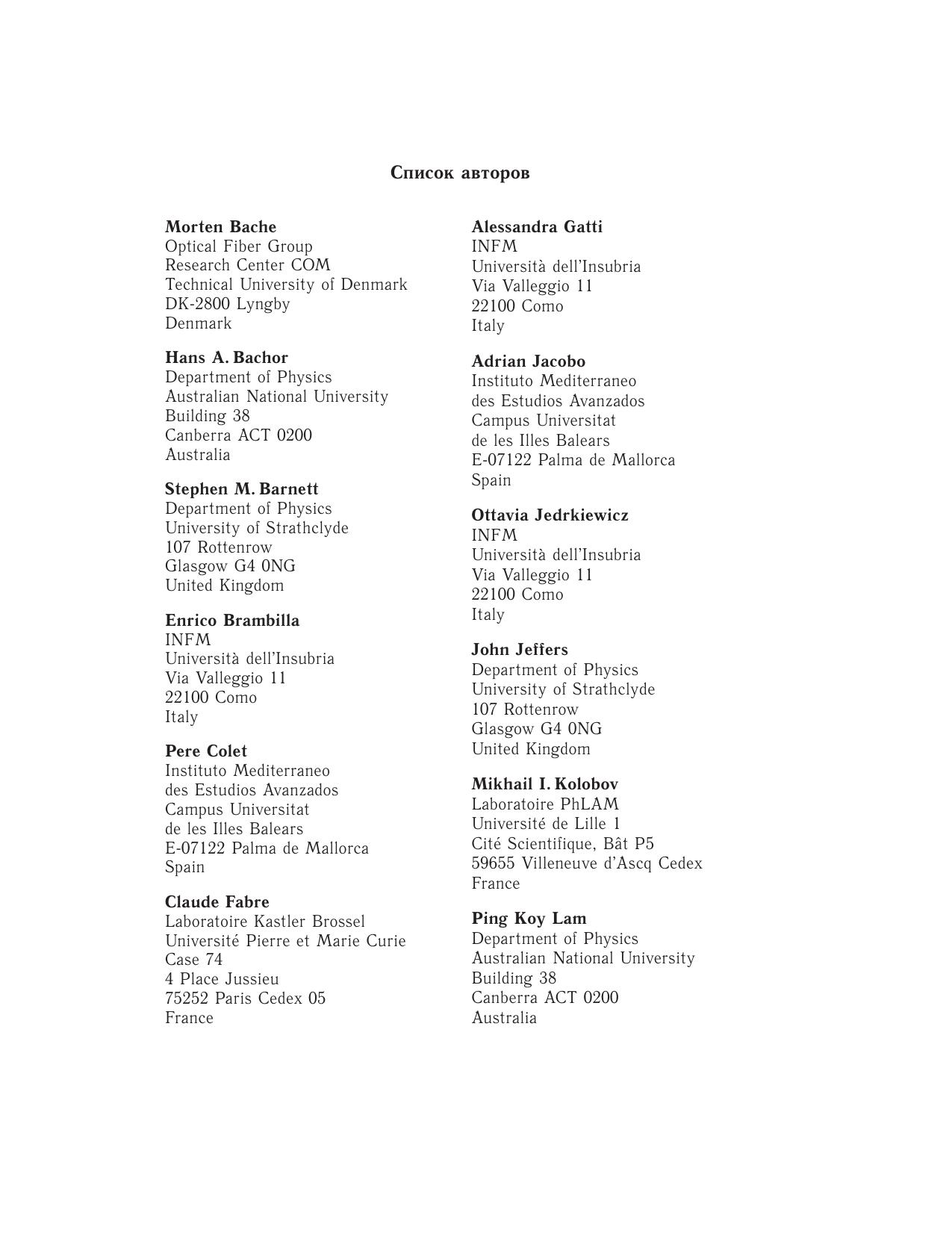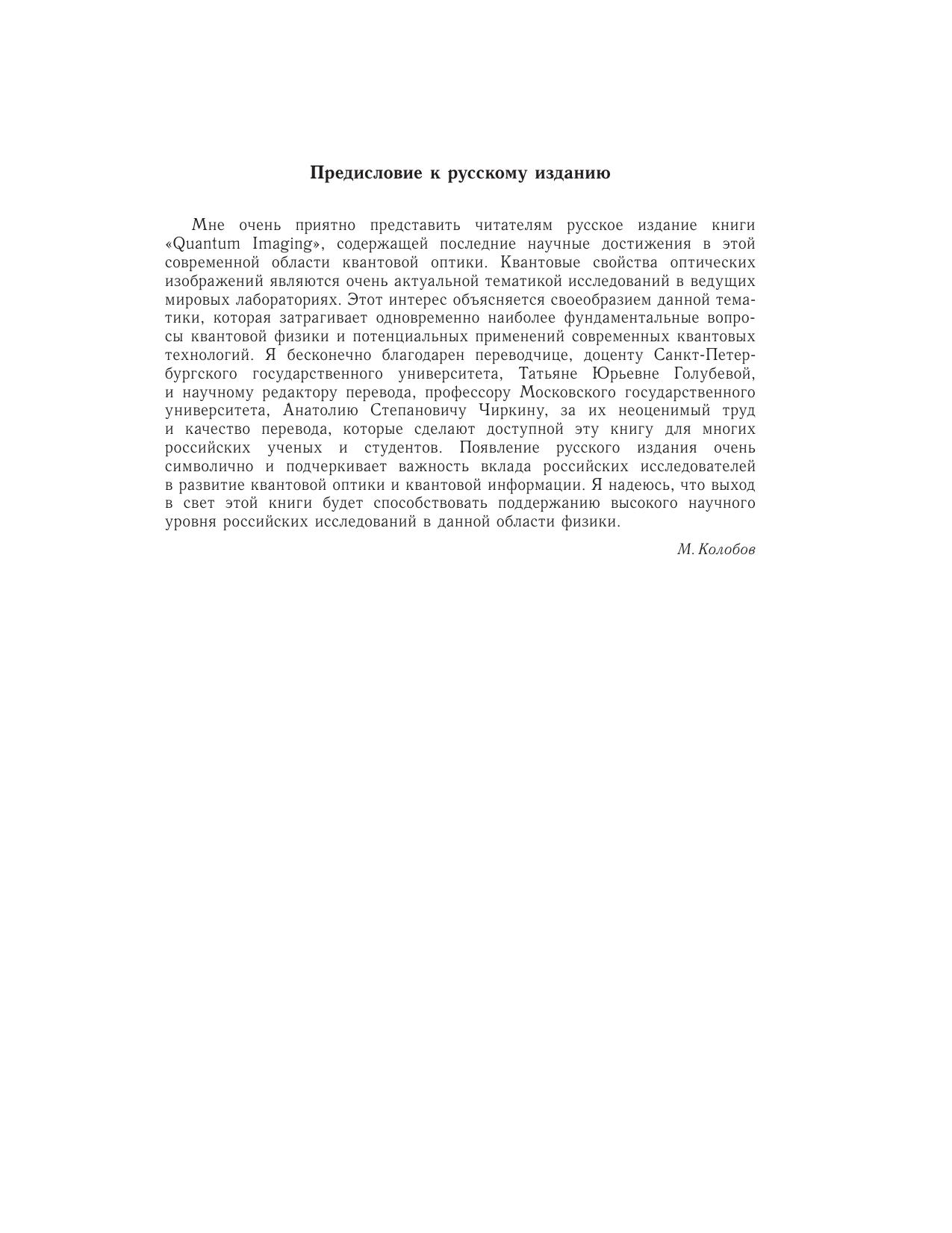 Монография написана интернациональным коллективом авторов- ведущими специалистами в области квантовой оптики. Книга содержит наиболее важные результаты теоретических и экспериментальных исследований, полученных в рамках общеевропейского проекта QUANTIM. Квантовое изображение - новая область квантовой оптики, в которой исследуются предельные характеристики оптического изображения, допускаемые квантовой механикой. Книга посвящена главным образом преобразованию оптического изображения в различных нелинейно-оптических схемах с использованием квантовых особенностей излучения от параметрических источников света. В ней рассмотрены вопросы формирования оптического изображения, его обработки и детектирования с увствительностью и разрешением, превышающими пределы классического изображения обсуждаются аспекты квантовых флуктуаций в пространственных солитонах, орбитальный угловой момент света и его применение в оптической связи. Книга предназначена специалистам, работающим в области оптики и информатики и интересующимся квантовыми аспектами. Она будет полезна аспирантам и студентам старших курсов соответствующих специальностей.