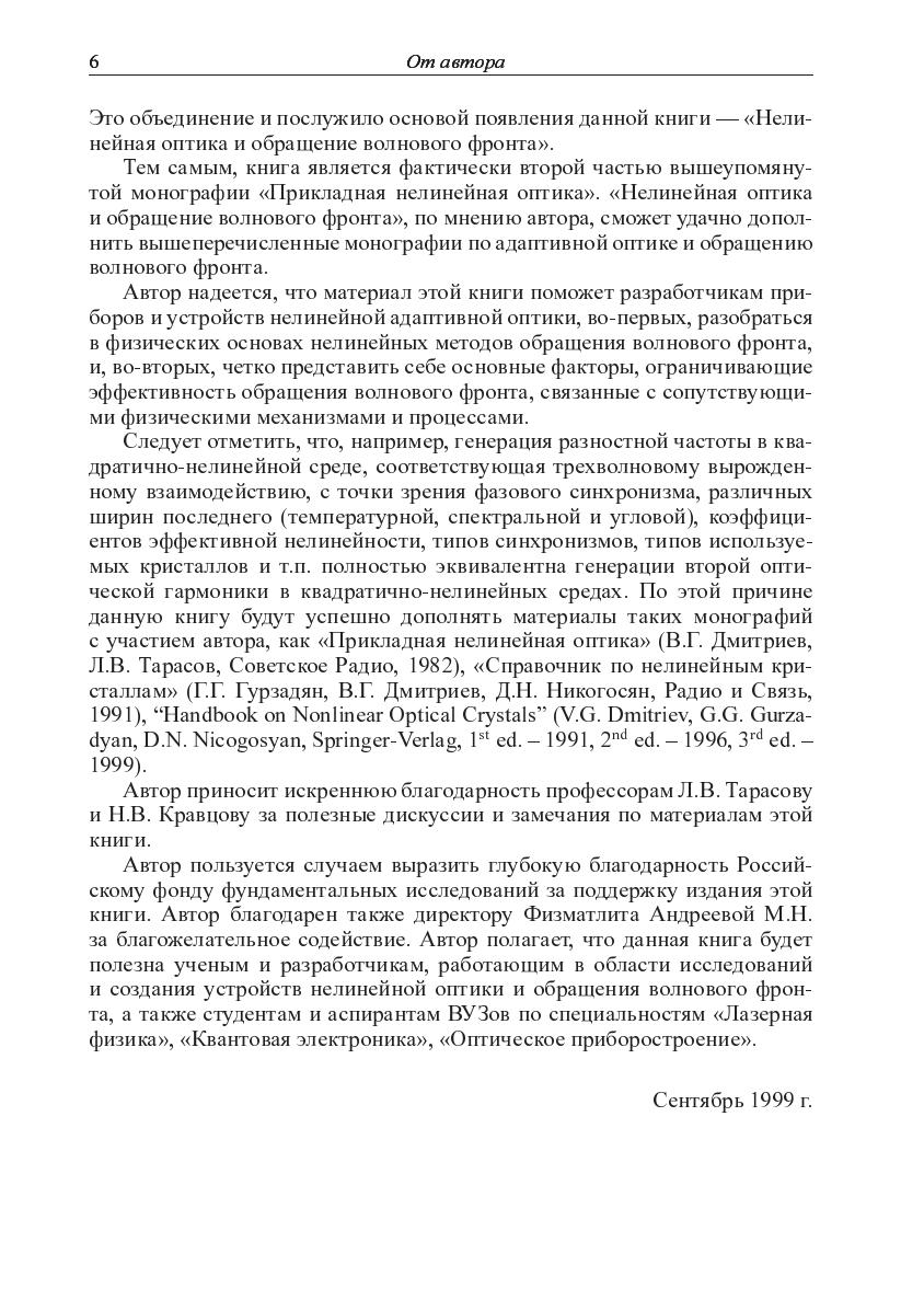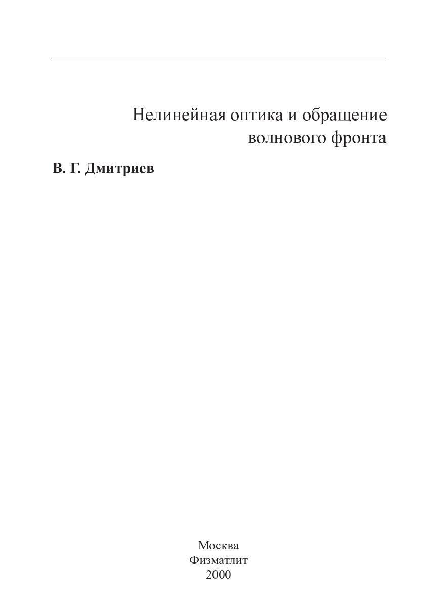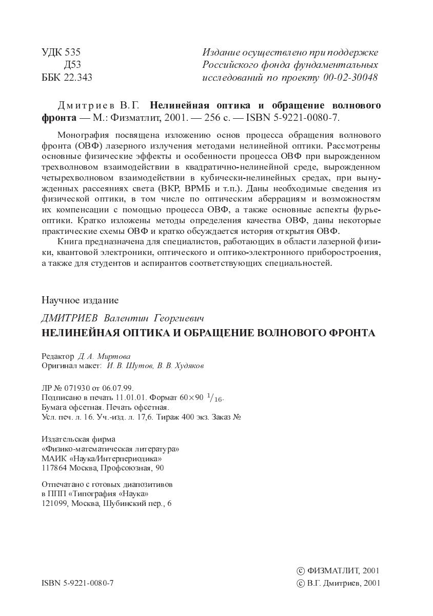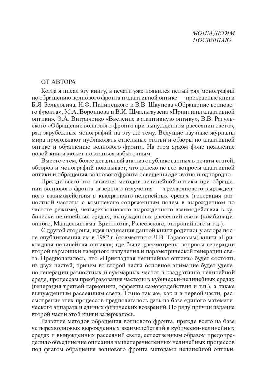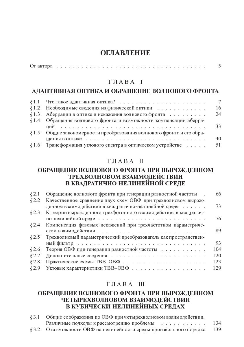 Монография посвящена изложению основ процесса обращения волнового фронта (ОВФ) лазерного излучения методами нелинейной оптики. Рассмотрены основные физические эффекты и особенности процесса ОВФ при вырожденном четырехволновом взаимодействии в кубически-нелинейных средах, при вынужденных рассеяниях света (ВКР, ВРМБ и т.п.). Даны необходимые сведения из физической оптики, в том числе по оптическим аберрациям и возможностями их компенсации с помощью процесса ОВФ, а также основные аспекты фурьеоптики. Кратко изложены методы определения качества ОВФ, даны некоторые практические схемы ОВФ и кратко обсуждаетсся история открытия ОВФ.Книга предназначена для специалистов, работающих в области лазерной физики, квантовой электроники, оптического и оптико-электронного приборостроения, а также для студентов и асперантов соответствующих специалитов.