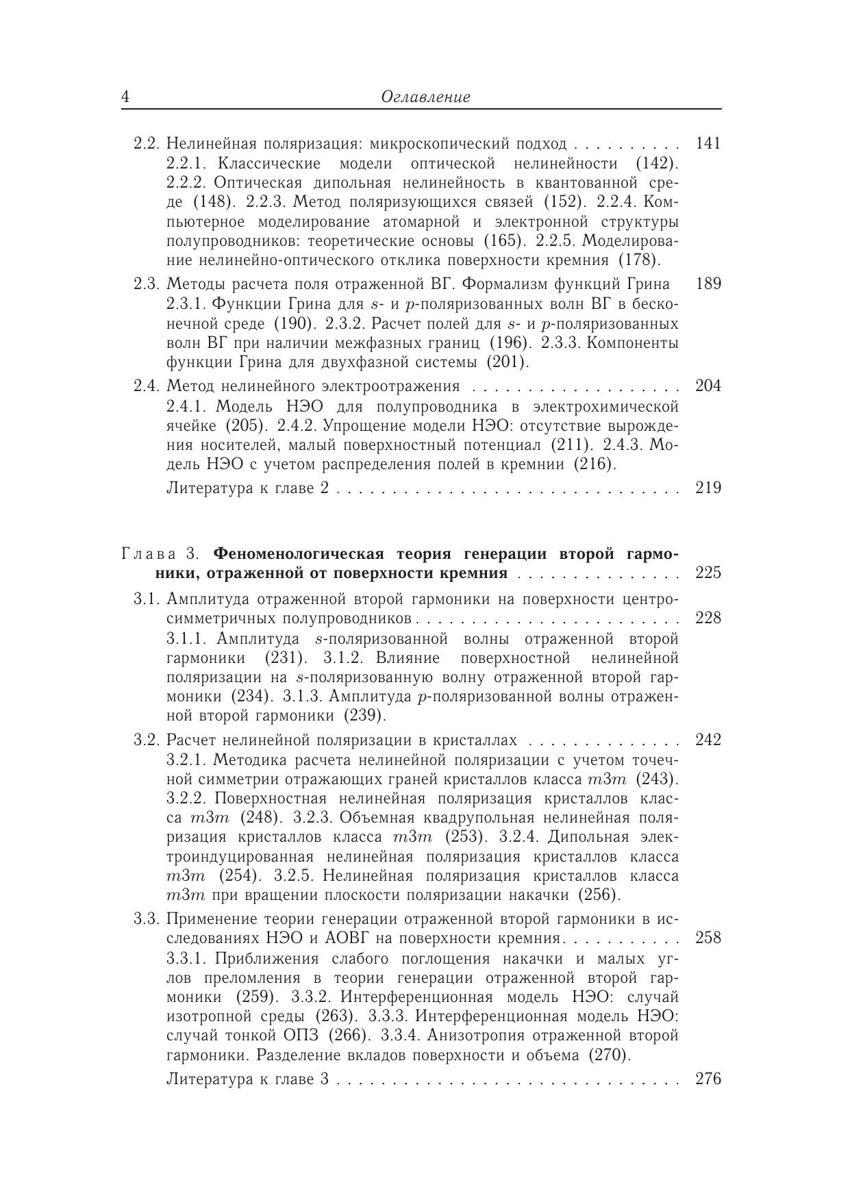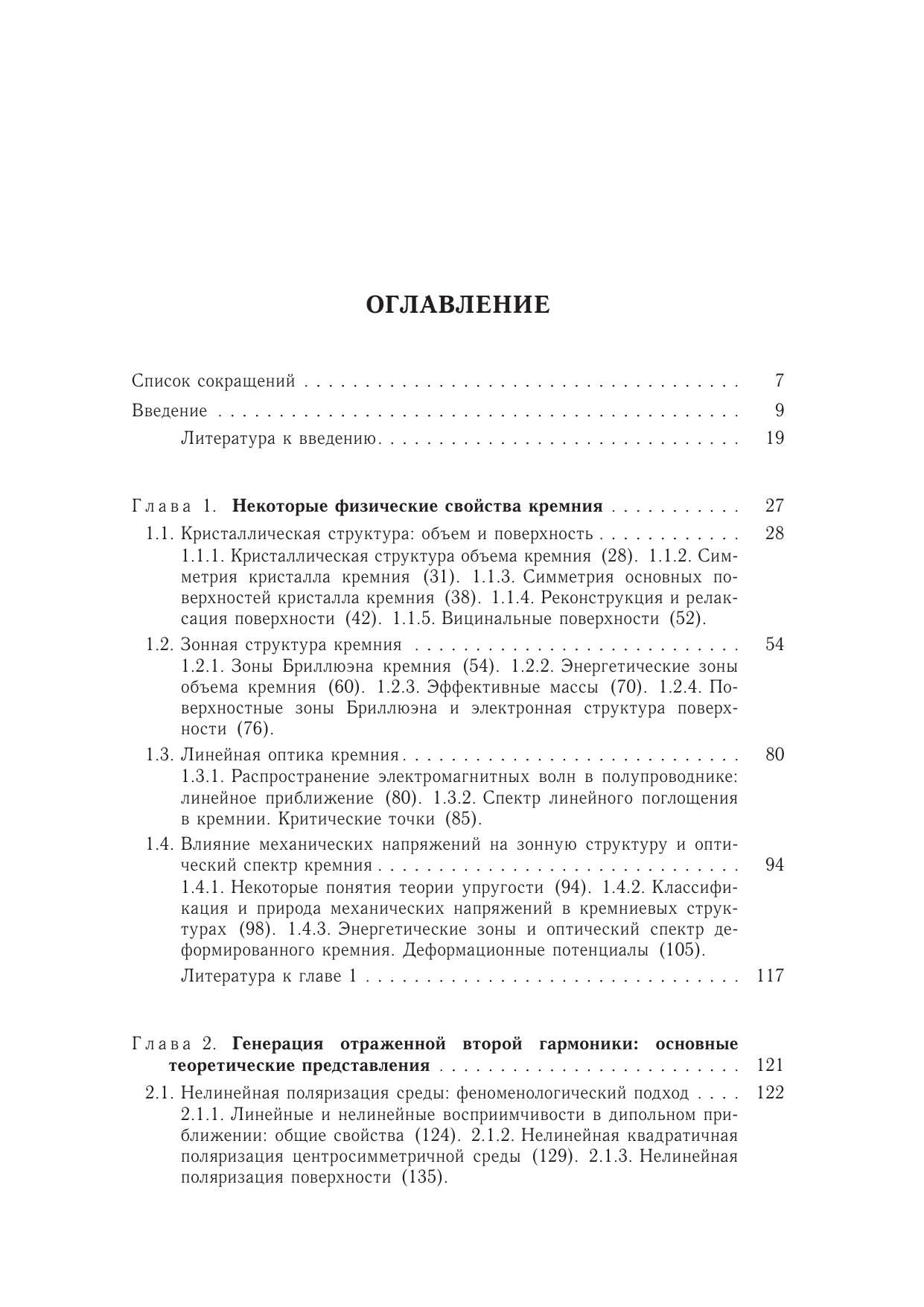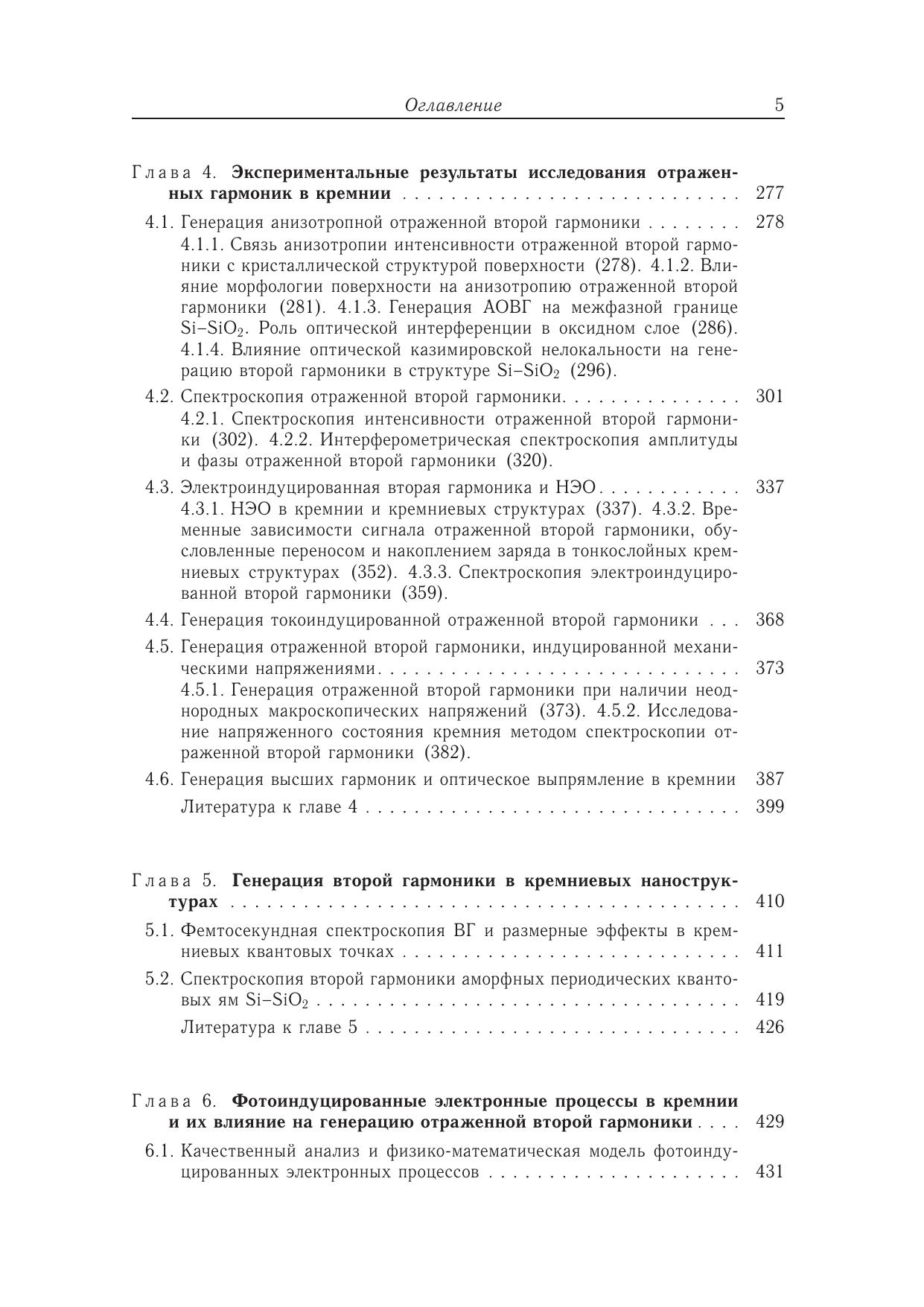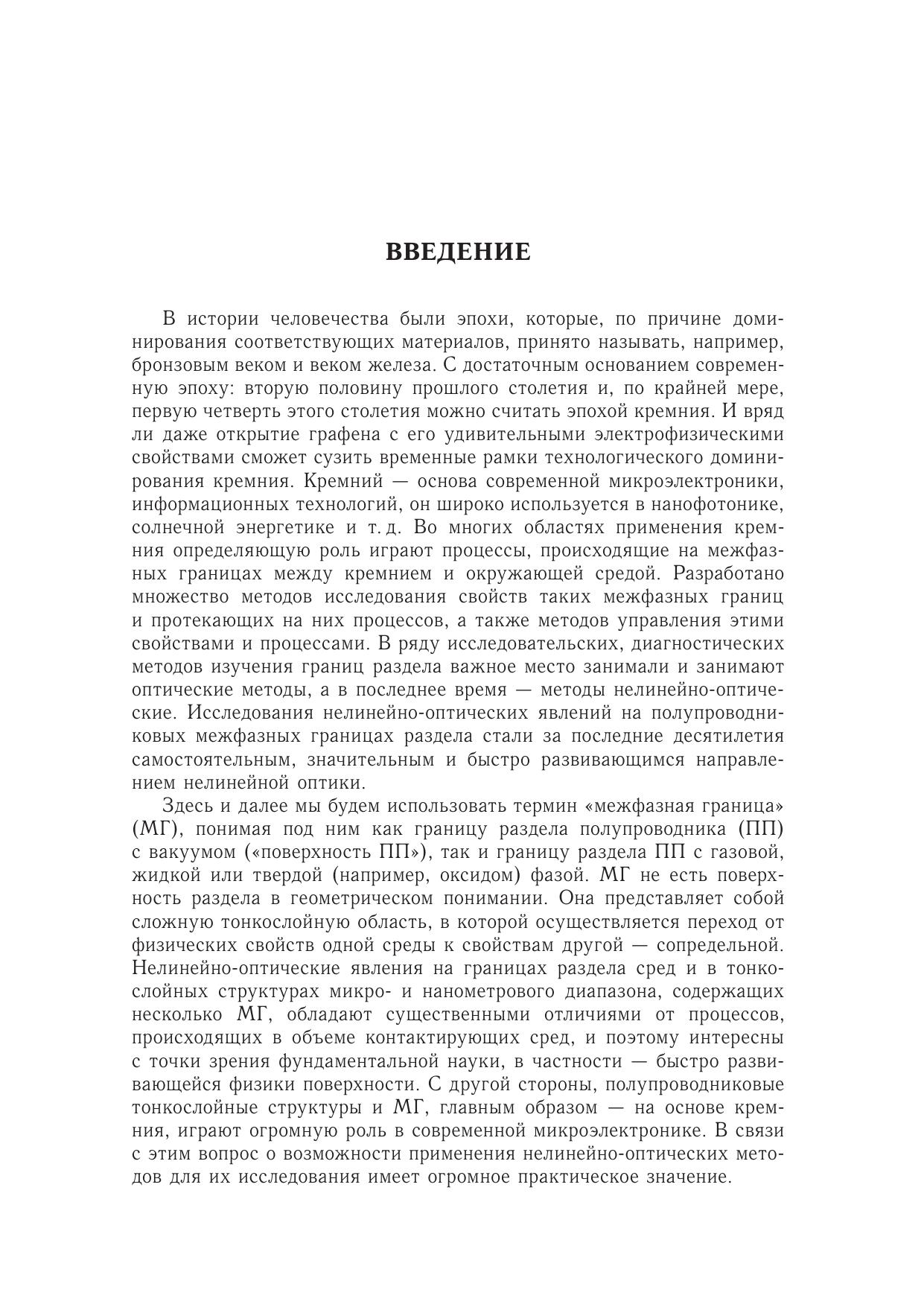 Книга сочетает в себе черты монографии и учебного пособия. Описаны физические свойства кремния, представляющие интерес с точки зрения нелинейной оптики. Изложены основы феноменологического и микроскопического подходов, используемых в теории генерации оптических гармоник в кремнии. Предложена комплексная модель генерации второй гармоники на кремниевых межфазных границах, учитывающая интерференцию различных вкладов в нелинейно-оптический отклик, анизотропию среды, фотогенерацию неравновесных носителей и многое другое. Дан подробный аналитический обзор экспериментальных работ, демонстрирующий как историю развития нелинейной оптики кремния и кремниевых наноструктур, так и ее современное состояние. Для научных сотрудников, инженеров, аспирантов и студентов старших курсов, специализирующихся в области нелинейной оптики и спектроскопии поверхности, микро- и нанотехнологии кремния.