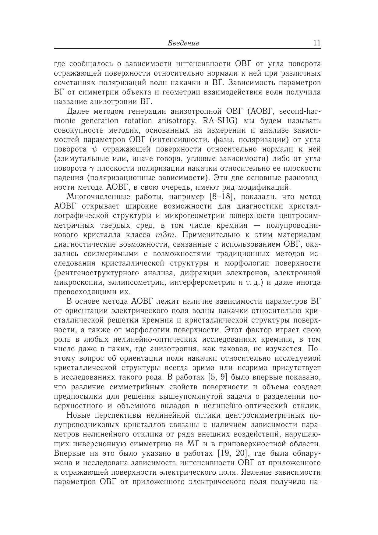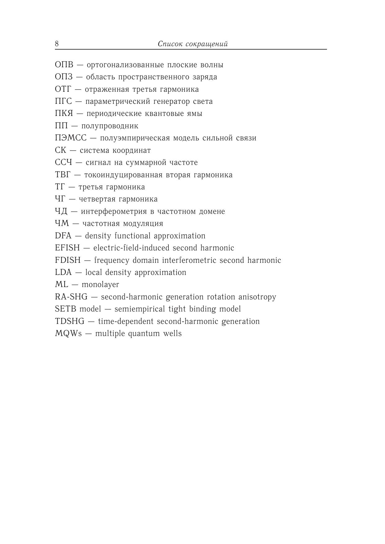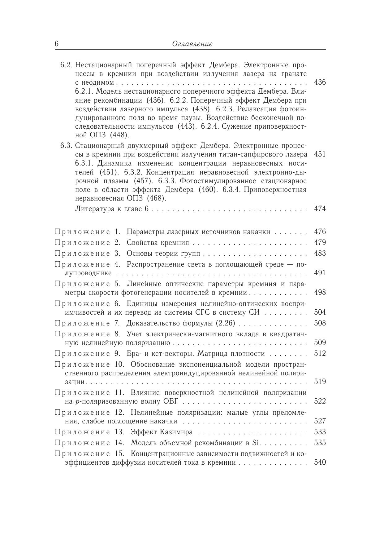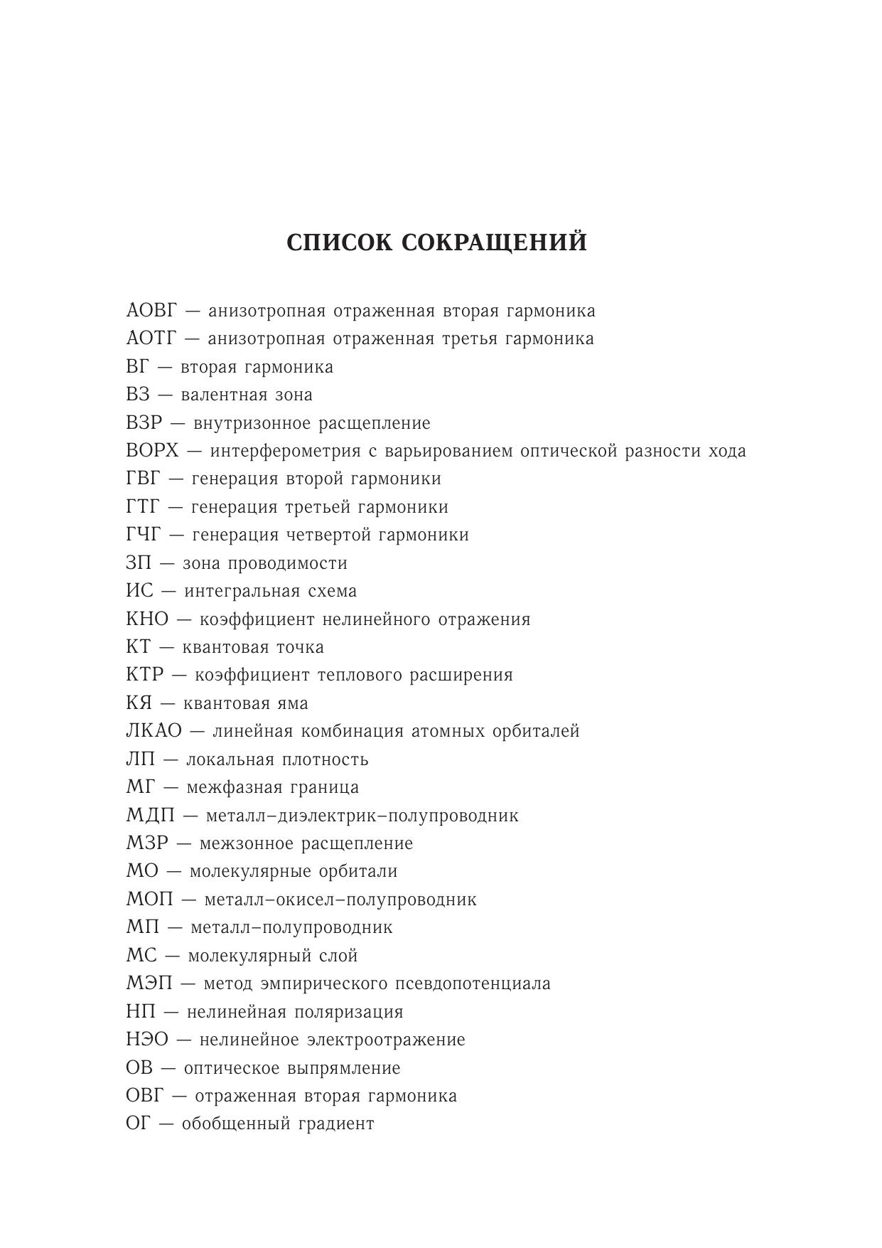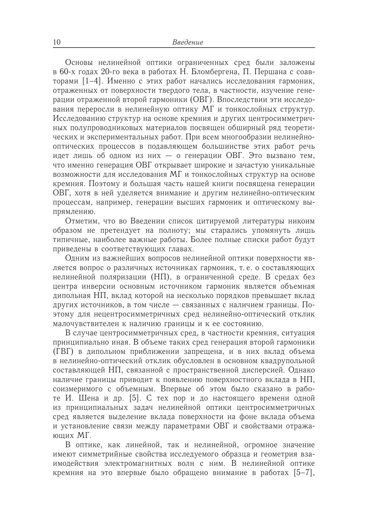 Книга сочетает в себе черты монографии и учебного пособия. Описаны физические свойства кремния, представляющие интерес с точки зрения нелинейной оптики. Изложены основы феноменологического и микроскопического подходов, используемых в теории генерации оптических гармоник в кремнии. Предложена комплексная модель генерации второй гармоники на кремниевых межфазных границах, учитывающая интерференцию различных вкладов в нелинейно-оптический отклик, анизотропию среды, фотогенерацию неравновесных носителей и многое другое. Дан подробный аналитический обзор экспериментальных работ, демонстрирующий как историю развития нелинейной оптики кремния и кремниевых наноструктур, так и ее современное состояние. Для научных сотрудников, инженеров, аспирантов и студентов старших курсов, специализирующихся в области нелинейной оптики и спектроскопии поверхности, микро- и нанотехнологии кремния.