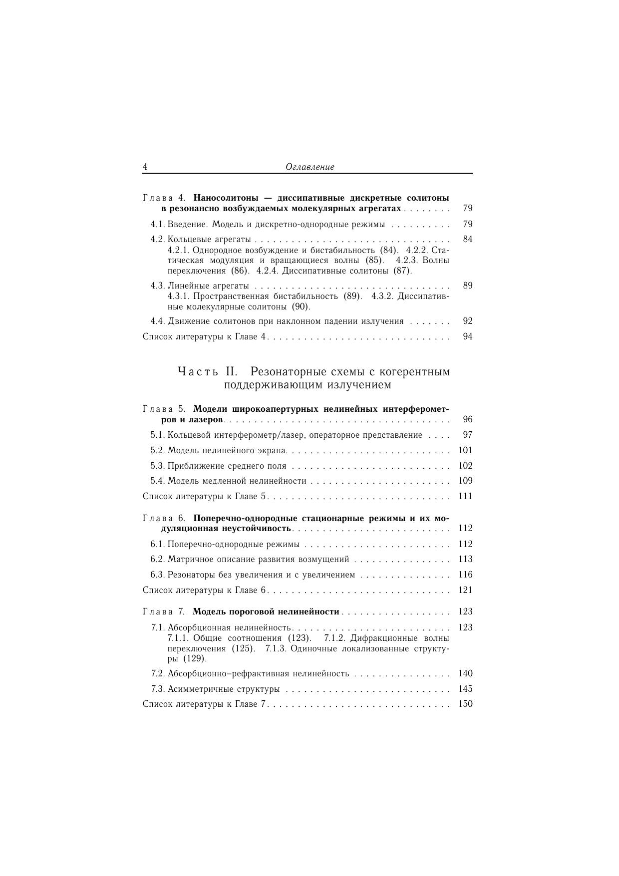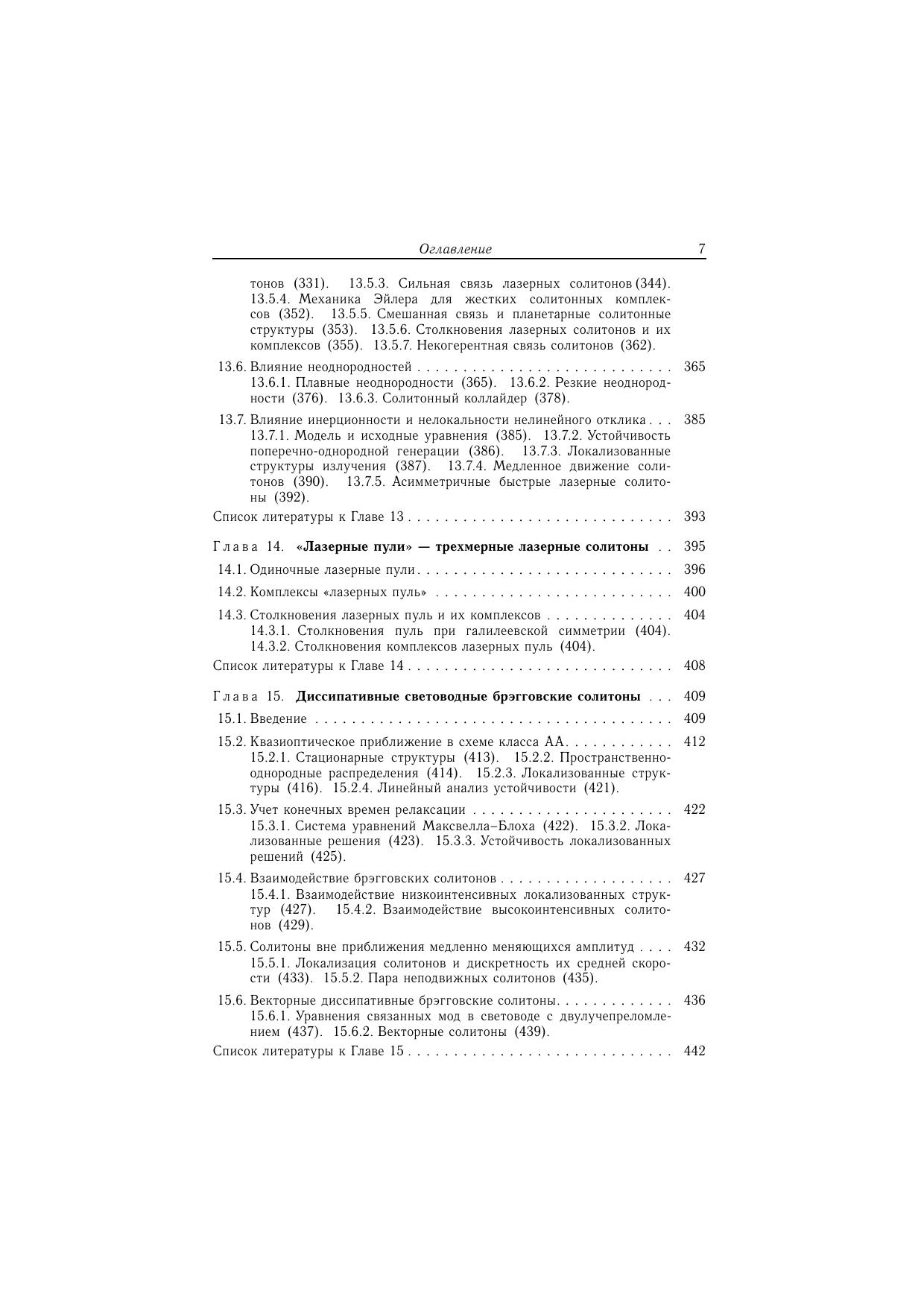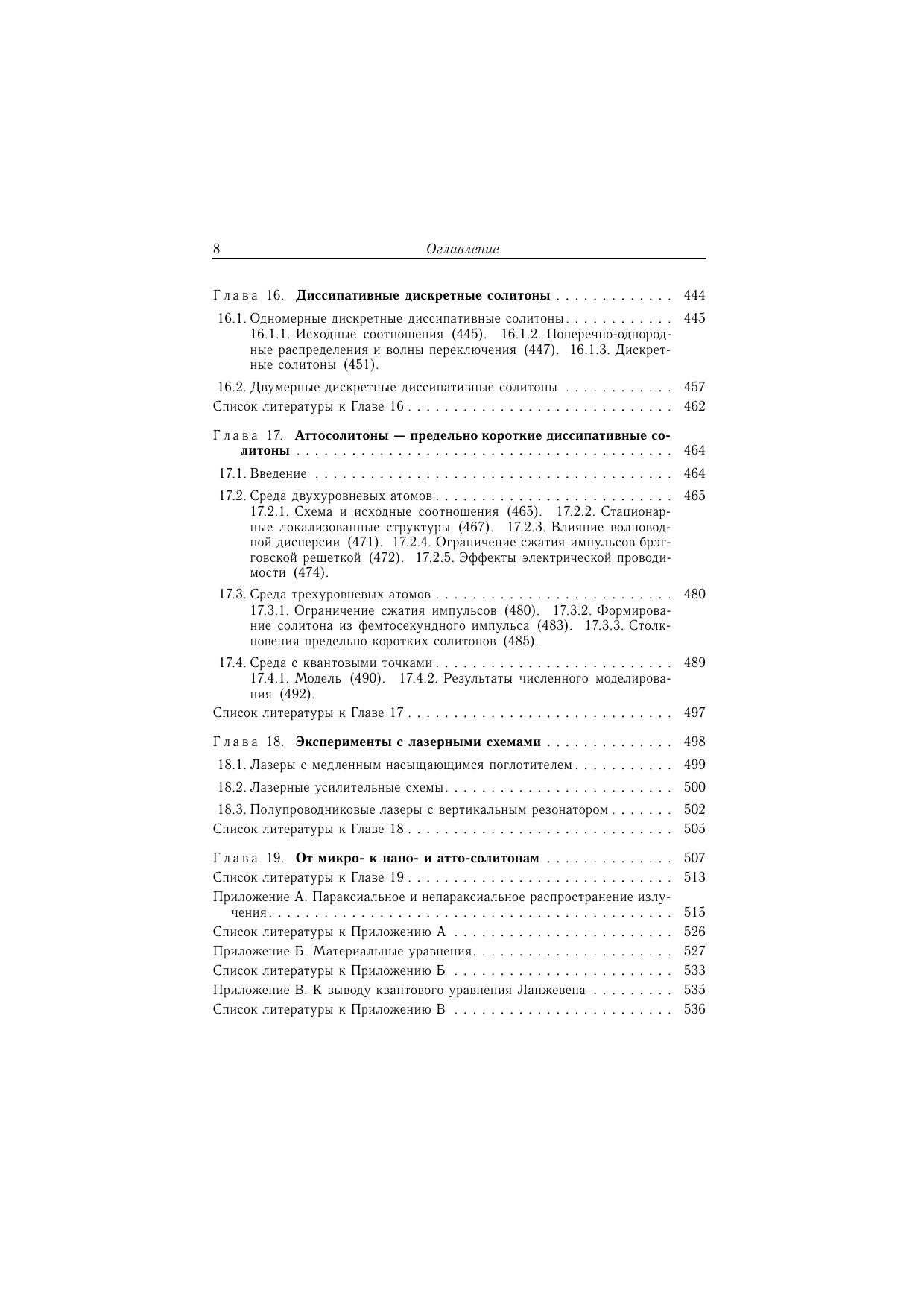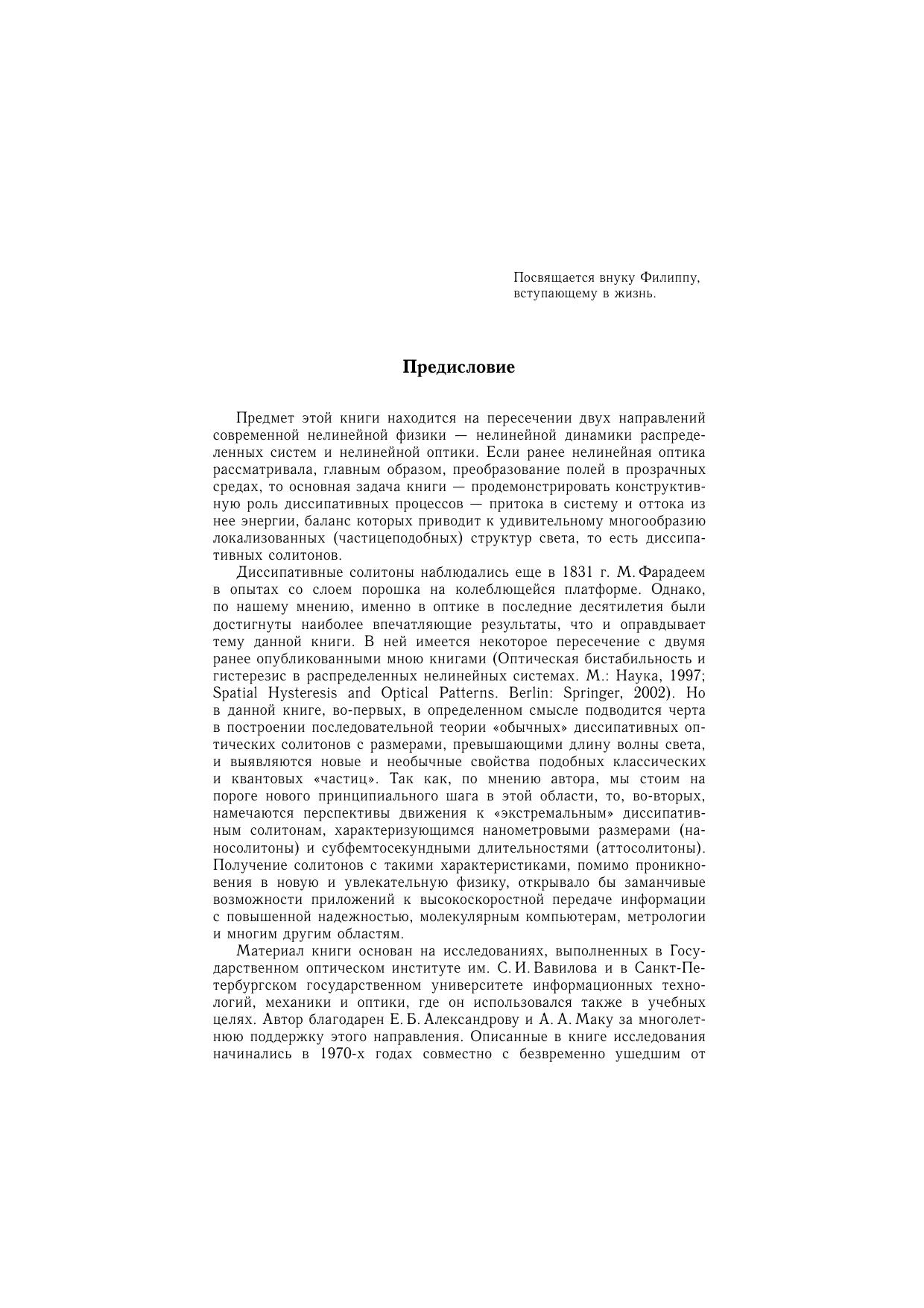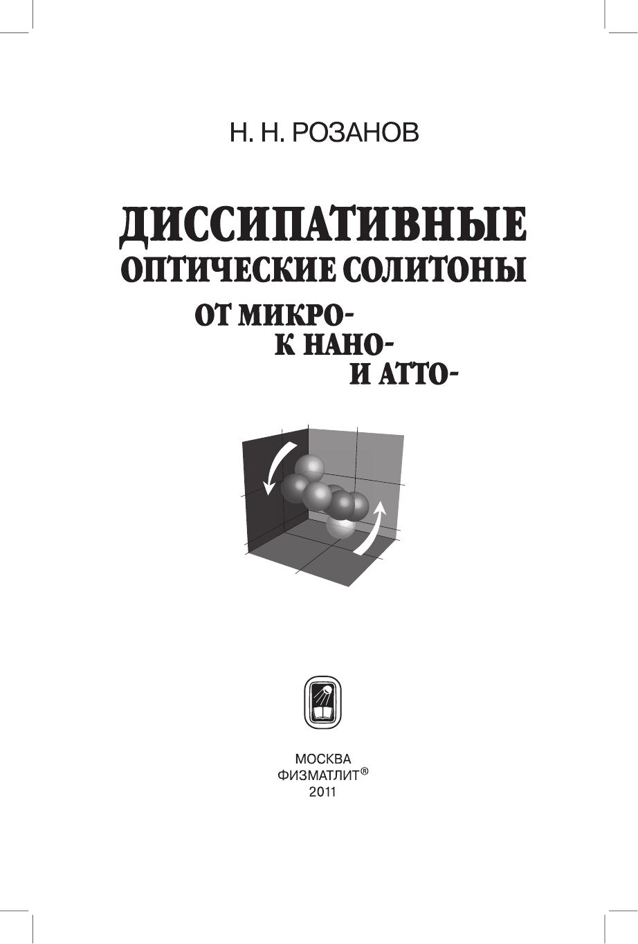 Рассмотрены общие свойства диссипативных оптических солитонов — локализованных структур света в диссипативных нелинейнооптических и лазерных средах и системах с существенным притоком и оттоком энергии. Систематически изложена теория различных типов таких одномерных, двумерных и трехмерных солитонов в пассивных и активных (с усилением), с когерентным или некогерентным поддерживающим излучением, безрезонаторных и резонаторных схемах. Введены представления о внутренней структуре диссипативных солитонов, их слабом и сильном взаимодействии, внутренней и внешней симметрии и ее связи с движением солитонов и солитонных комплексов (галилеевская, аристотелева и эйлерова механика). Представлена теория диссипативных наносолитонов (наноразмерных солитонов) и аттосолитонов (с длительностью в субфемтосекундном диапазоне). Выводы теории сопоставлены с экспериментом. Обсуждены возможные приложения к проблеме оптической обработки информации. Для научных работников, аспирантов и студентов, интересующихся современными проблемами фотоники, нелинейной оптики, лазерной физики, нанотехнологий и обработки информации.