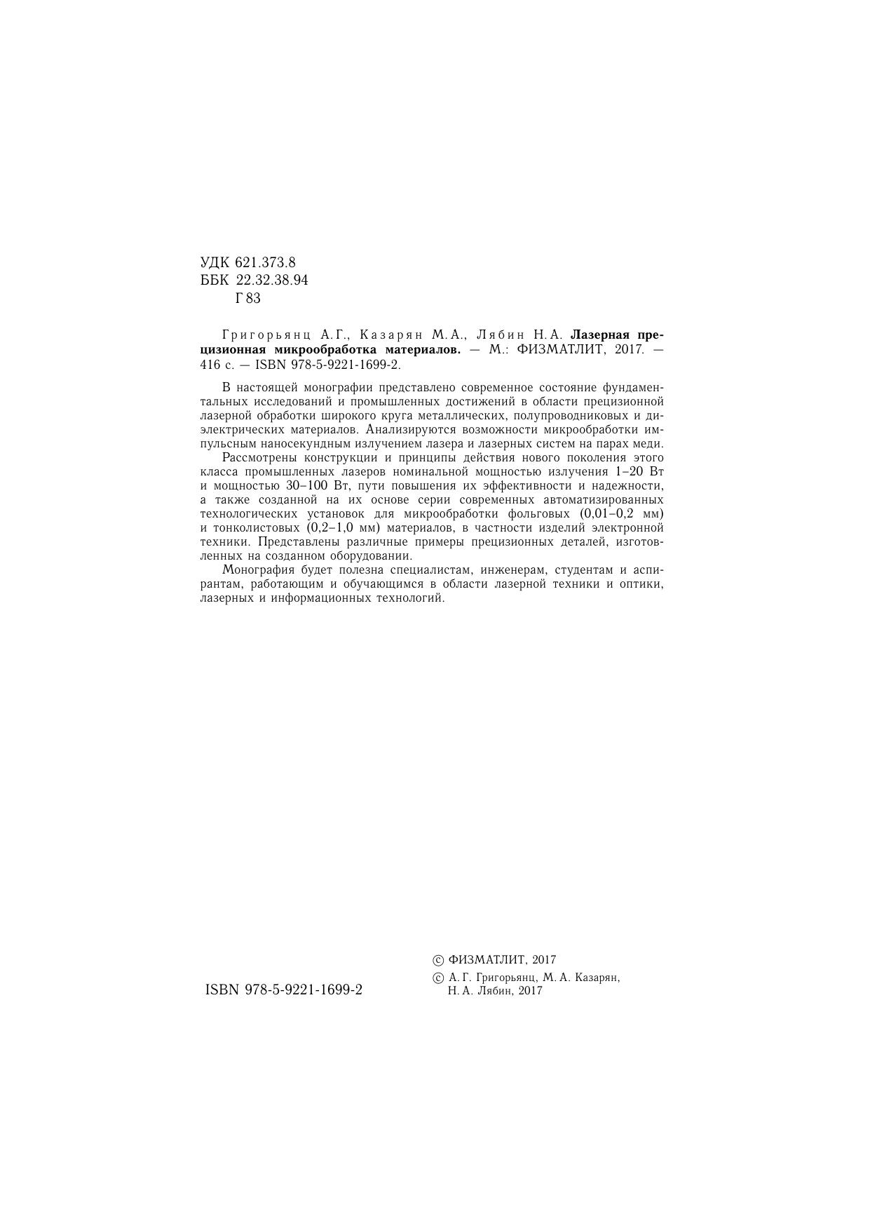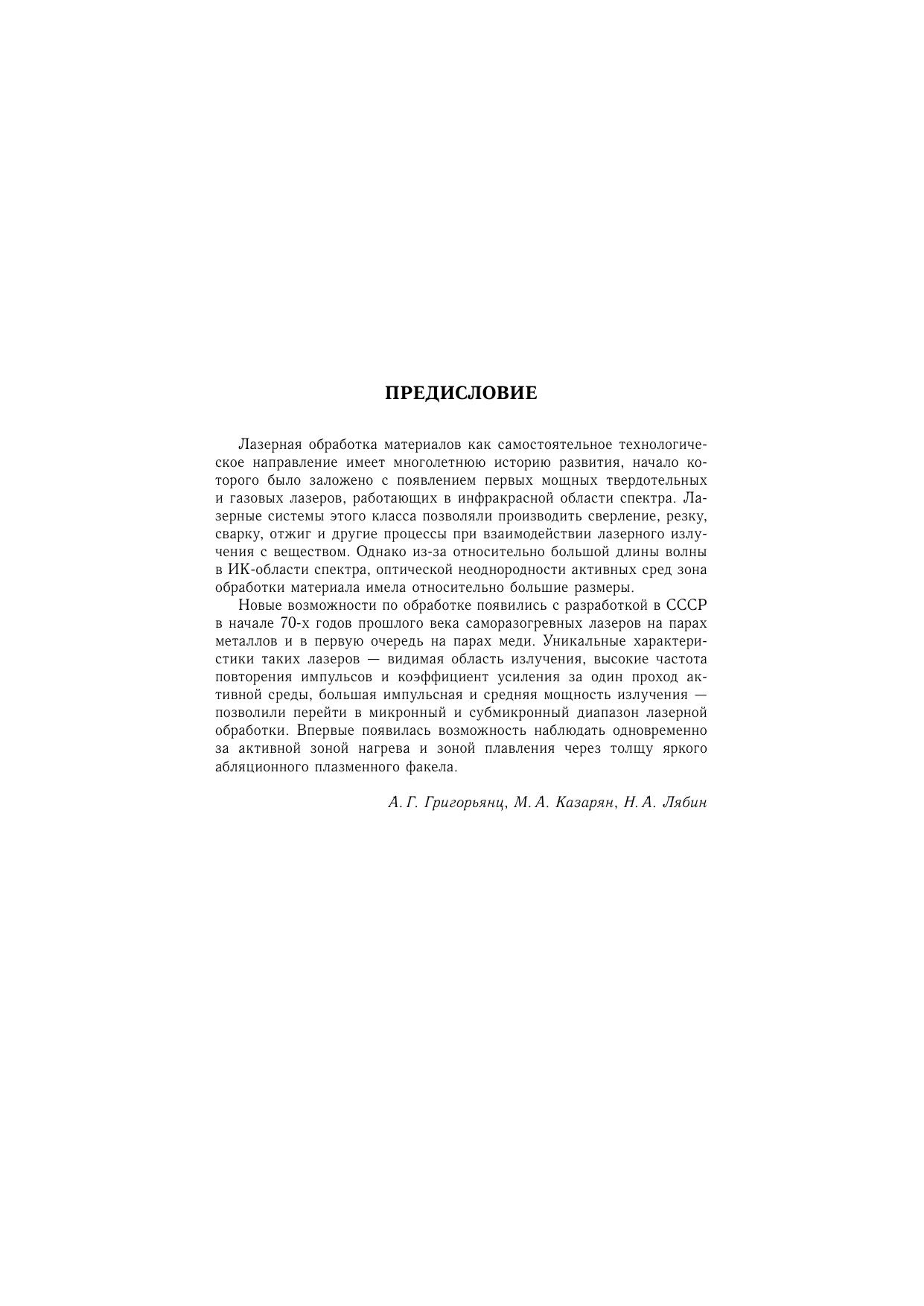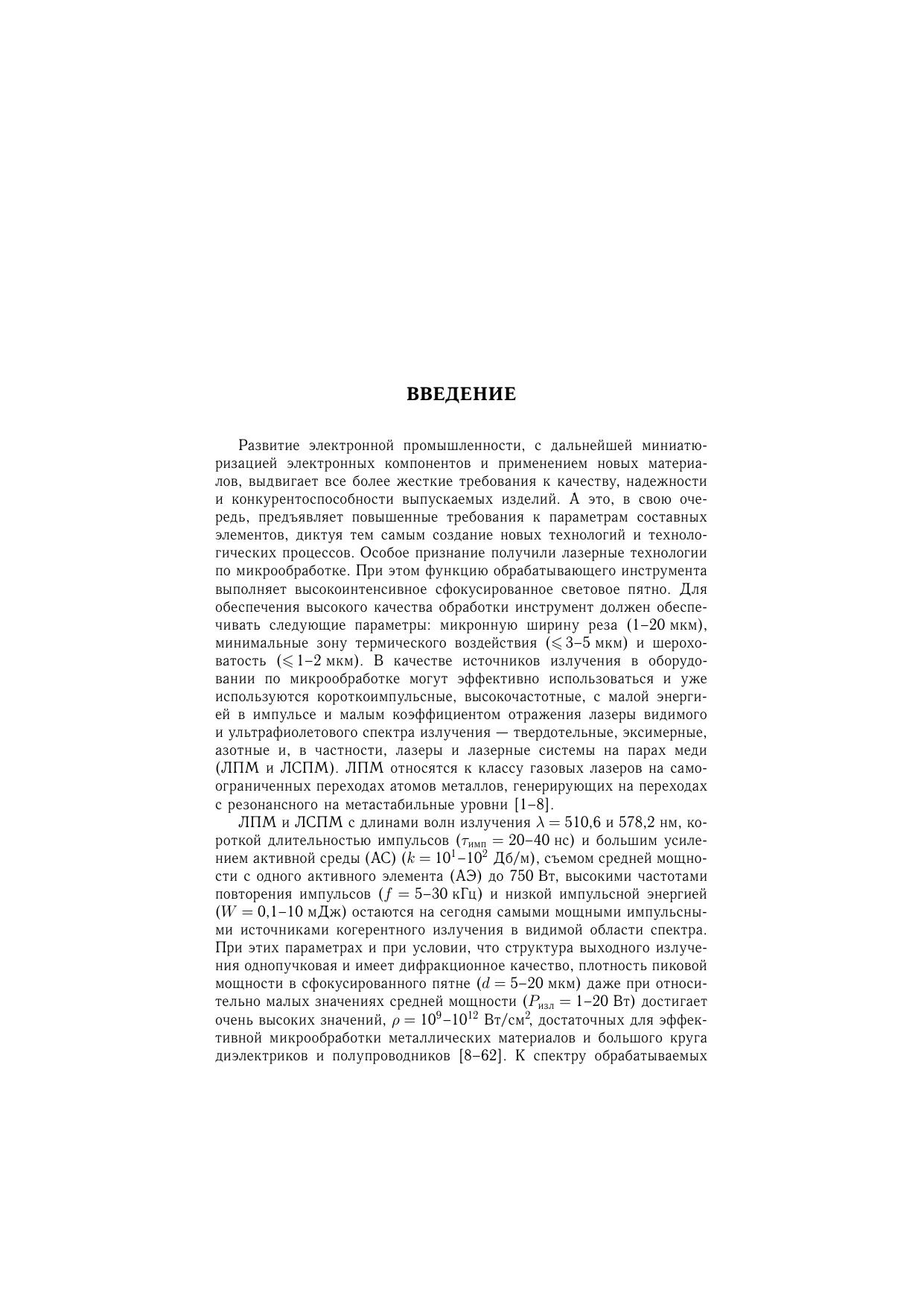 В настоящей монографии представлено современное состояние фундаментальных исследований и промышленных достижений в области прецизионной лазерной обработки широкого круга металлических, полупроводниковых и диэлектрических материалов. Анализируются возможности микрообработки импульсным наносекундным излучением лазера и лазерных систем на парах меди. Рассмотрены конструкции и принципы действия нового поколения этого класса промышленных лазеров номинальной мощностью излучения 1–20 Вт и мощностью 30–100 Вт, пути повышения их эффективности и надежности, а также созданной на их основе серии современных автоматизированных технологических установок для микрообработки фольговых (0,01–0,2 мм) и тонколистовых (0,2–1,0 мм) материалов, в частности изделий электронной техники. Представлены различные примеры прецизионных деталей, изготовленных на созданном оборудовании.