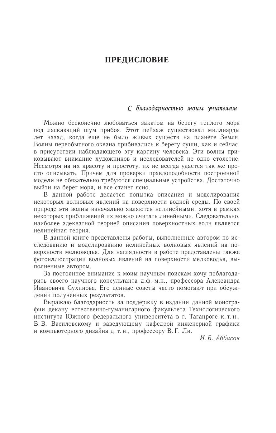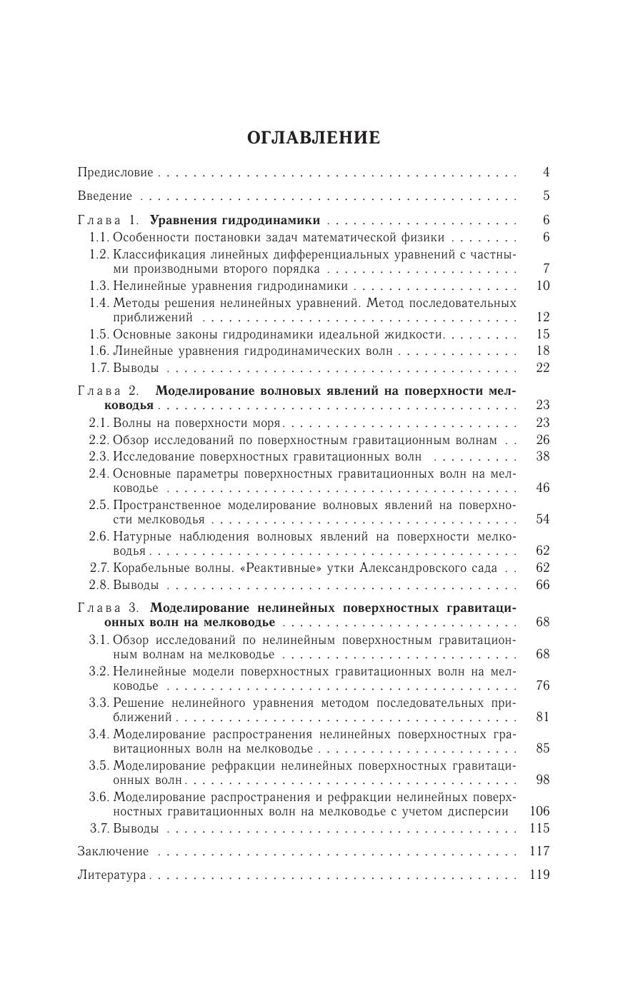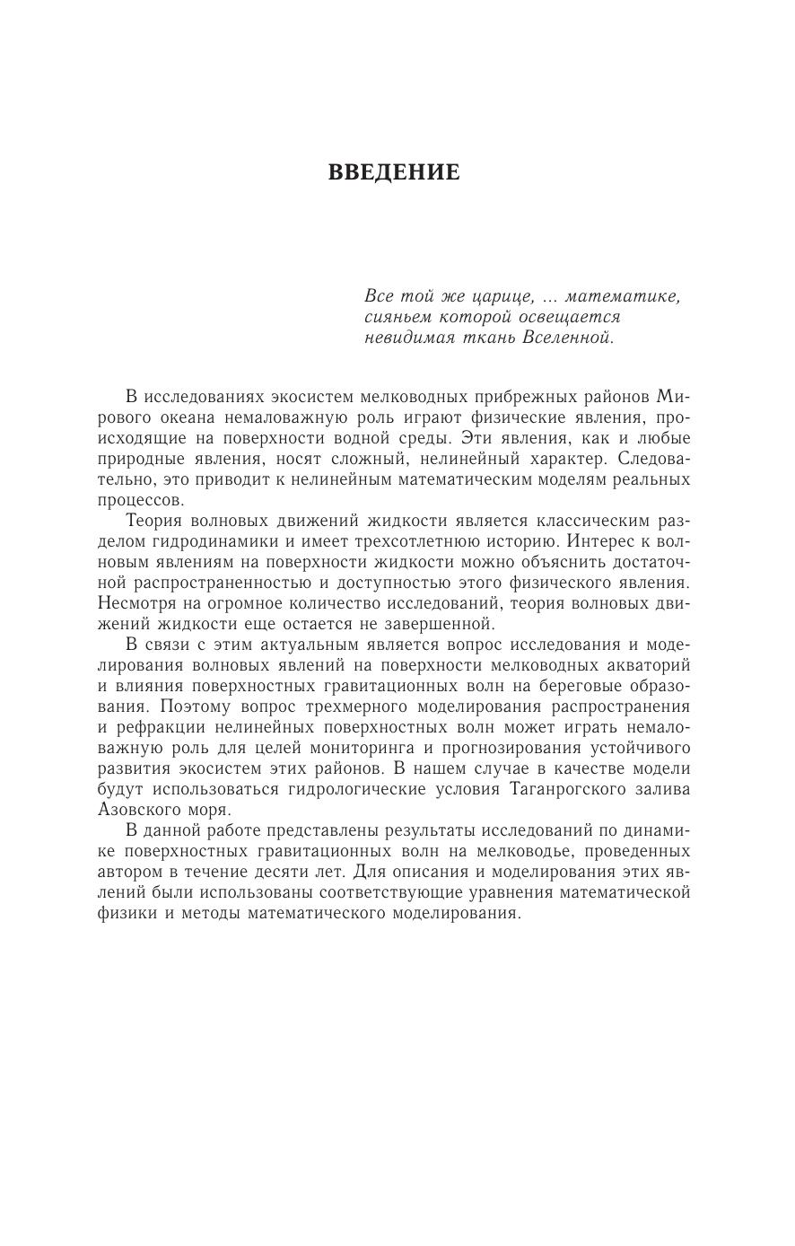 Рассмотрены вопросы моделирования нелинейных волновых явлений на поверхности мелководья. Методом последовательных приближений получены решения нелинейного уравнения в двух приближениях. С помощью предложенного графоаналитического способа описана трансформация профиля поверхностных гравитационных волн на этапах заострения гребней, укручения их переднего фронта. Рассмотрено влияние спектральных составляющих на процесс трансформации профиля волны, описаны причины возникновения асимметрий. На основе полученных аналитических выражений учтены влияния эффектов дисперсии на трансформацию профиля волн. Представлены пространственно-трехмерные модели распространения и рефракции нелинейных поверхностных гравитационных волн на различных береговых образованиях. Для научных работников и специалистов в области моделирования волновой гидродинамики.