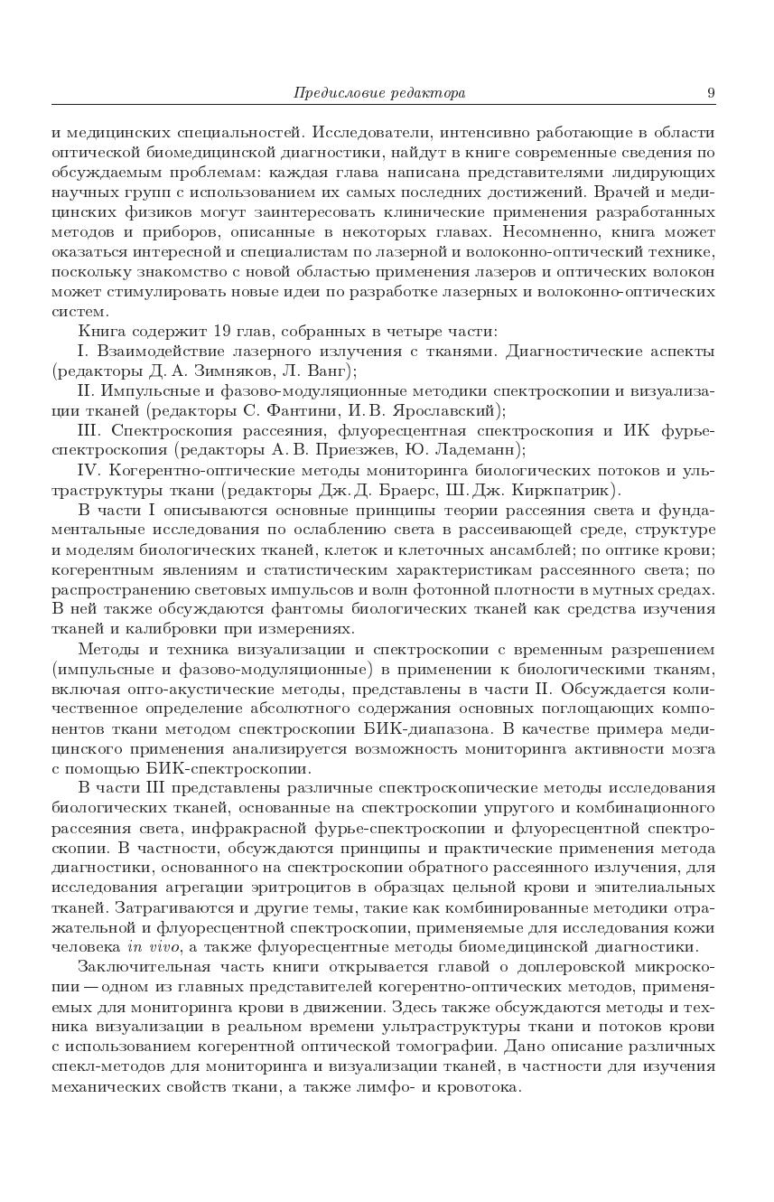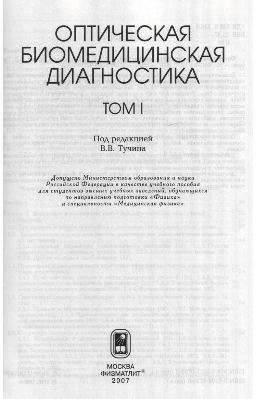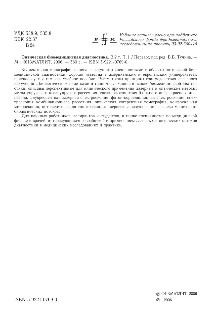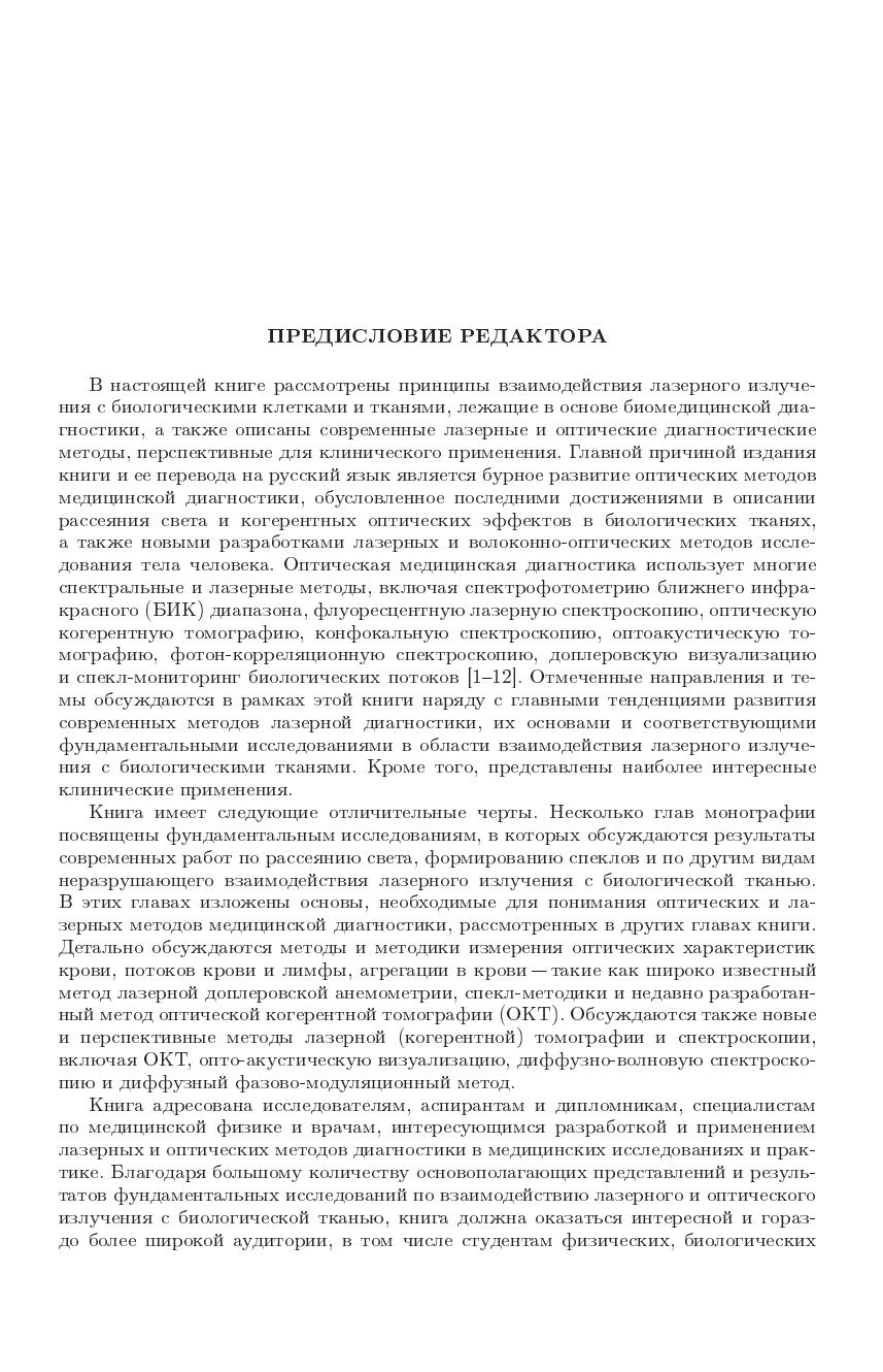 Коллективная монография написана ведущими специалистами в области оптической биомедицинской диагностики, хорошо известна в американских и европейских университетах и используется там как учебное пособие. Рассмотрены принципы взаимодействия лазерного излучения с биологическими клетками и тканями, лежащие в основе биомедицинской диагностики описаны перспективные для клинического применения лазерные и оптические методы: метод упругого и квазиупругого рассеяния, спектрофотометрия ближнего инфракрасного диапазона, флуоресцентная лазерная спектроскопия, фотон-корреляционная спектроскопия, спектроскопия комбинационного рассеяния, оптическая когерентная томография, конфокальная микроскопия, оптоакустическая томография, доплеровская визуализация и спекл-мониторинг биологических потоков.Для научных работников, аспирантов и студентов, а также специалистов по медицинской физике и врачей, интересующихся разработкой и применением лазерных и оптических методов диагностики в медицинских исследованиях и практике.