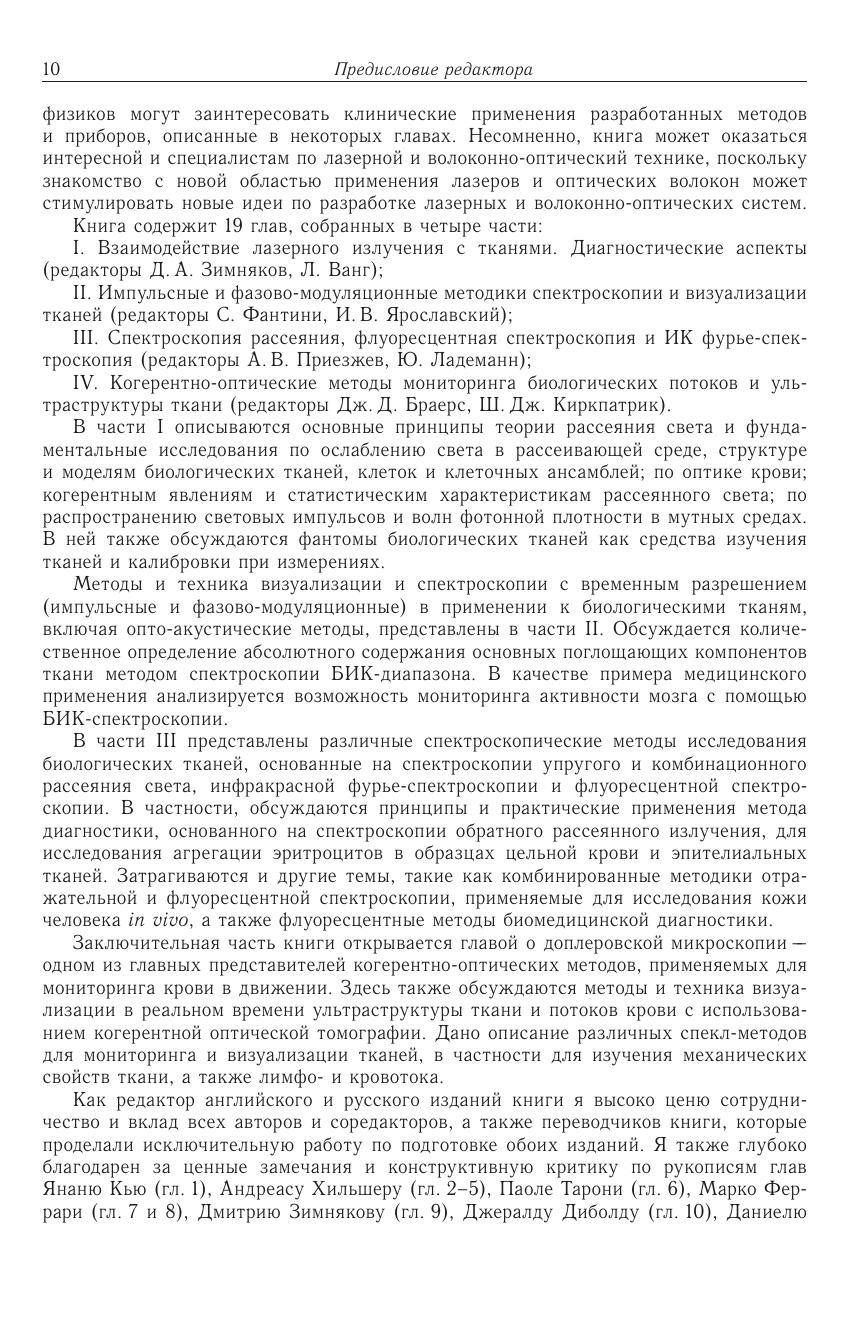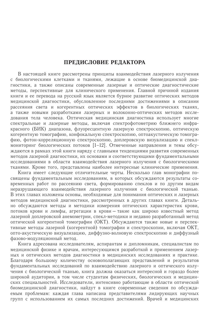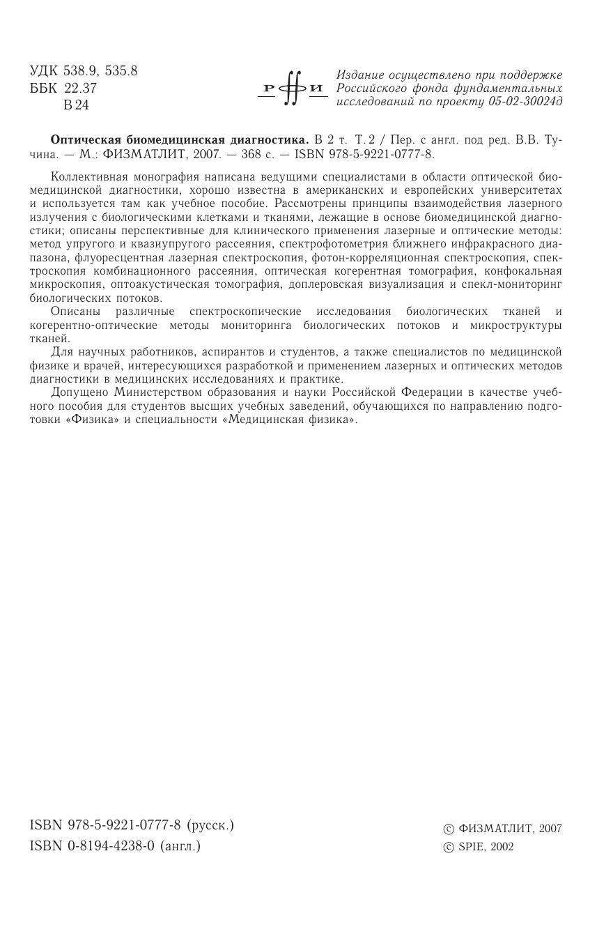 Коллективная монография написана ведущими специалистами в области оптической биомедицинской диагностики, хорошо известна в американских и европейских университетах и используется там как учебное пособие. Рассмотрены принципы взаимодействия лазерного излучения с биологическими клетками и тканями, лежащие в основе биомедицинской диагностики описаны перспективные для клинического применения лазерные и оптические методы: метод упругого и квазиупругого рассеяния, спектрофотометрия ближнего инфракрасного диапазона, флуоресцентная лазерная спектроскопия, фотон-корреляционная спектроскопия, спектроскопия комбинационного рассеяния, оптическая когерентная томография, конфокальная микроскопия, оптоакустическая томография, доплеровская визуализация и спекл-мониторинг биологических потоков. Описаны различные спектроскопические исследования биологических тканей и когерентно-оптические методы мониторинга биологических потоков и микроструктуры тканей.Для научных работников, аспирантов и студентов, а также специалистов по медицинской физике и врачей, интересующихся разработкой и прим енением лазерных и оптических методов диагностики в медицинских исследованиях и практике.