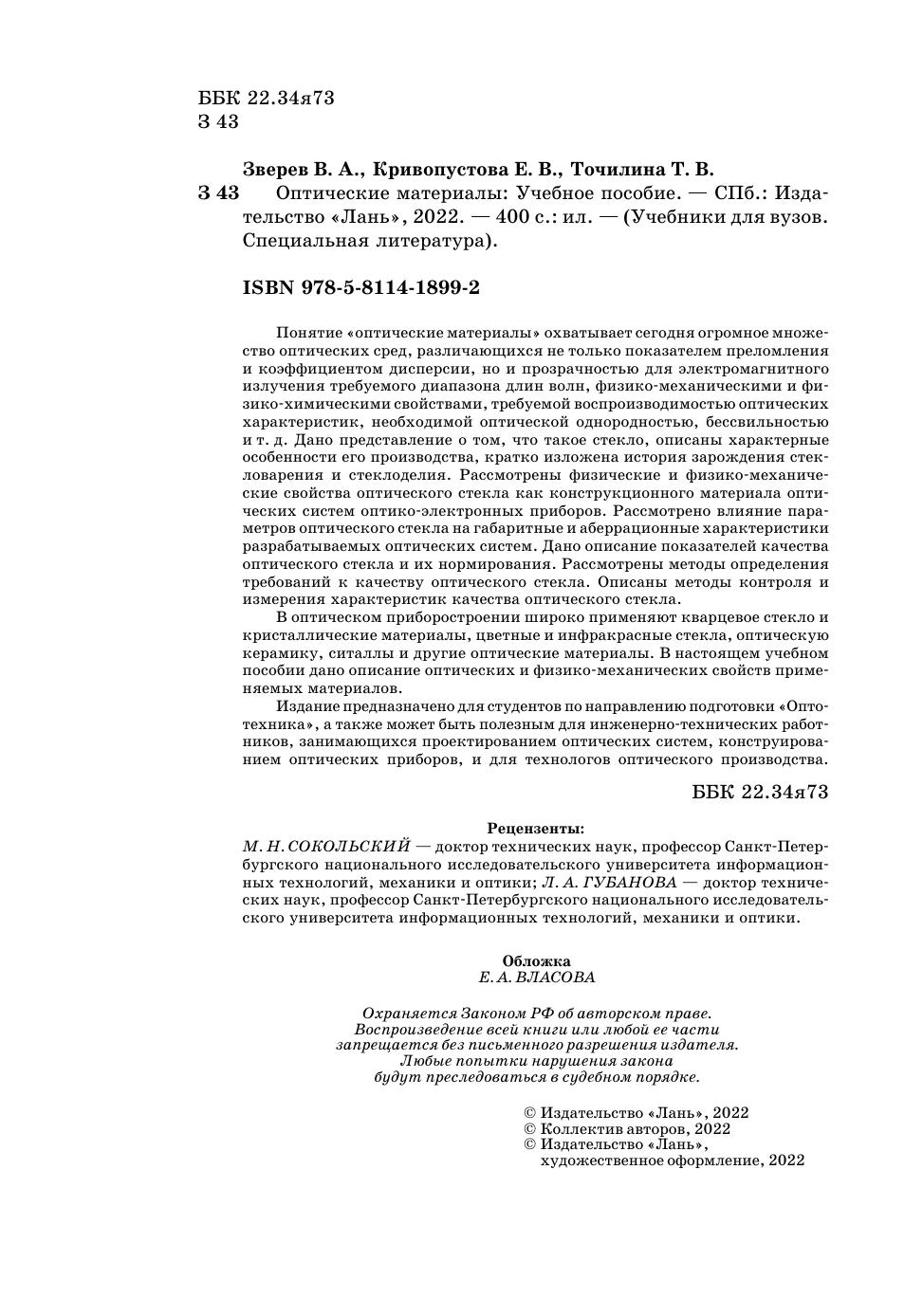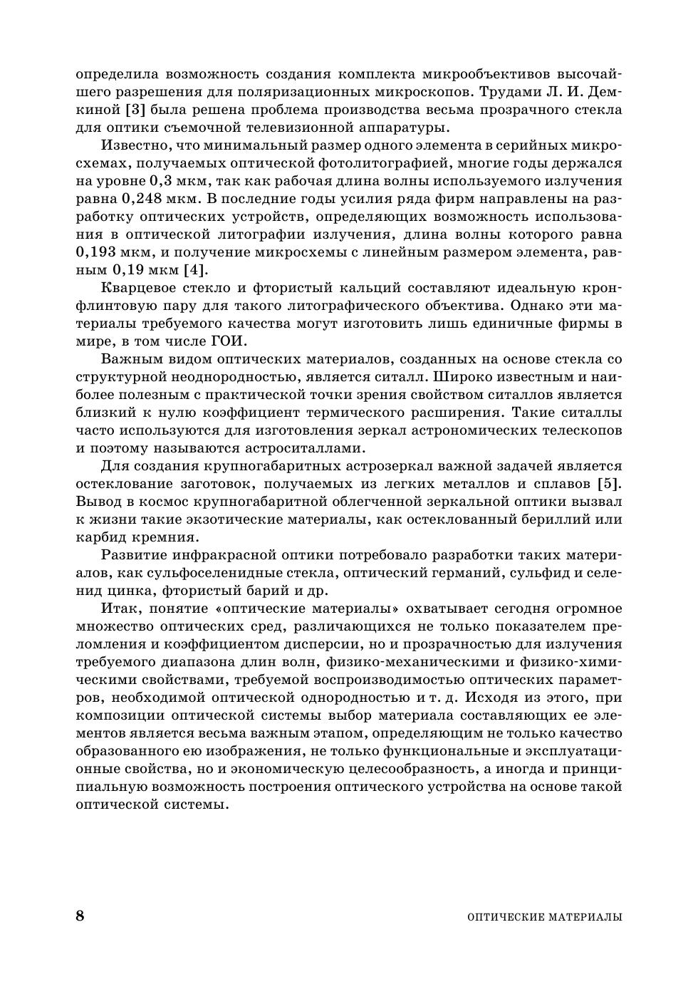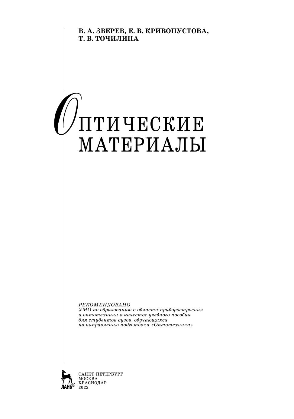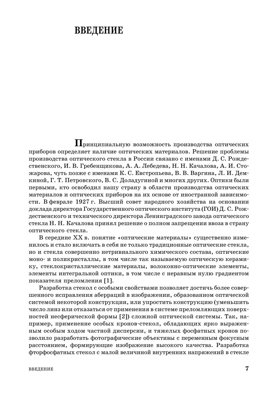 Понятие «оптические материалы» охватывает сегодня огромное множество оптических сред, различающихся не только показателем преломления и коэффициентом дисперсии, но и прозрачностью для электромагнитного излучения требуемого диапазона длин волн, физико-механическими и физико-химическими свойствами, требуемой воспроизводимостью оптических характеристик, необходимой оптической однородностью, бессвильностью и т.д. Дано представление о том, что такое стекло, описаны характерные особенности его производства, кратко изложена история зарождения стекловарения и стеклоделия. Рассмотрены физические и физико-механические свойства оптического стекла как конструкционного материала оптических систем оптико-электронных приборов. Рассмотрено влияние параметров оптического стекла на габаритные и аберрационные характеристики разрабатываемых оптических систем. Дано описание показателей качества оптического стекла и их нормирования. Рассмотрены методы определения требований к качеству оптического стекла. Описаны методы контроля и измерения характеристик качества оптического стекла. В оптическом приборостроении широко применяют кварцевое стекло и кристаллические материалы, цветные и инфракрасные стёкла, оптическую керамику, ситаллы и другие оптические материалы. В настоящем учебном пособии дано описание оптических и физико-механических свойств применяемых материалов. Издание предназначено для студентов по направлению подготовки «Оптотехника», а также может быть полезным для инженерно-технических работников, занимающихся проектированием оптических систем, конструированием оптических приборов и для технологов оптического производства.