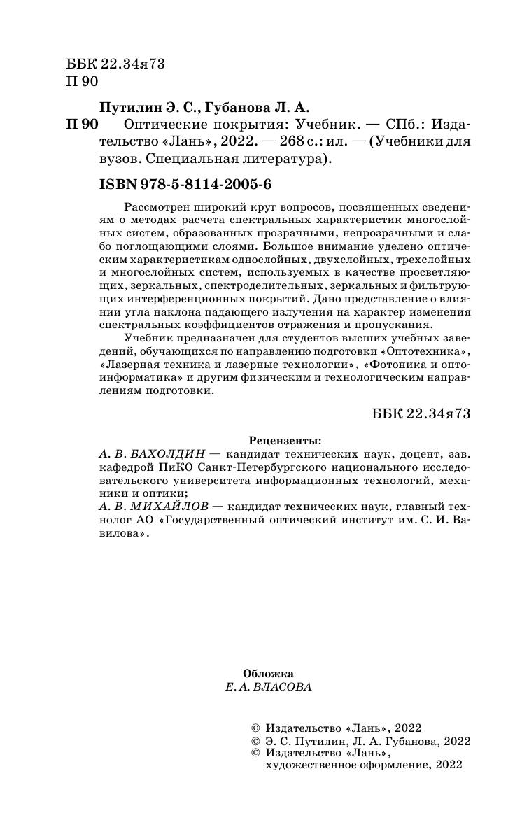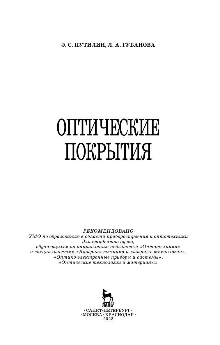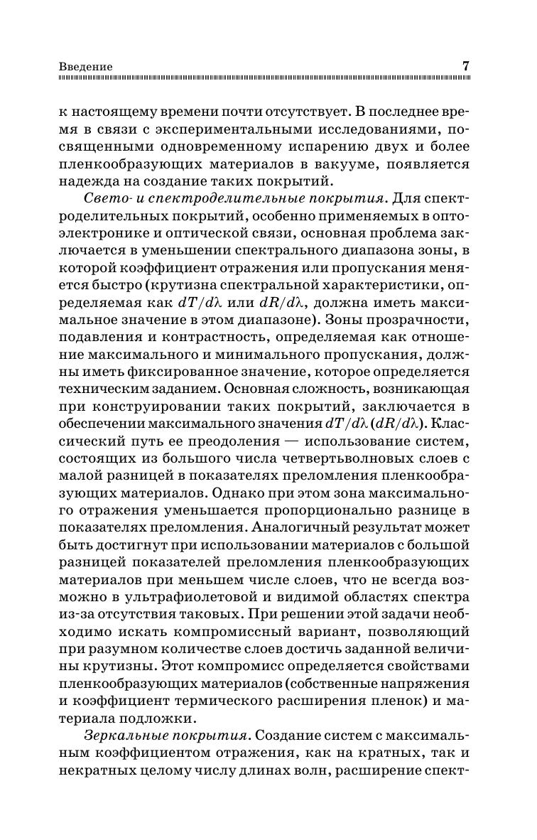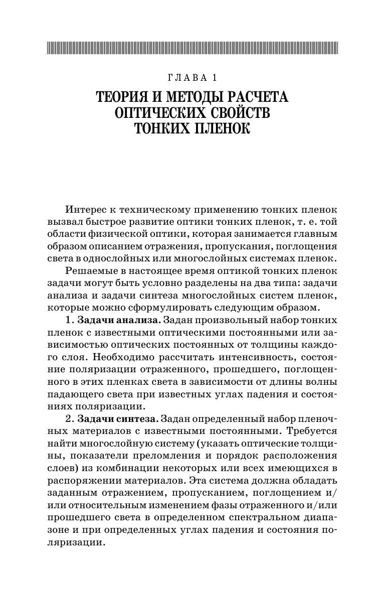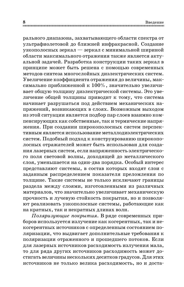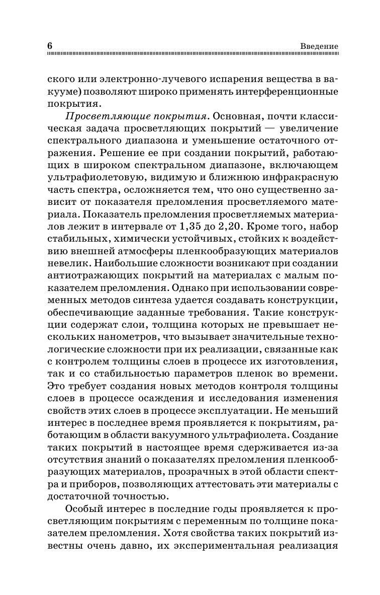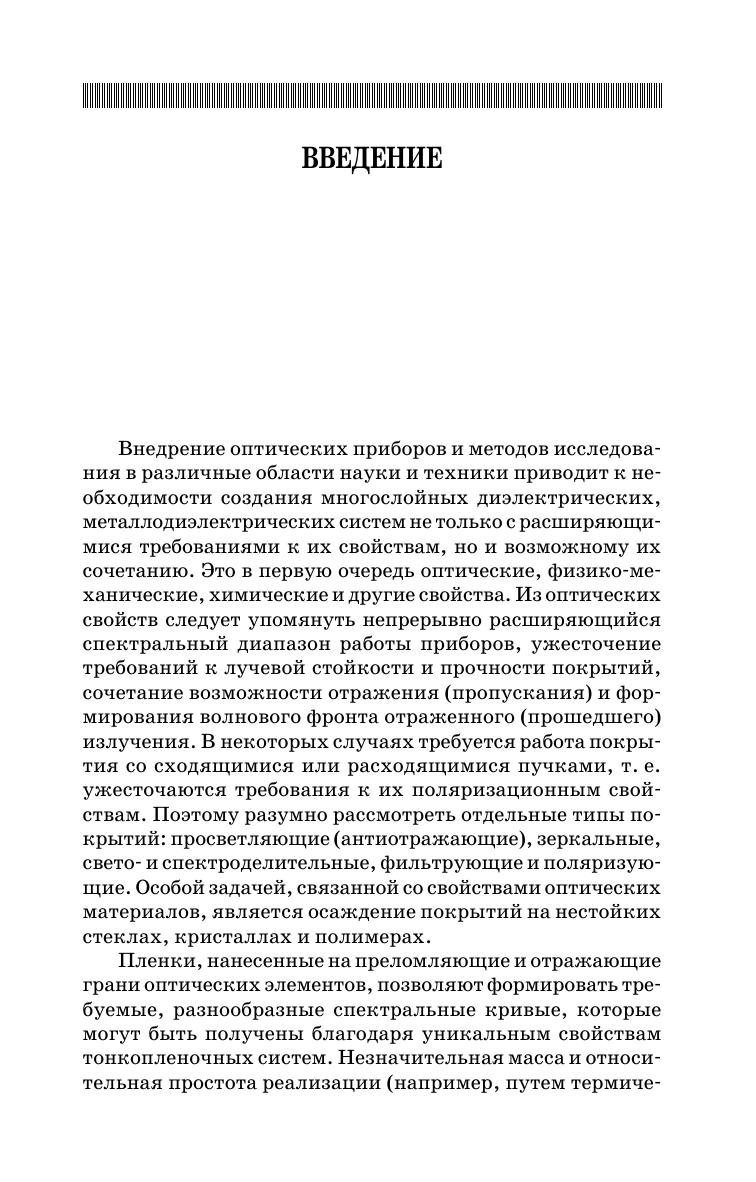 Рассмотрен широкий круг вопросов, посвященных сведениям о методах расчета спектральных характеристик многослойных систем, образованных прозрачными, непрозрачными и слабо поглощающими слоями. Большое внимание уделено оптическим характеристикам однослойных, двухслойных, трехслойных и многослойных систем, используемых в качестве просветляющих, зеркальных, спектроделительных, зеркальных и фильтрующих интерференционных покрытий. Дано представление о влиянии угла наклона падающего излучения на характер изменения спектральных коэффициентов отражения и пропускания. Учебник предназначен для студентов высших учебных заведений, обучающихся по направлению подготовки «Оптотехника», «Лазерная техника и лазерные технологии», «Фотоника и оптоинформатика» и другим физическим и технологическим направлениям подготовки.