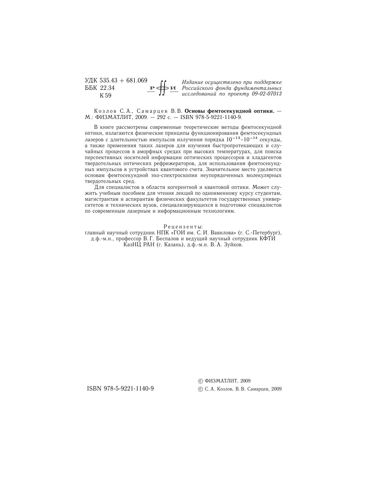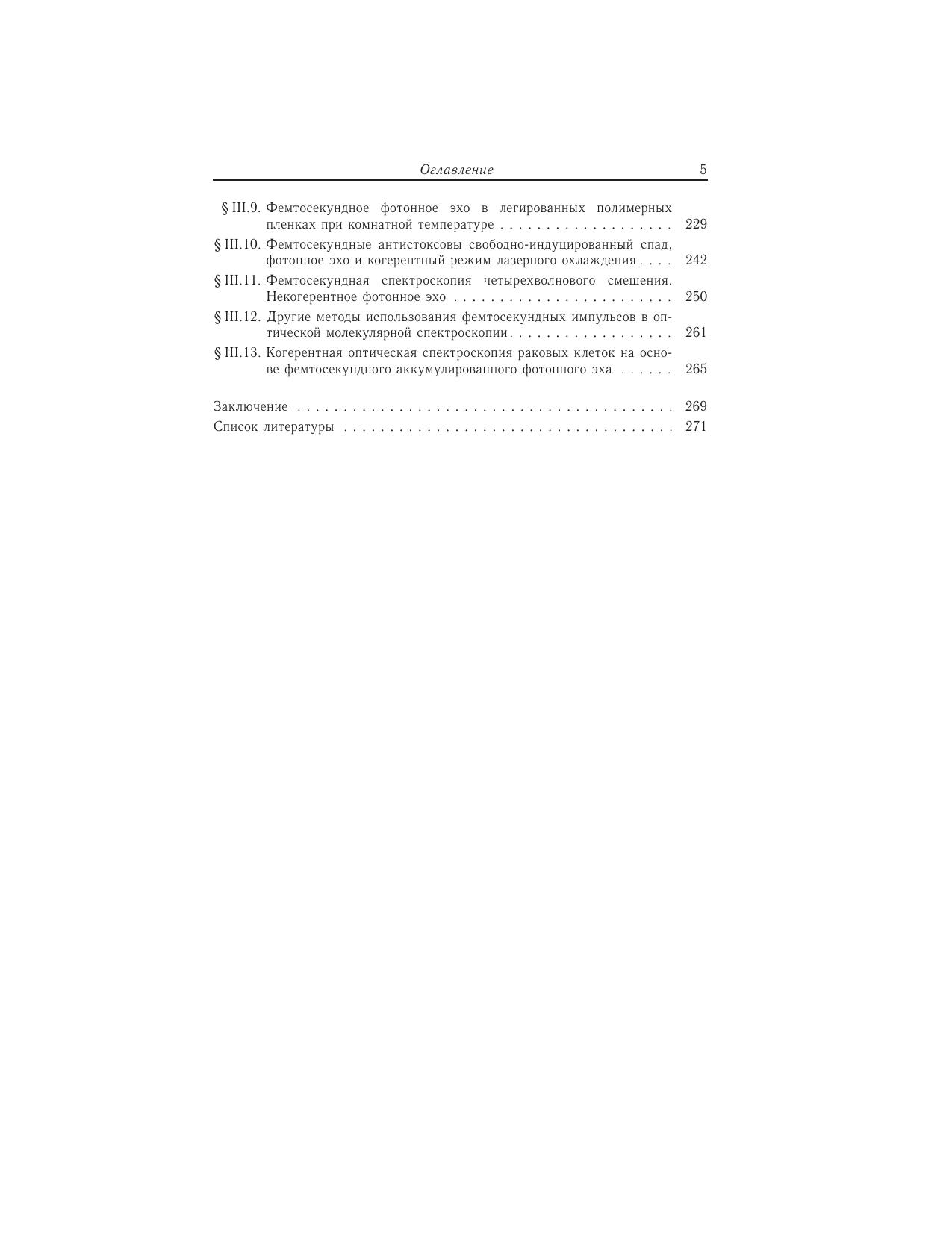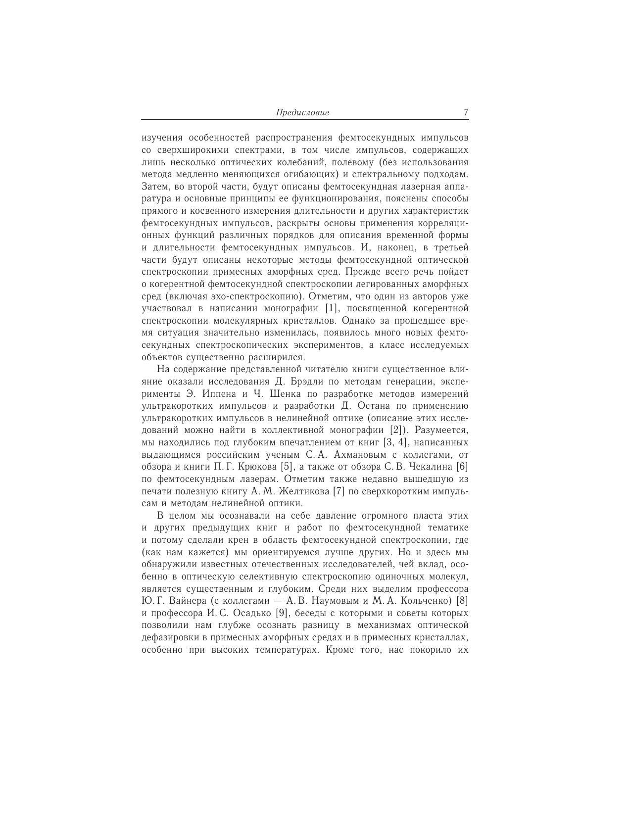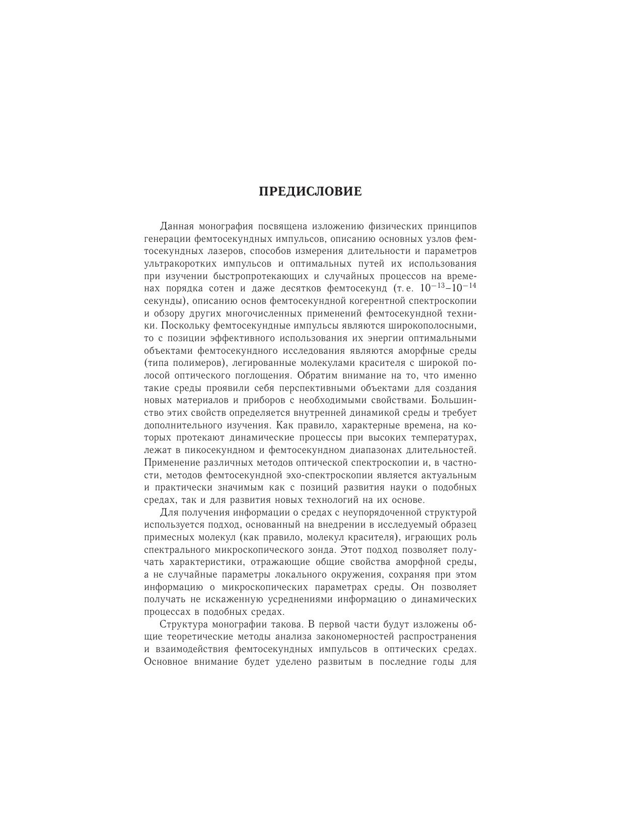 В книге рассмотрены современные теоретические методы фемтосекундной оптики, излагаются физические принципы функционирования фемтосекундных лазеров с длительностью импульсов излучения порядка 10^ - 13-10^ - 14 секунды, а также применения таких лазеров для изучения быстропротекающих и случайных процессов в аморфных средах при высоких температурах, для поиска перспективных носителей информации оптических процессоров и хладагентов твердотельных оптических рефрижераторов, для использования фемтосекундных импульсов в устройствах квантового счета. Значительное место уделяется основам фемтосекундной эхо-спектроскопии неупорядоченных молекулярных твердотельных сред. Для специалистов в области когерентной и квантовой оптики. Может служить учебным пособием для чтения лекций по одноименному курсу студентам, магистрантам и аспирантам физических факультетов государственных университетов и технических вузов, специализирующихся в подготовке специалистов по современным лазерным и информационным технологиям.
