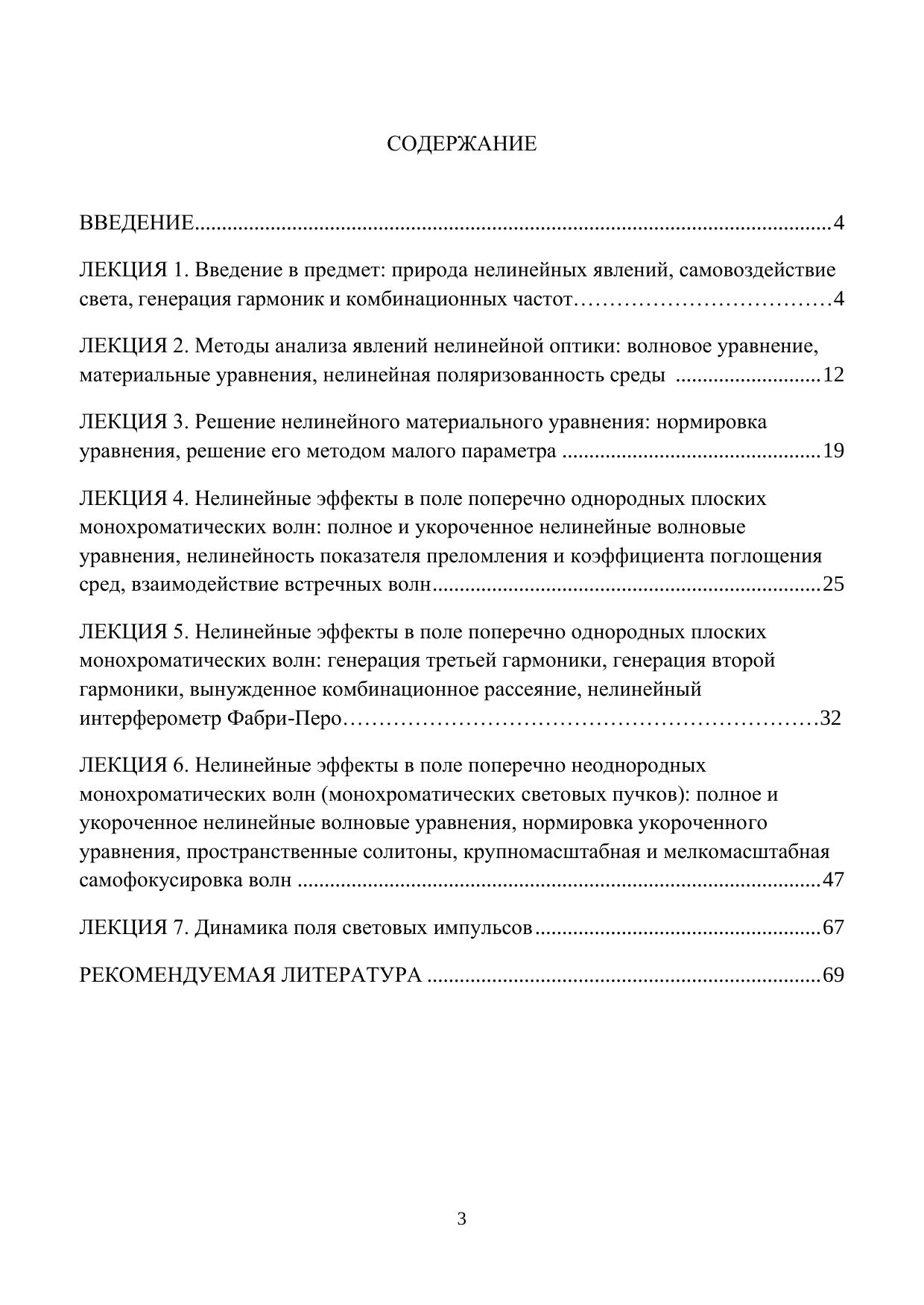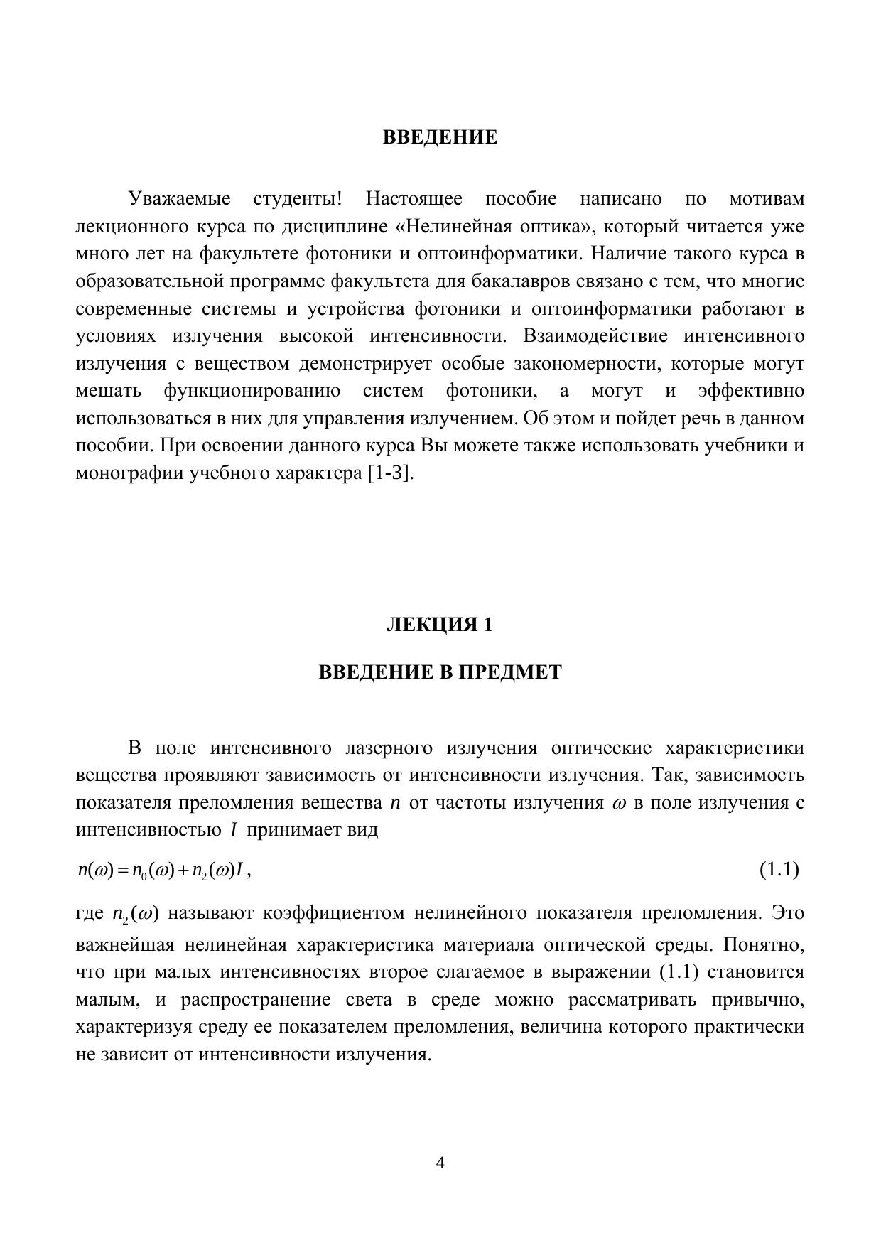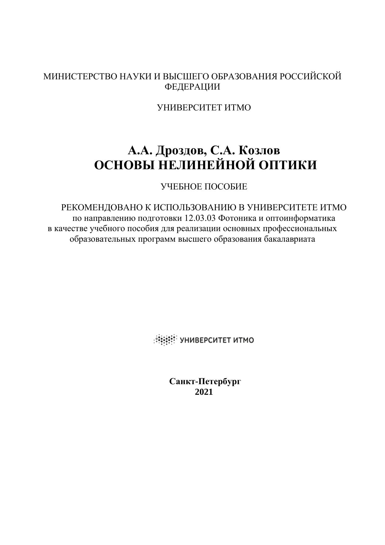 В данном учебном пособии рассматривается природа зависимости оптических характеристик вещества от интенсивности излучения. Обрисованы такие эффекты самовоздействия света, как самофокусировка и самодефокусировка световых пучков, самосжатие и самоуширение световых импульсов, генерация гармоник и комбинационных частот. При этом рассмотрены применения этих эффектов в системах управления оптическим излучением, в том числе разрабатываемых на факультете фотоники и оптоинформатики. Предусмотрено изучение различных приближений, используемых при решении теоретических задач нелинейной оптики как при описании отклика вещества на силовое воздействие оптического поля, так и при модификации нелинейных волновых уравнений. Изучены методы нормировки нелинейных материальных и волновых уравнений и итерационные методы их решения. Сформулирован широко распространенный в нелинейной оптике метод медленно меняющихся амплитуд, выведены укороченные волновые уравнения. Продемонстрирована природа нелинейности показателя преломления и коэффициента поглощения оптических сред в интенсивных световых волнах. Рассмотрены особенности взаимодействия встречных монохроматических волн в нелинейных средах, генерации в нелинейных изотропных средах третьей гармоники, а в анизотропных средах – второй гармоники излучения. Представлен расчет нелинейного интерферометра Фабри-Перо и демонстрация его мультистабильности. Показана возможность применения этого устройства в схеме оптического транзистора.