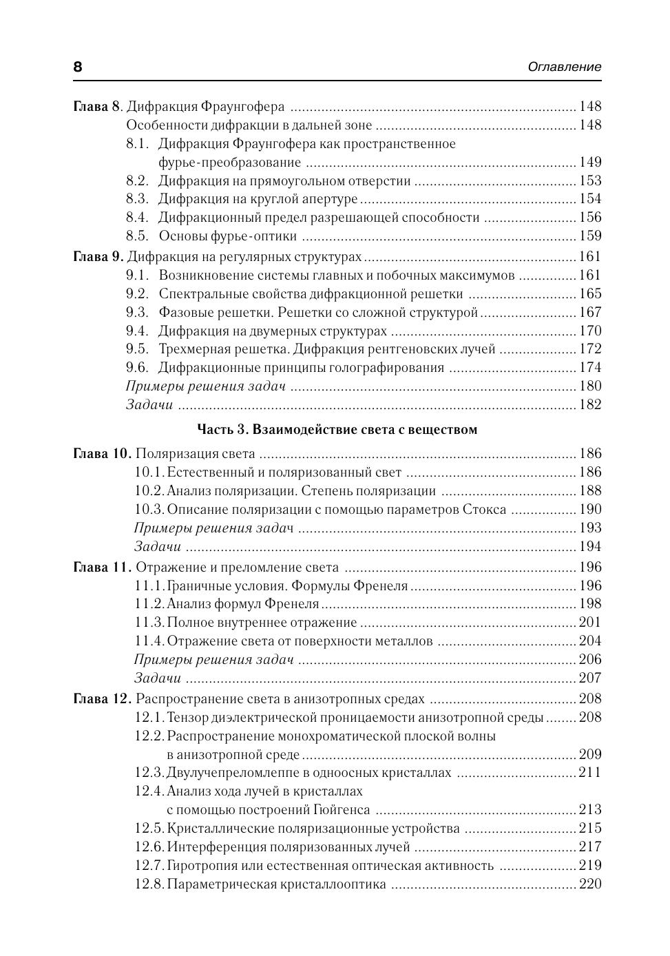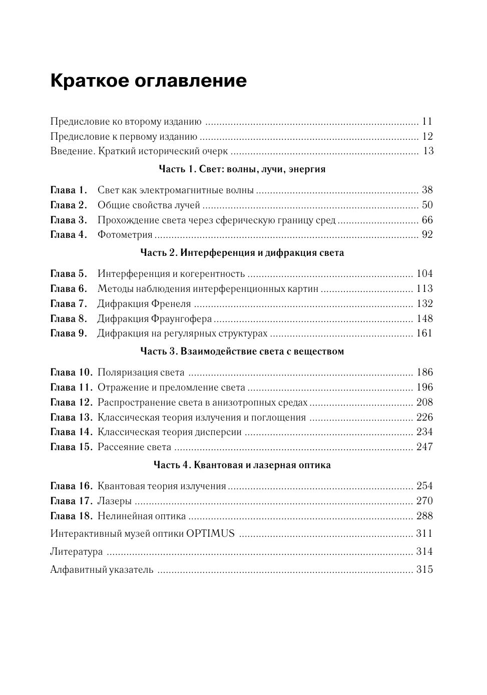 Рассмотрен широкий круг физических явлений, относящихся к различным разделам оптики. Изложены основные принципы математического описания оптических явлений, приведены примеры их практического использования. Дано представление о современных методах управления спектральными и временными параметрами излучения, применении оптических устройств в информационных системах, отражены последние достижения оптики. Приведено большое количество фотографий, полученных в реальных оптических экспериментах. Пособие предназначено для студентов высших учебных заведений, обучающихся по направлениям «Физика», «Прикладные математика и физика», «Оптотехника», «Приборостроение» и другим физическим и техническим направлениям подготовки.