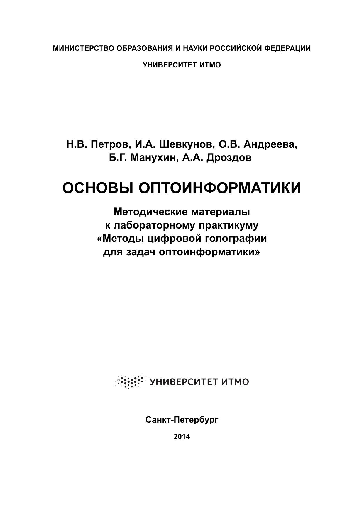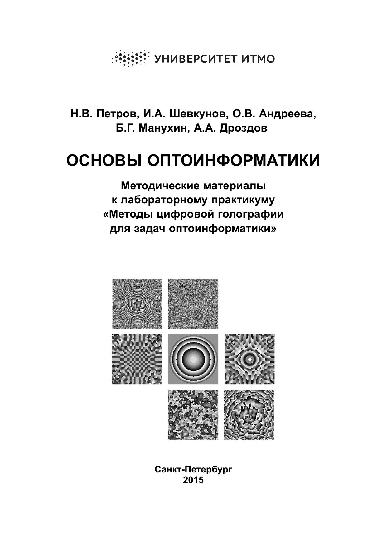 В пособии представлены учебно-методические материалы лабораторного практикума по дисциплине «Основы оптоинформатики». Даны описания лабораторных работ с кратким изложением теоретического материала. Предназначено для бакалавров и магистров, обучающихся по направлению подготовки 200700 «Фотоника и оптоинформатика».
