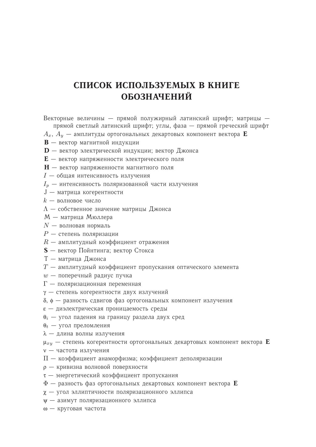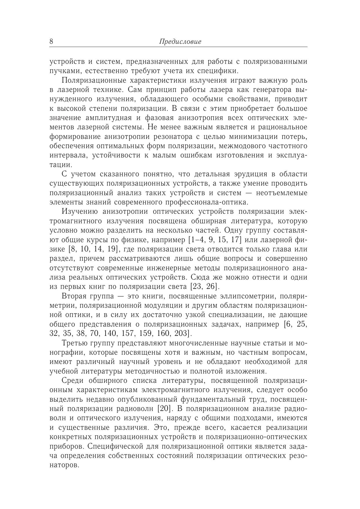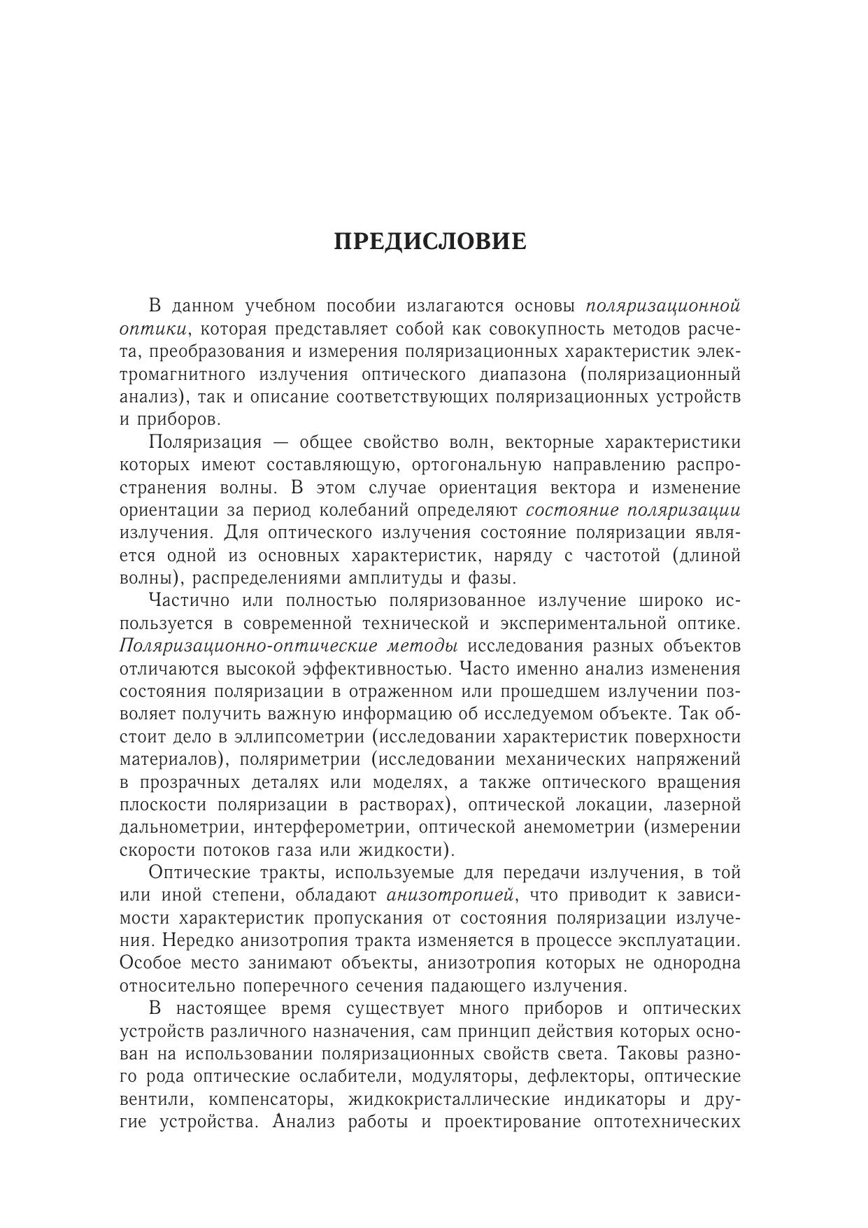 Учебное пособие посвящено основамп оляризационной оптики — новому направлению оптики, которое сформировалось в последнее время благодаря бурному развитию поляризационно-оптических приборов и применению поляризованного света в технике, биологии и медицине. Излагаются основные методы поляризационного анализа, которые позволяют решать задачи трансформации состояния поляризации анизотропным оптическим трактом с учетом деполяризующих факторов, а также определять поляризационные характеристики оптических резонаторов. Подробно описаны поляризаторы, фазовые пластинки, оптические вращатели, компенсаторы и другие поляризационные устройства. Книга содержит множество примеров, имеющих прикладное значение. Впервые подробно рассмотрены поляризационные аберрации излучения.Пособие предназначено студентамс пециальности «Квантовая и оптическая электроника», а также других оптических специальностей технических университетов. Книга будет также полезна специалистам, работающим в области технической поляризационной оптики.