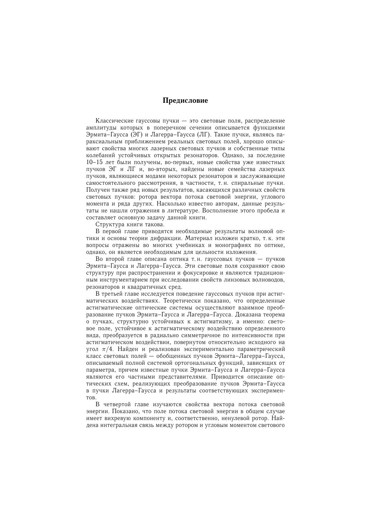 Книга является введением в современную оптику гауссовых пучков и затрагивает широкий круг вопросов, связанных с формированием и преобразованием параксиальных световых полей, обобщающих классические пучки Эрмита-Гаусса и Лагерра-Гаусса. Впервые изложена теория структурно устойчивых световых полей, вращающихся при распространении. Рассмотрен ряд вопросов практического использования гауссовых пучков для задач лазерной фокусировки и манипуляций микрочастицами. Методы, применяемые в книге при решении оптических задач, могут оказаться полезными для решения других задач, где используются специальные функции математической физики. Книга рассчитана на специалистов в области когерентной оптики и лазерных технологий, а также студентов соответствующих. специальностей.