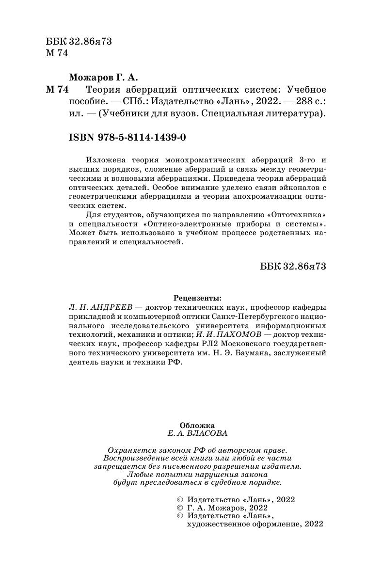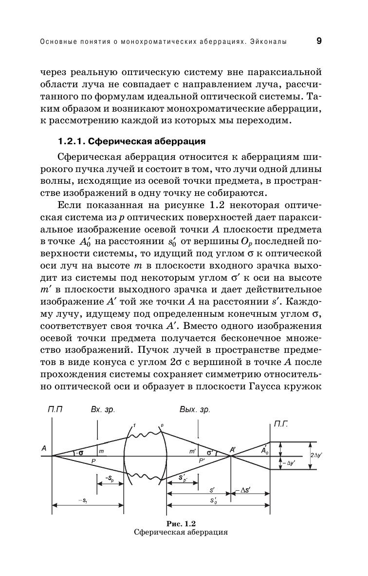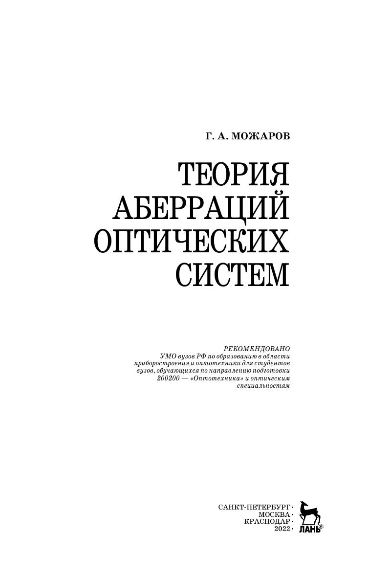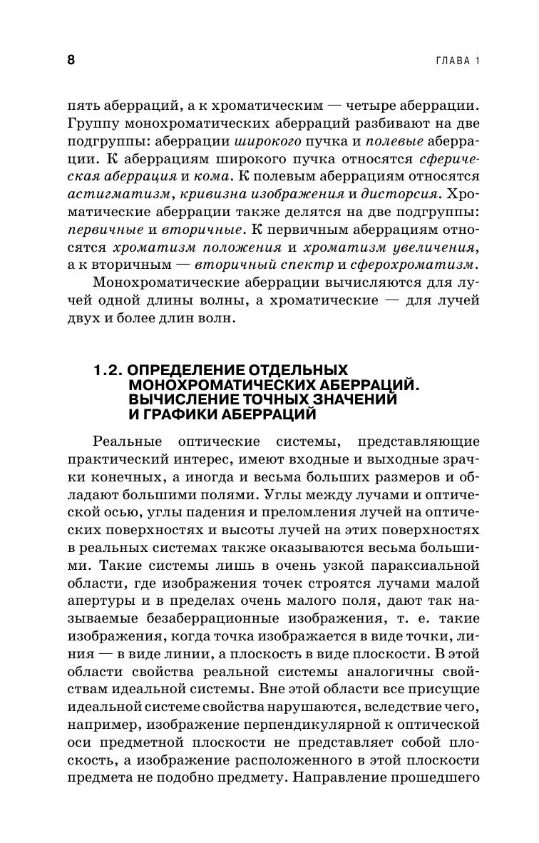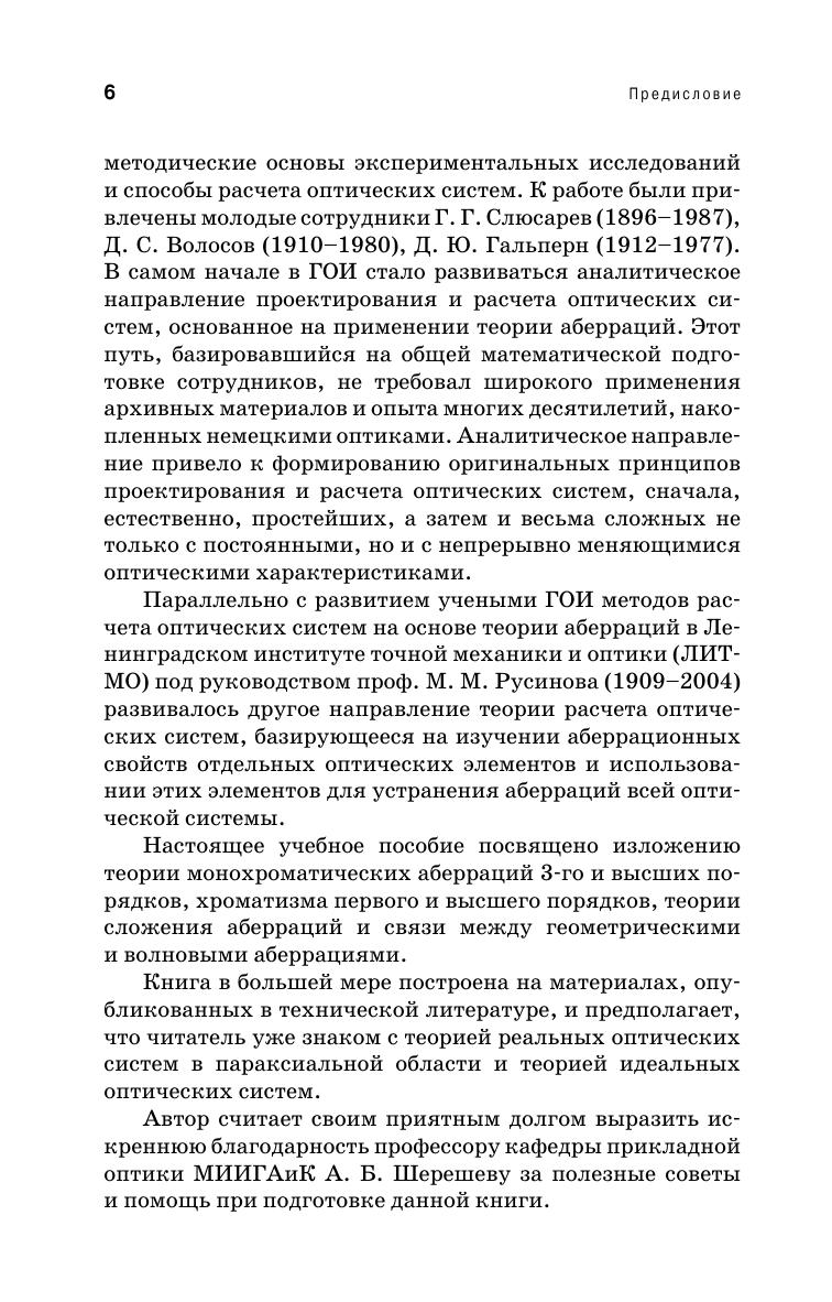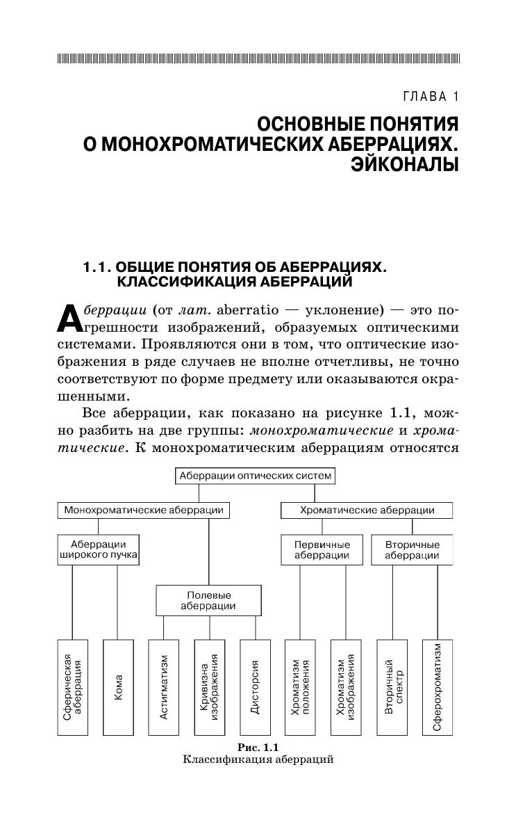 Изложена теория монохроматических аберраций 3-го и высших порядков, сложение аберраций и связь между геометрическими и волновыми аберрациями. Приведена теория аберраций оптических деталей. Особое внимание уделено связи эйконалов с геометрическими аберрациями и теории апохроматизации оптических систем. Для студентов, обучающихся по направлению «Оптотехника» и специальности «Оптикоэлектронные приборы и системы». Может быть использовано в учебном процессе родственных направлений и специальностей.